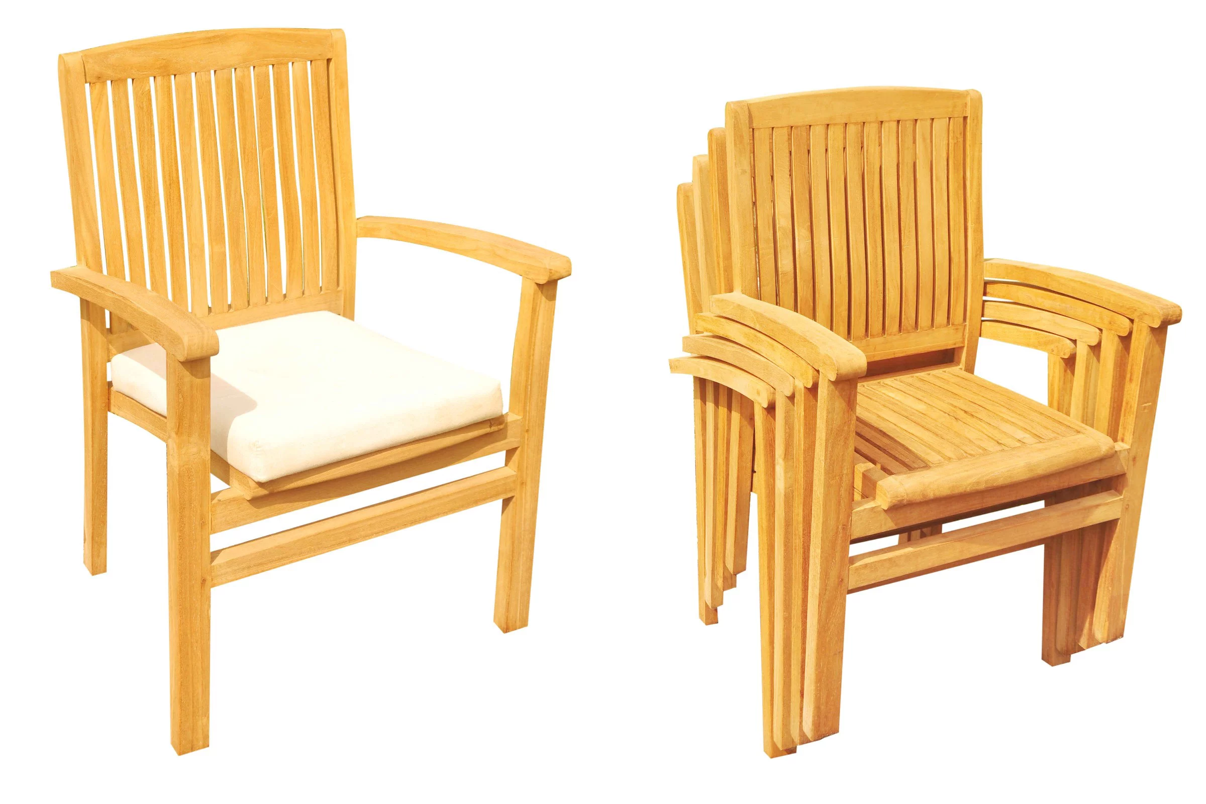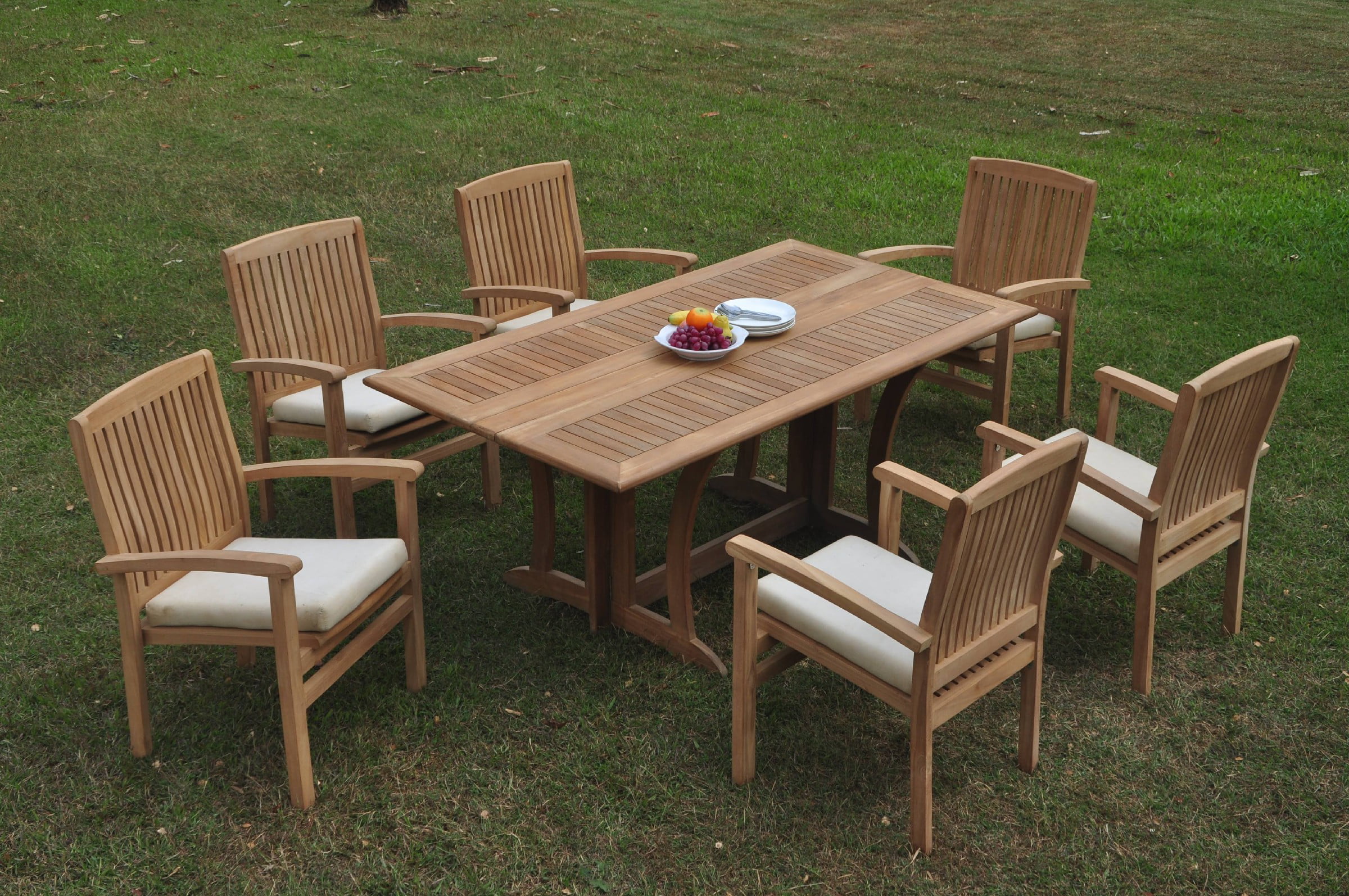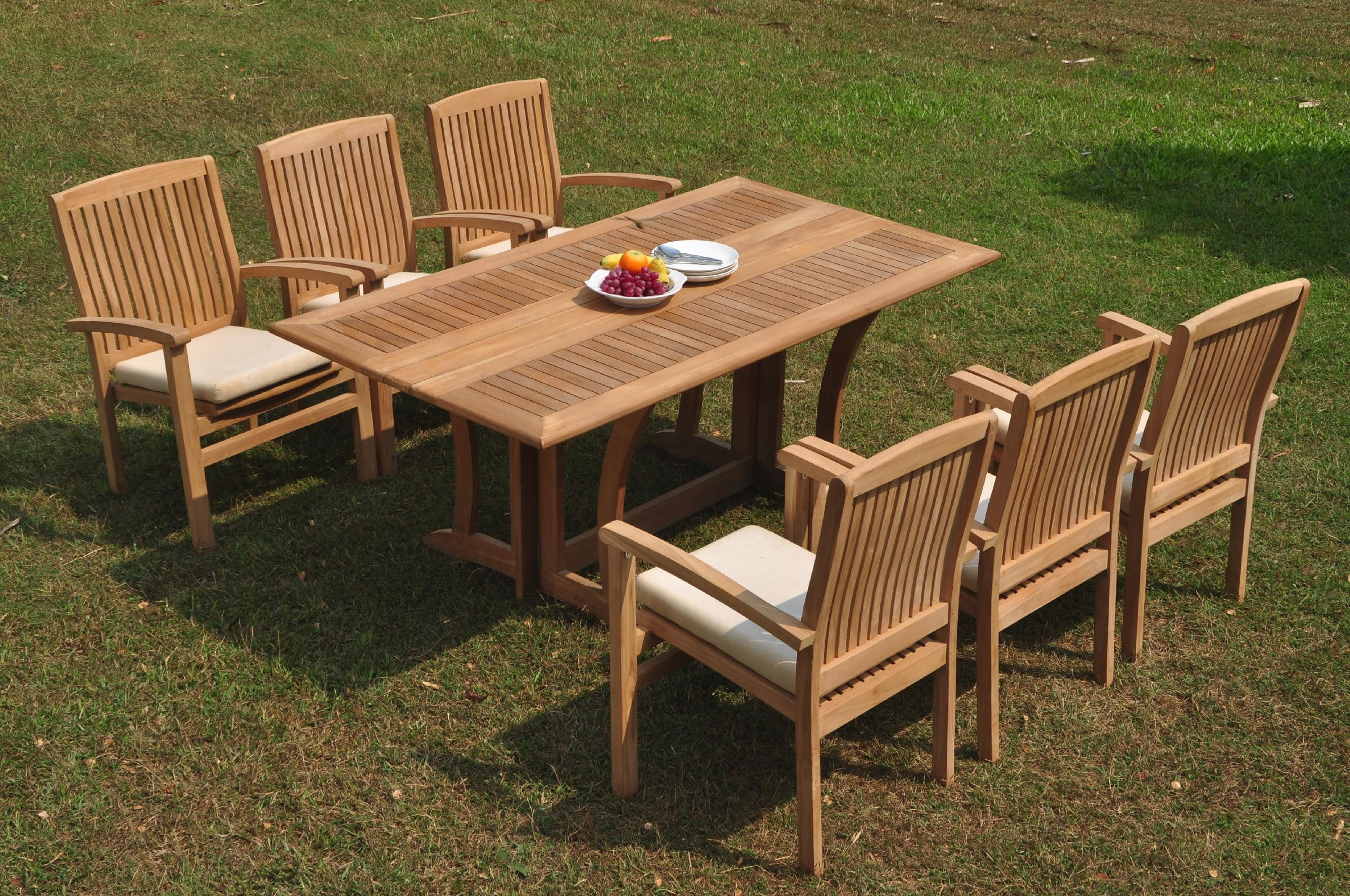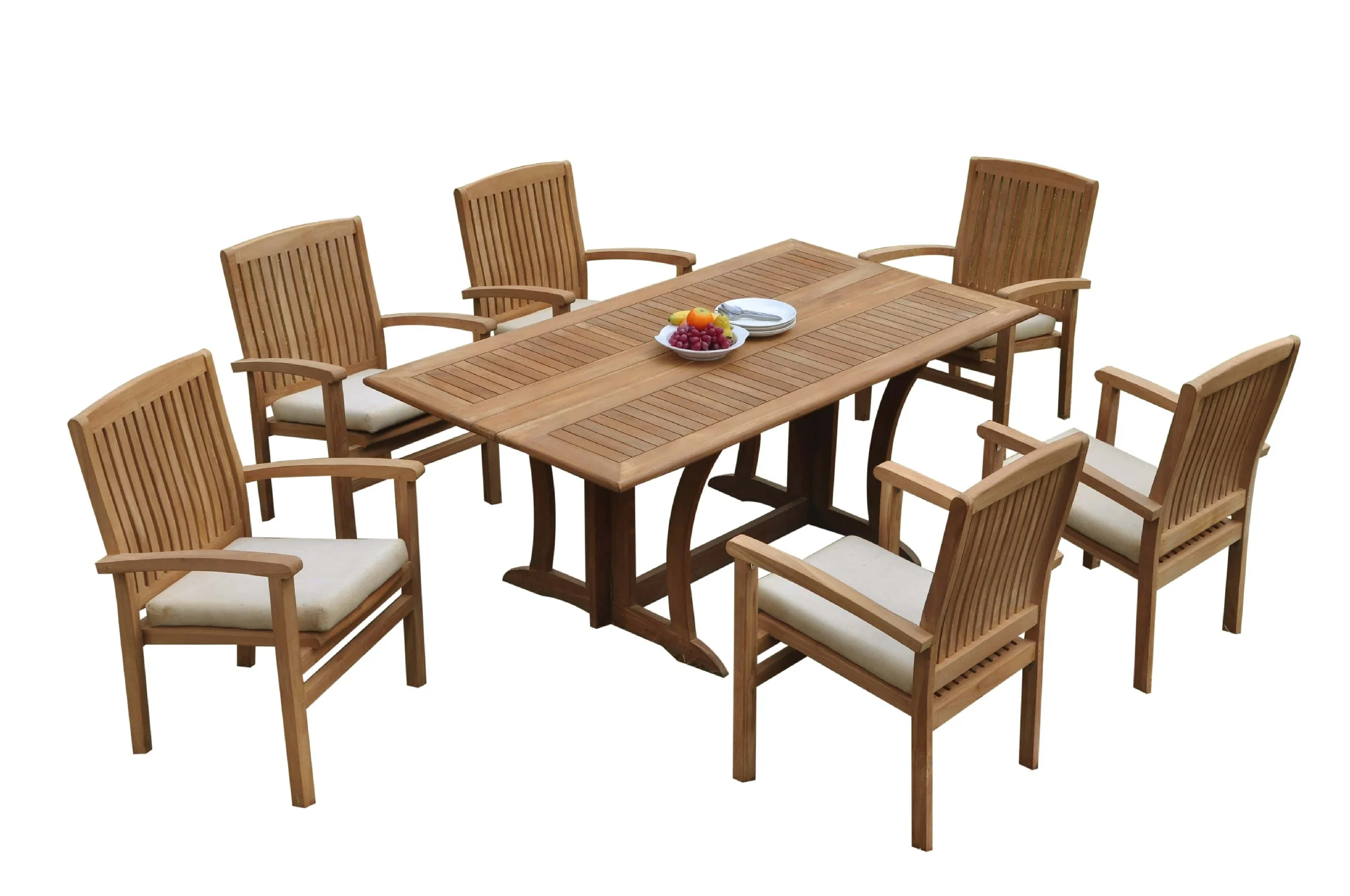 Grade-A Teak Dining Set: 6 Seater 7 Pc: Warwick Console Folding Rectangle Table And 6 Wave Stacking Arm Chairs Outdoor Patio WholesaleTeak #51WV1507