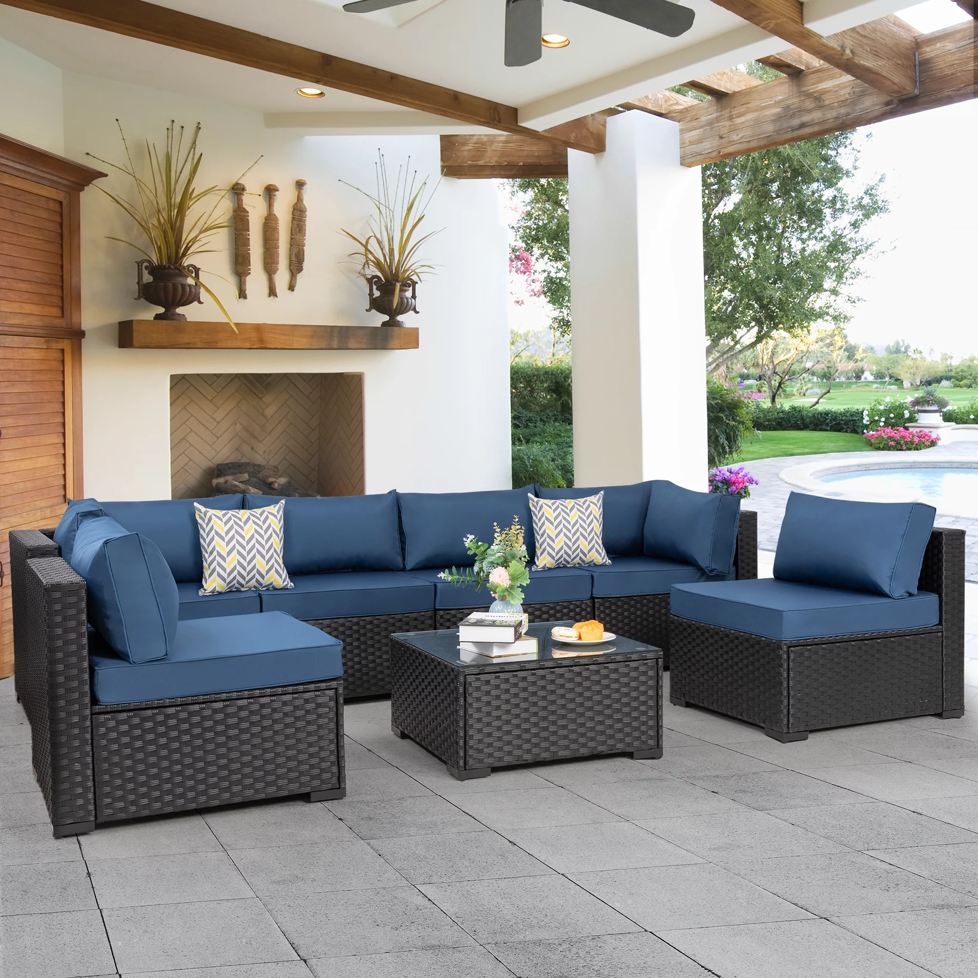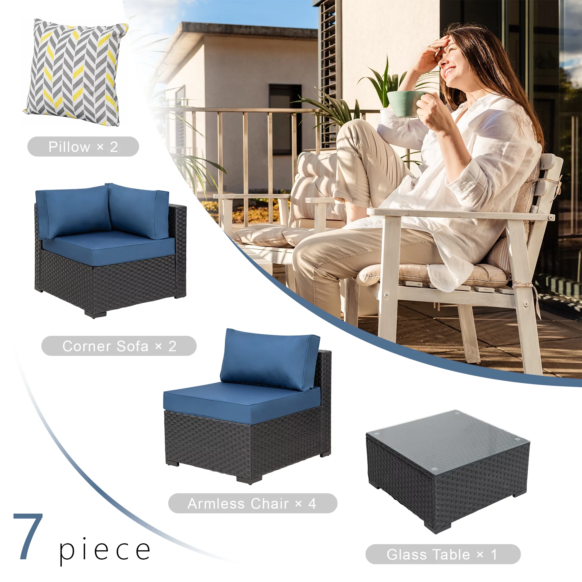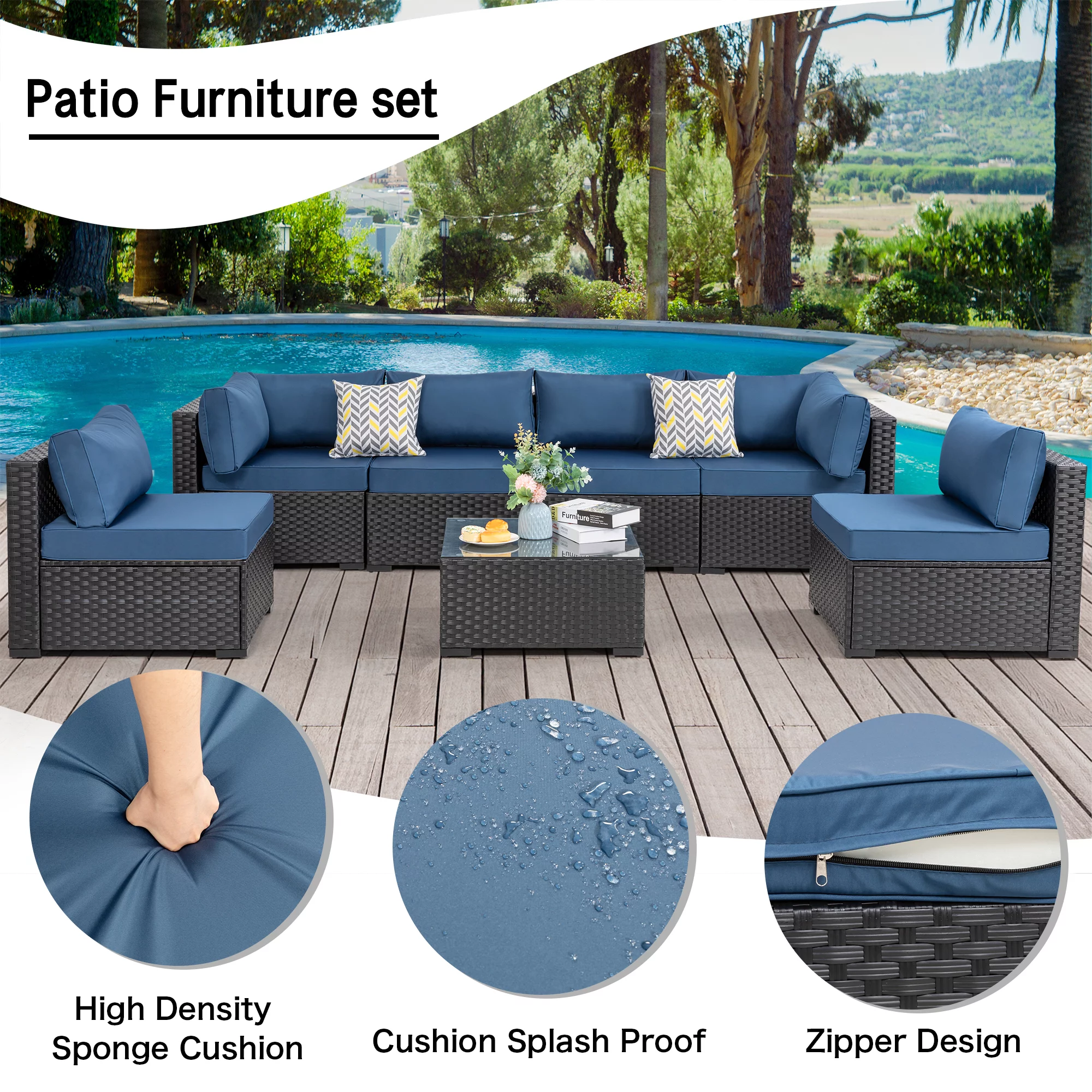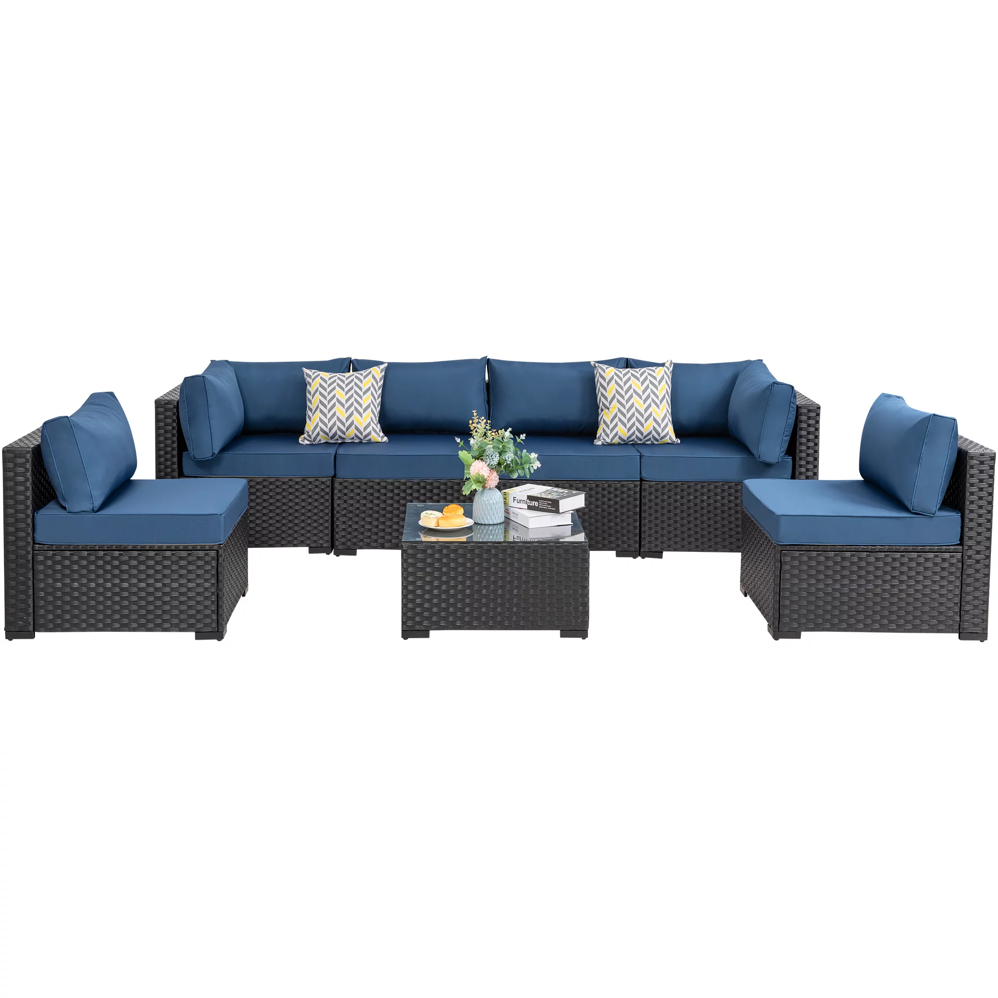 7 Pieces Outdoor Sectional Sofa Furniture Sets, All-Weather Black Wicker Patio Furniture Sets with Tea Table and Washable Couch Cushions Aegean Blue