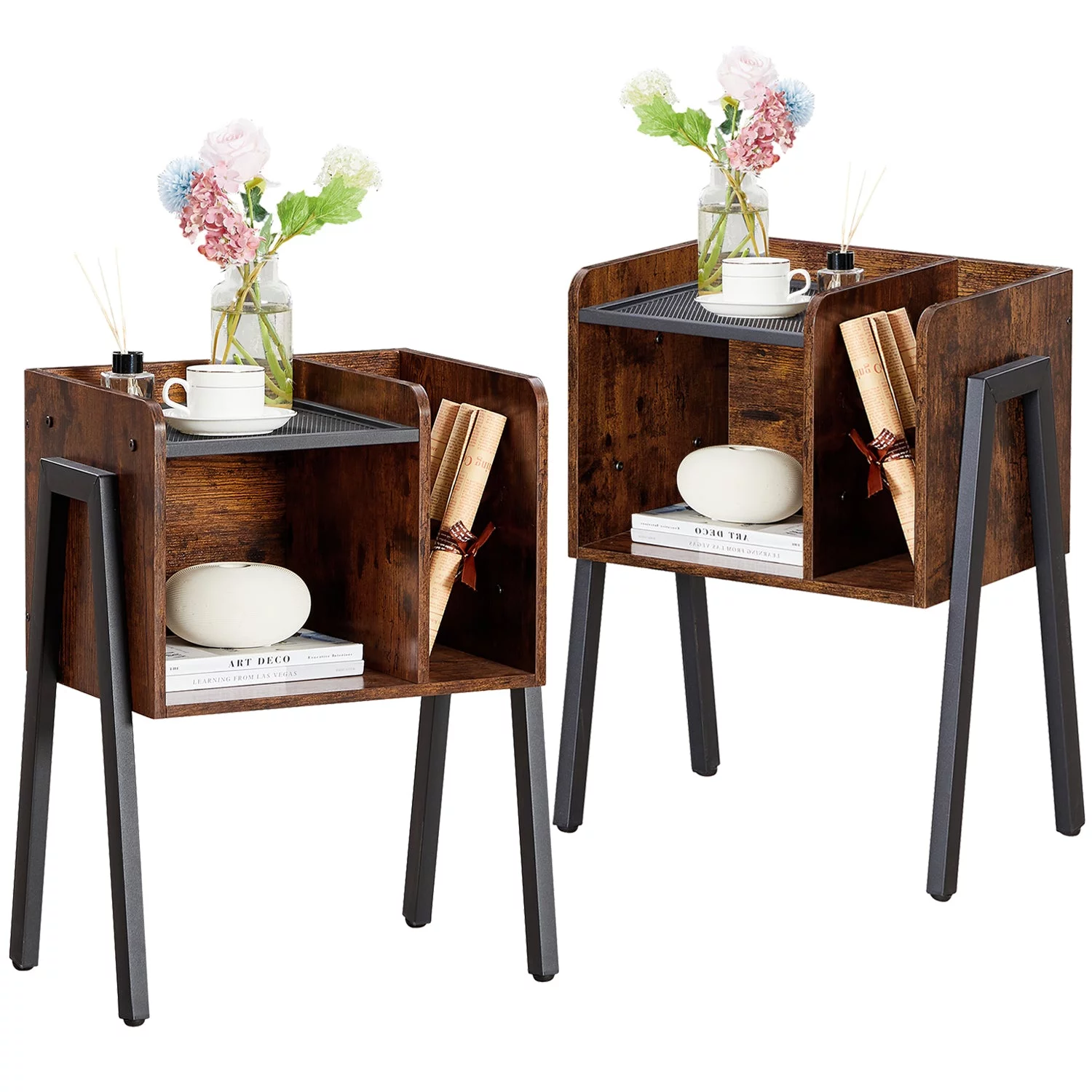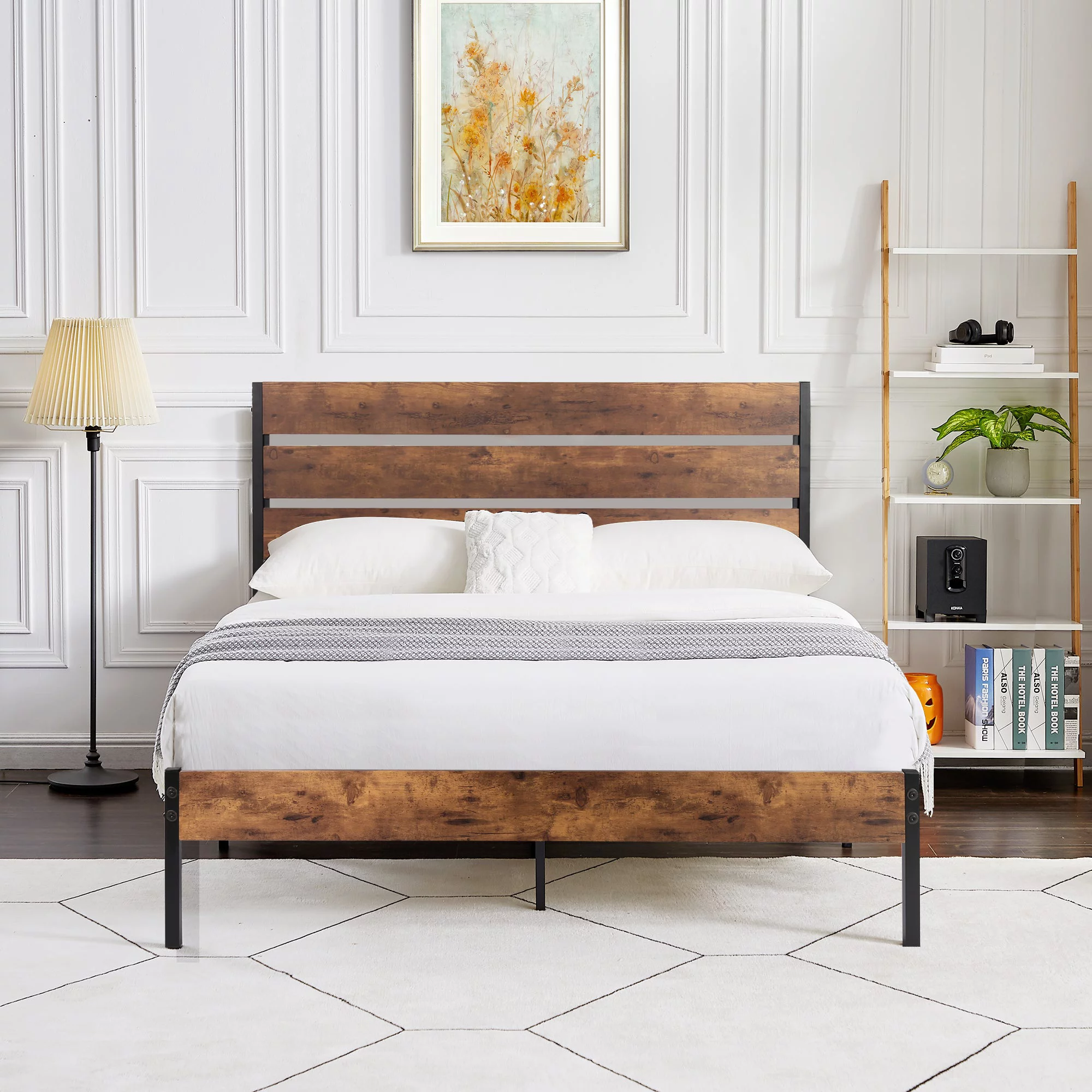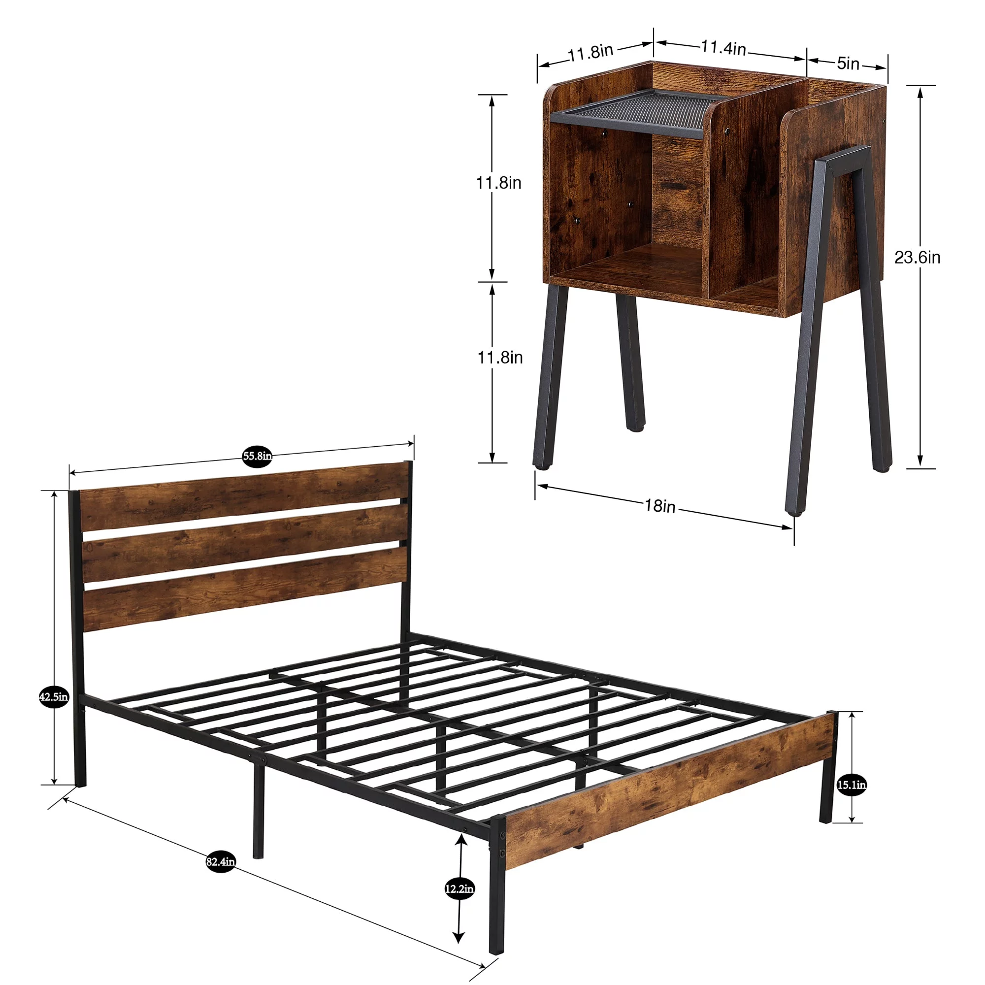 VECELO 3-Piece Bedroom Set with 2 Nightstands, Full Size Metal Bed Frame with Wooden Headboard, Brown