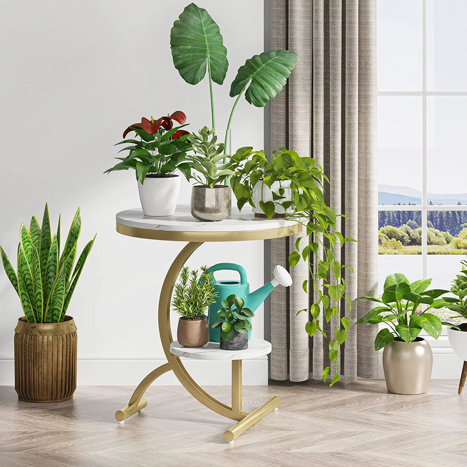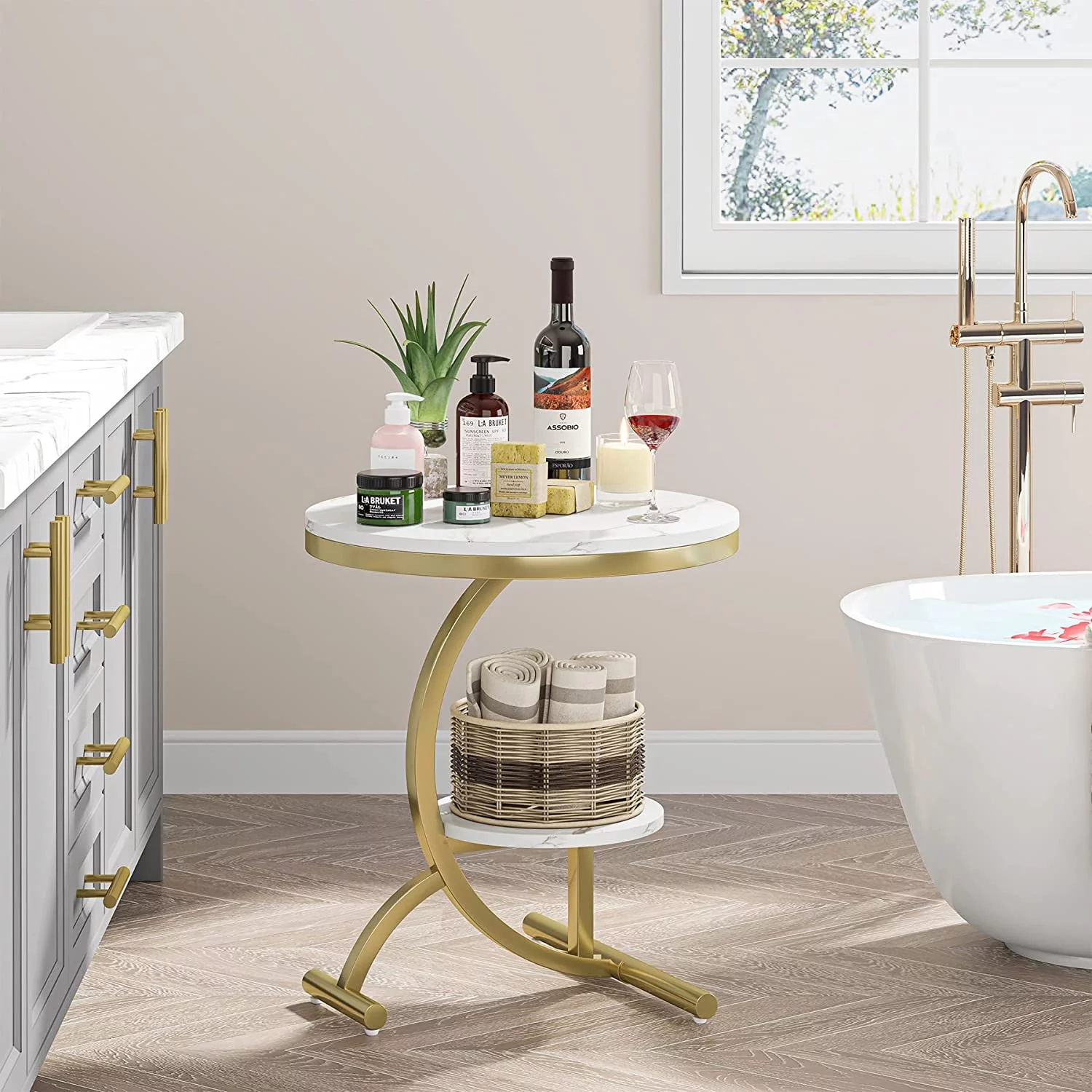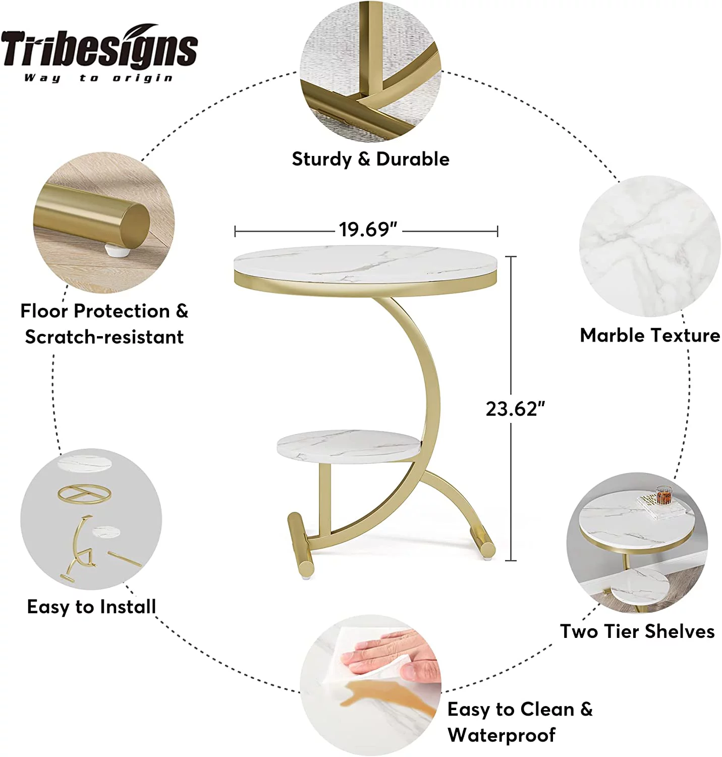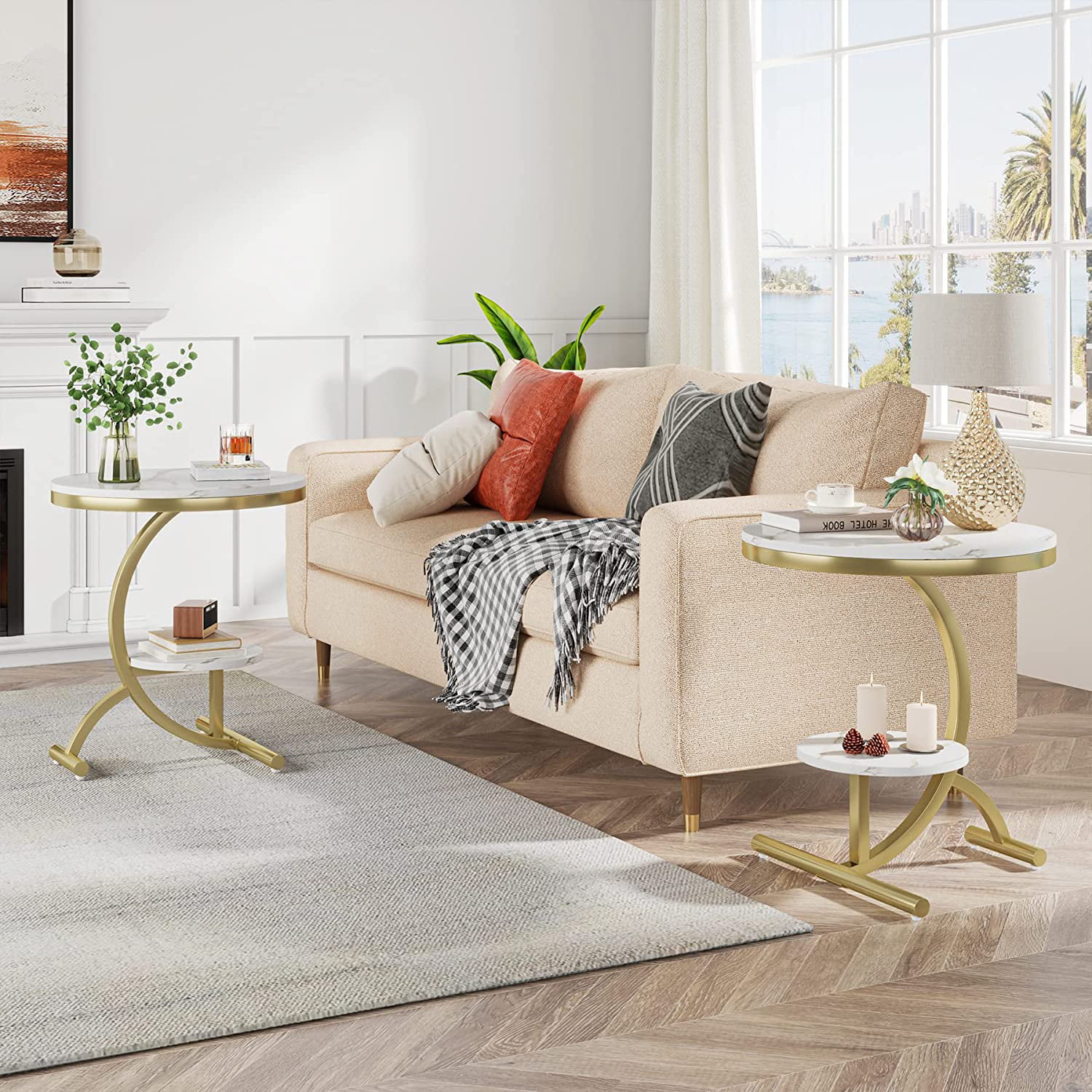 Tribesigns Faux Marble End Table, 2 Tier Round Sofa Side Table for Living Room, White & Gold
