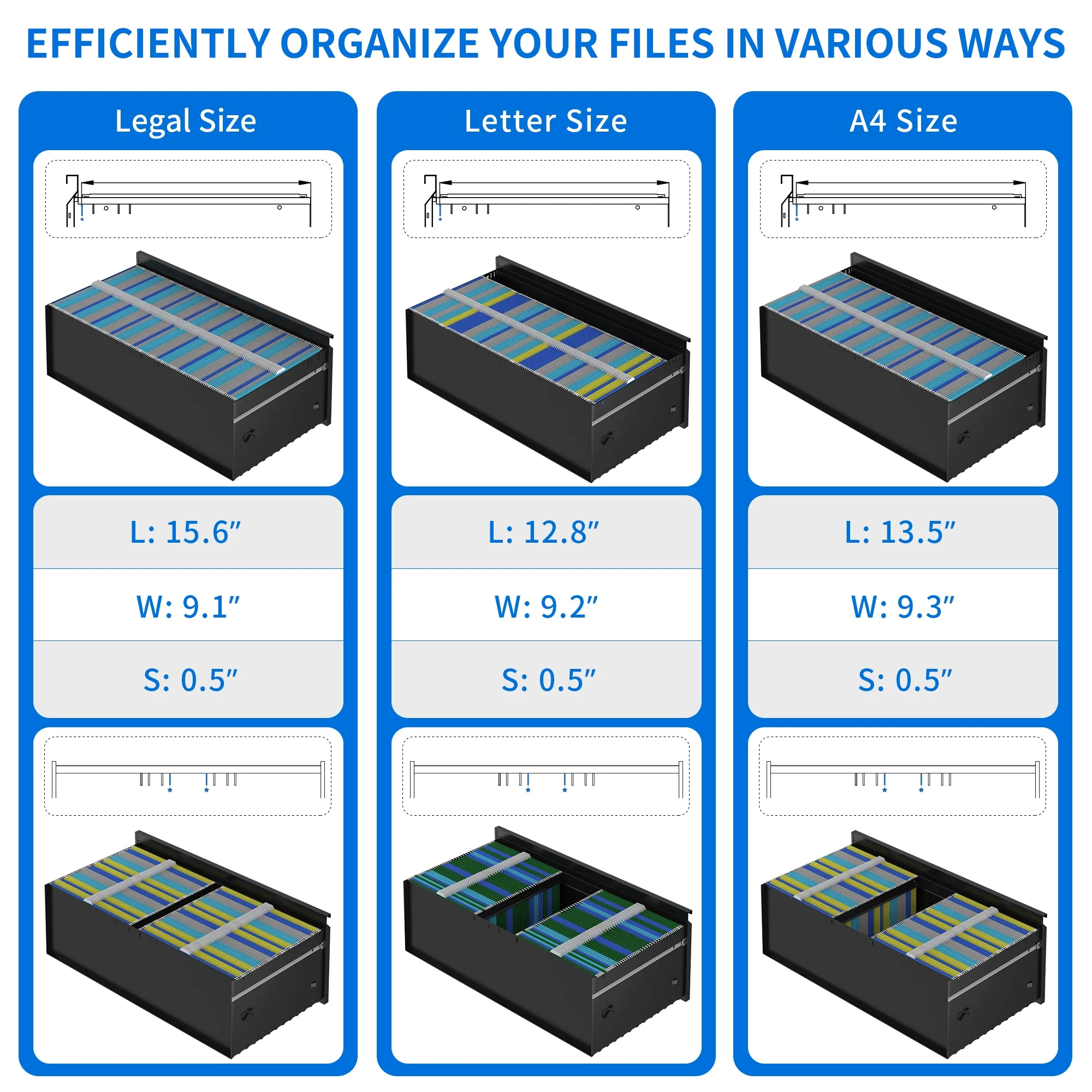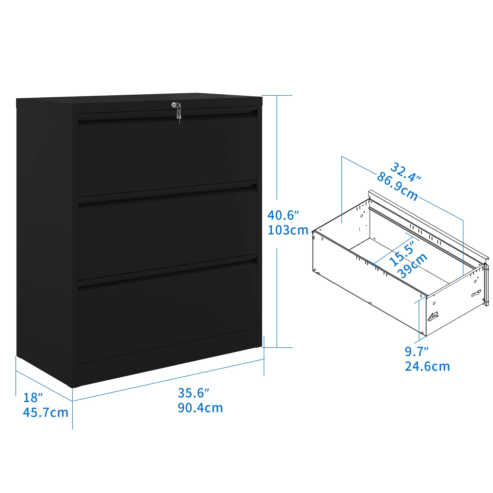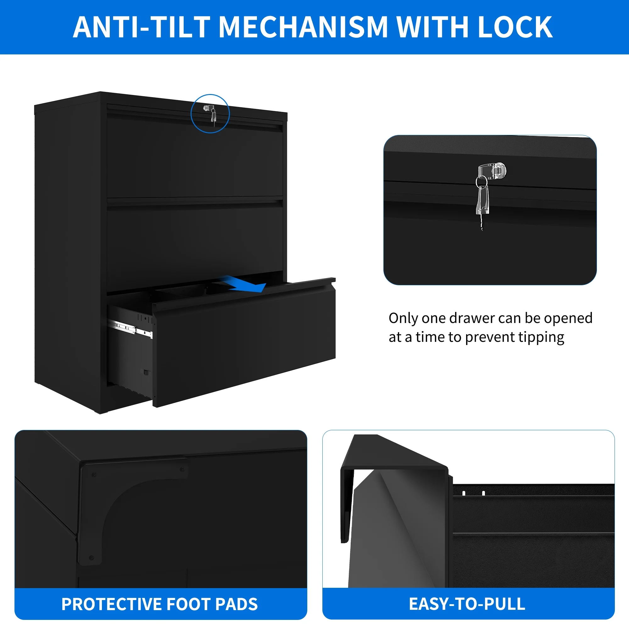 Dextrus 3 Drawer Lateral File Cabinet with Lock, Metal Stainless Steel Wide Lateral Filing Cabinet for Legal/Letter A4 Size, Office Organizer Storage Cabinet, Black