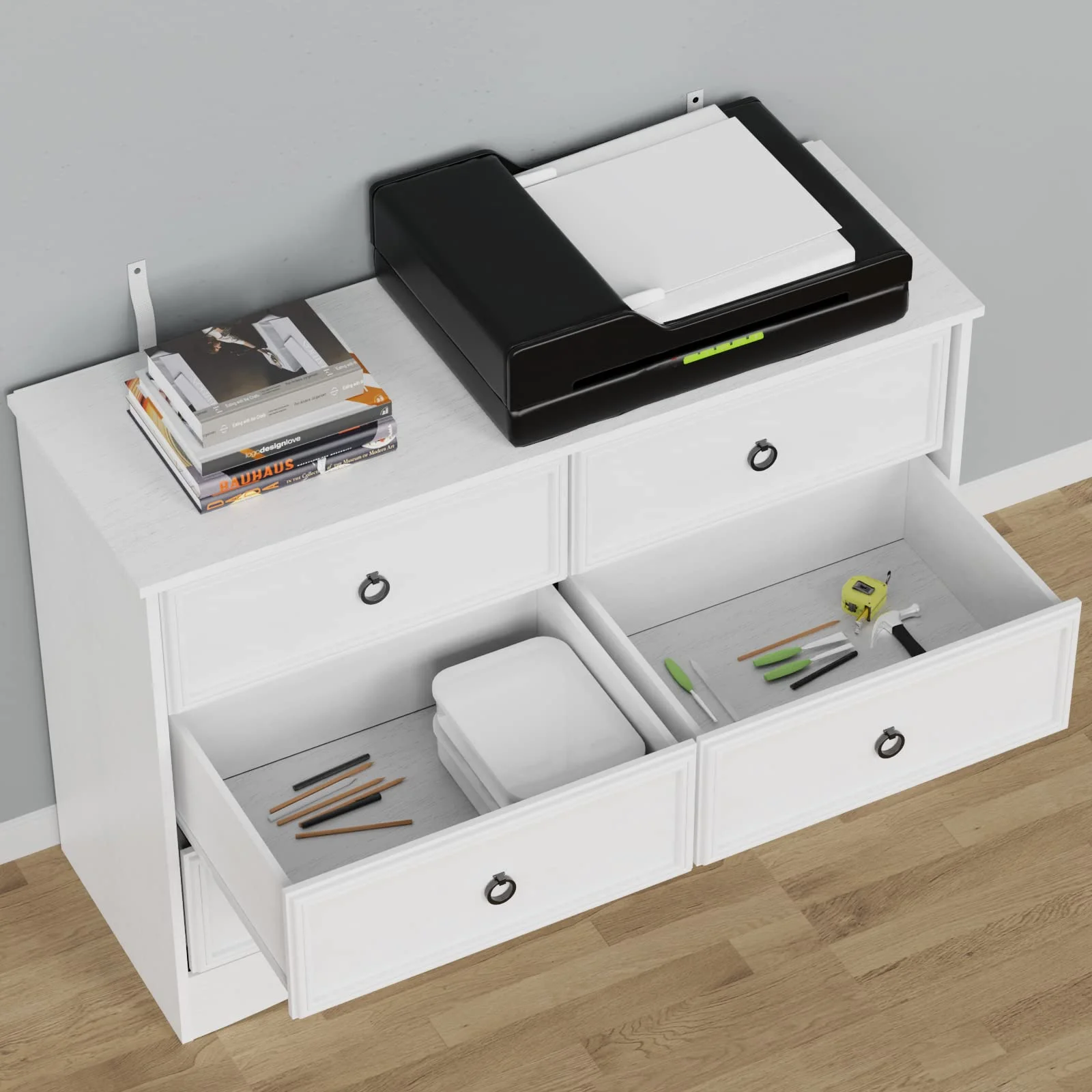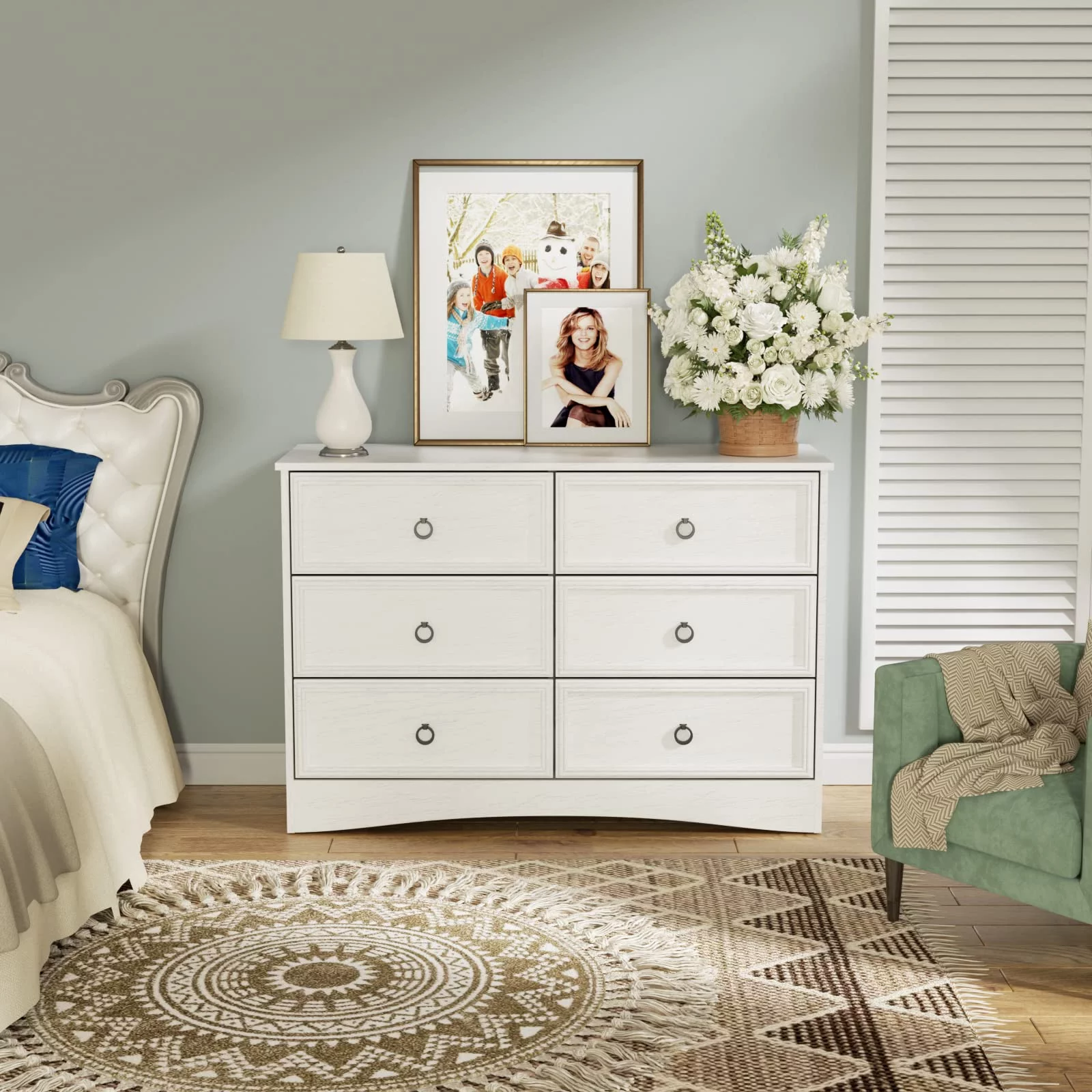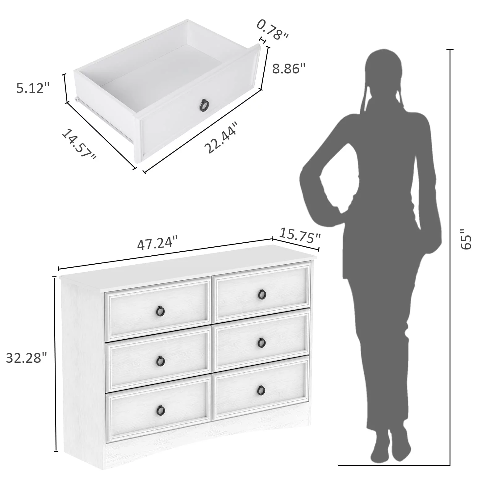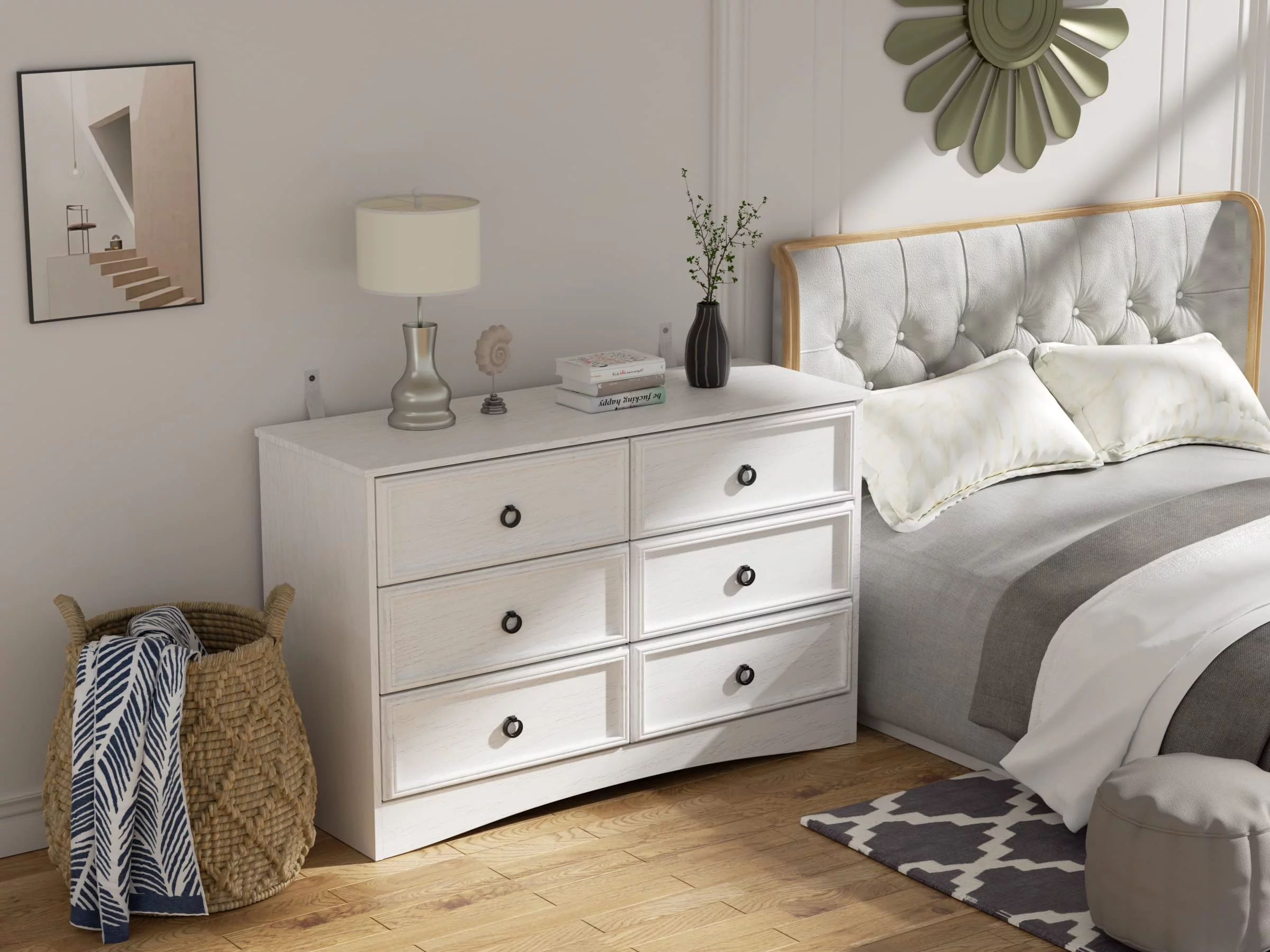 Duerer 6 Drawer White Double Dresser, Wood Horizontal Cabinet Dresser Chest of Drawers for Bedroom, Living Room