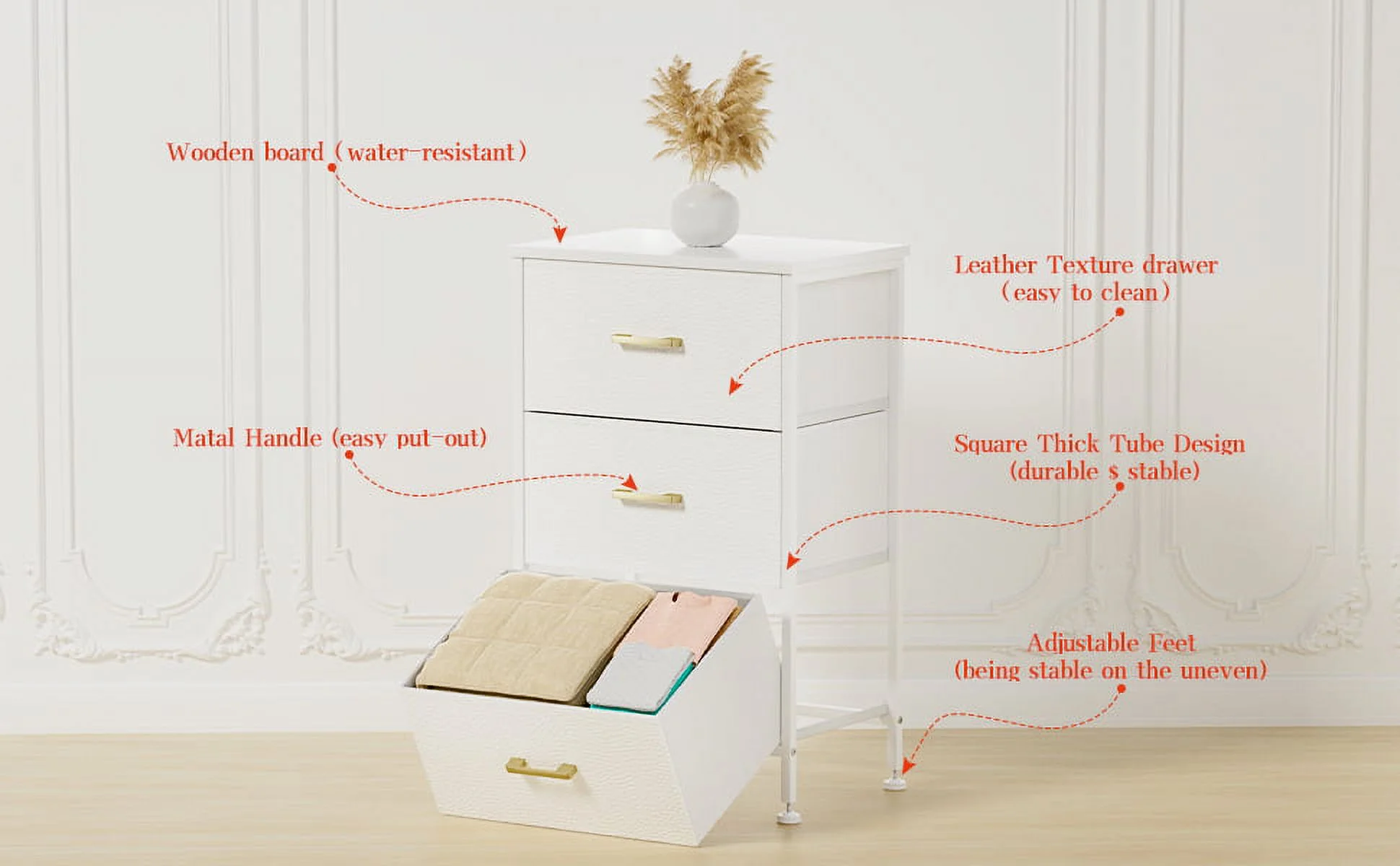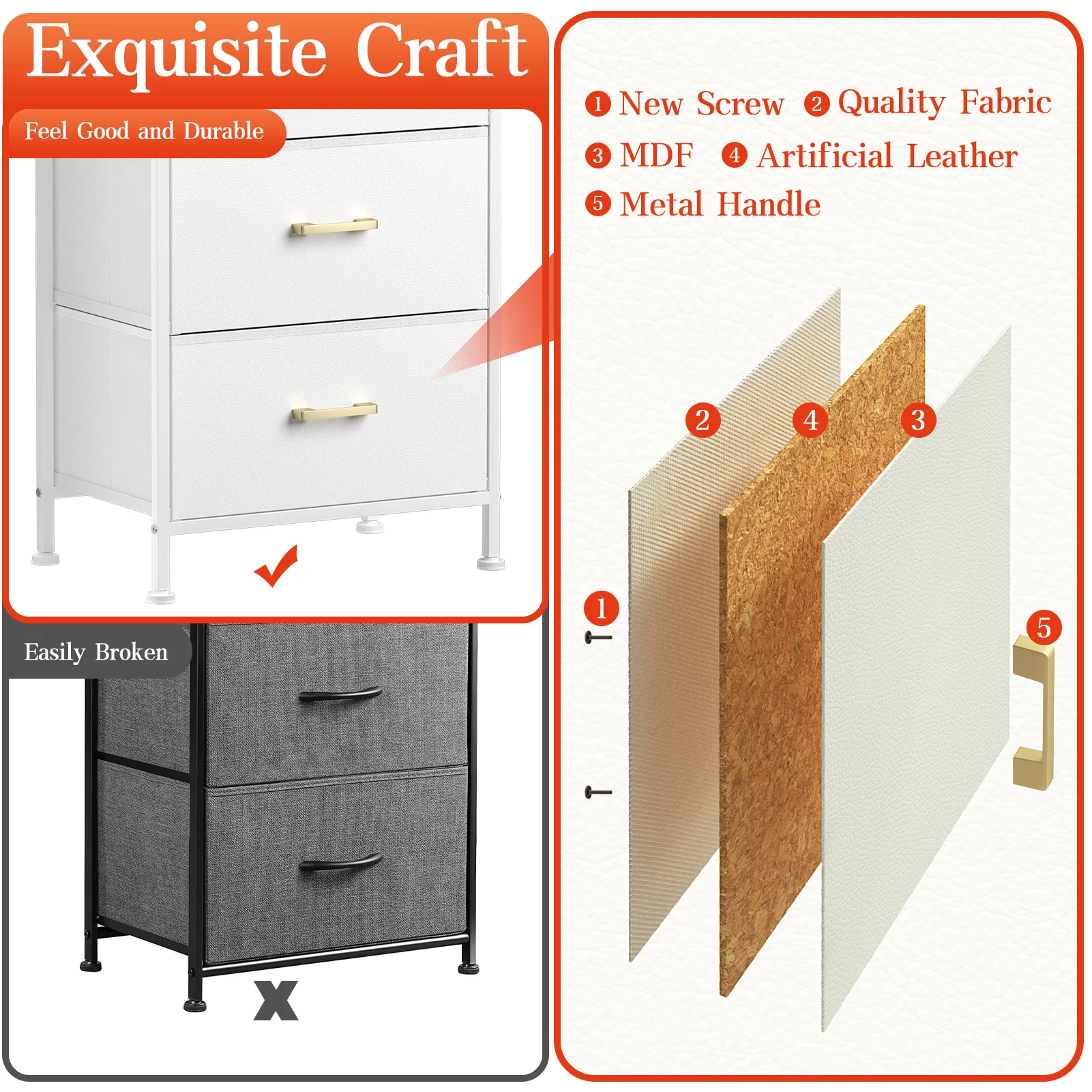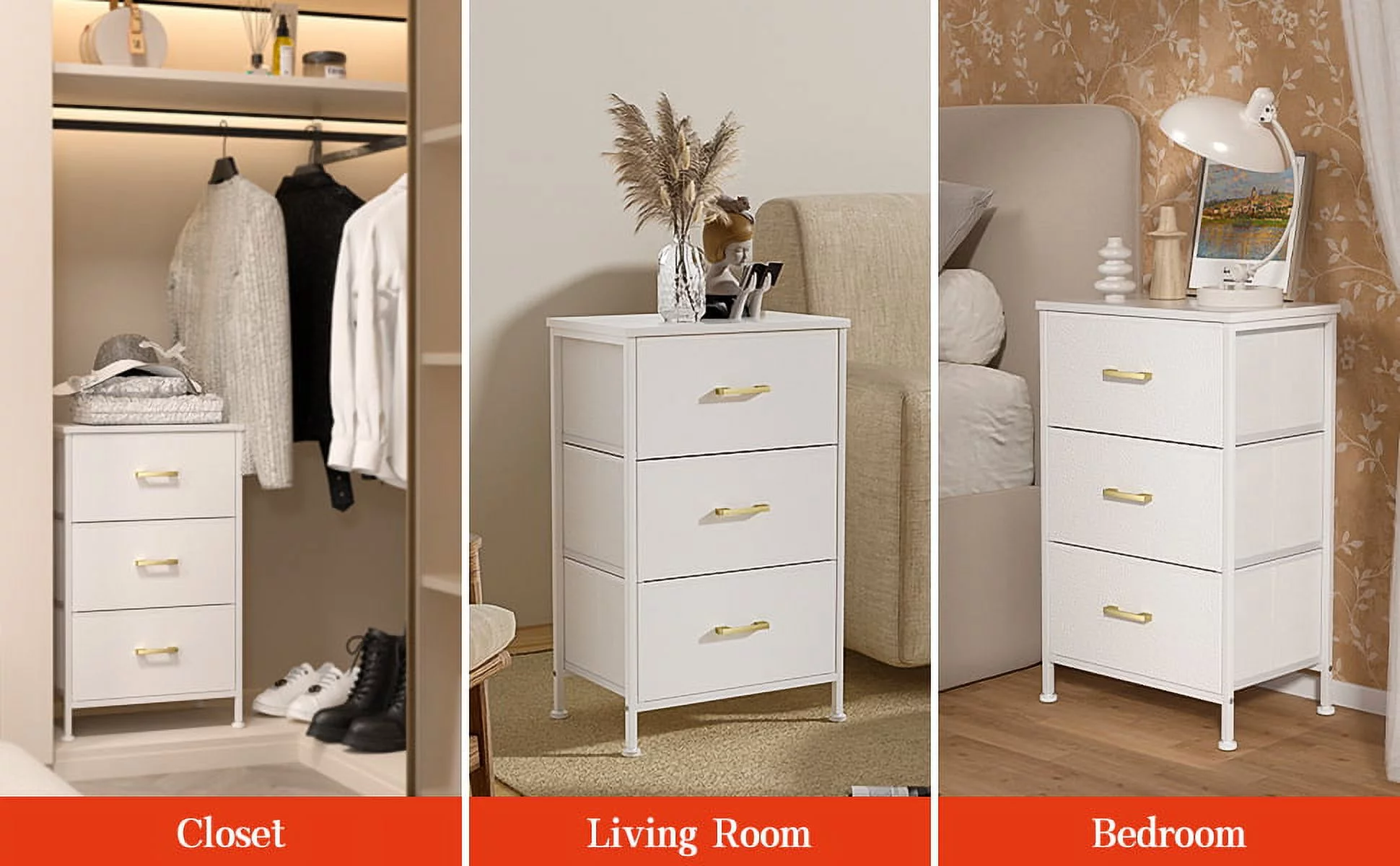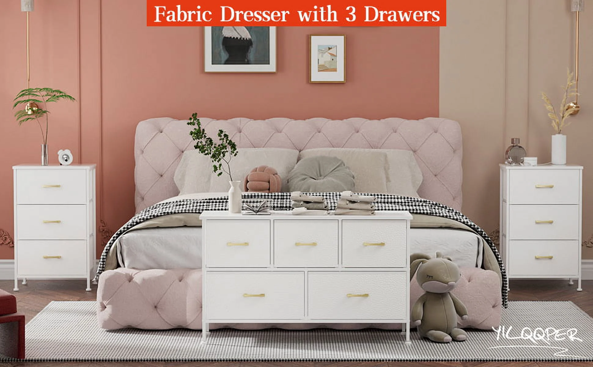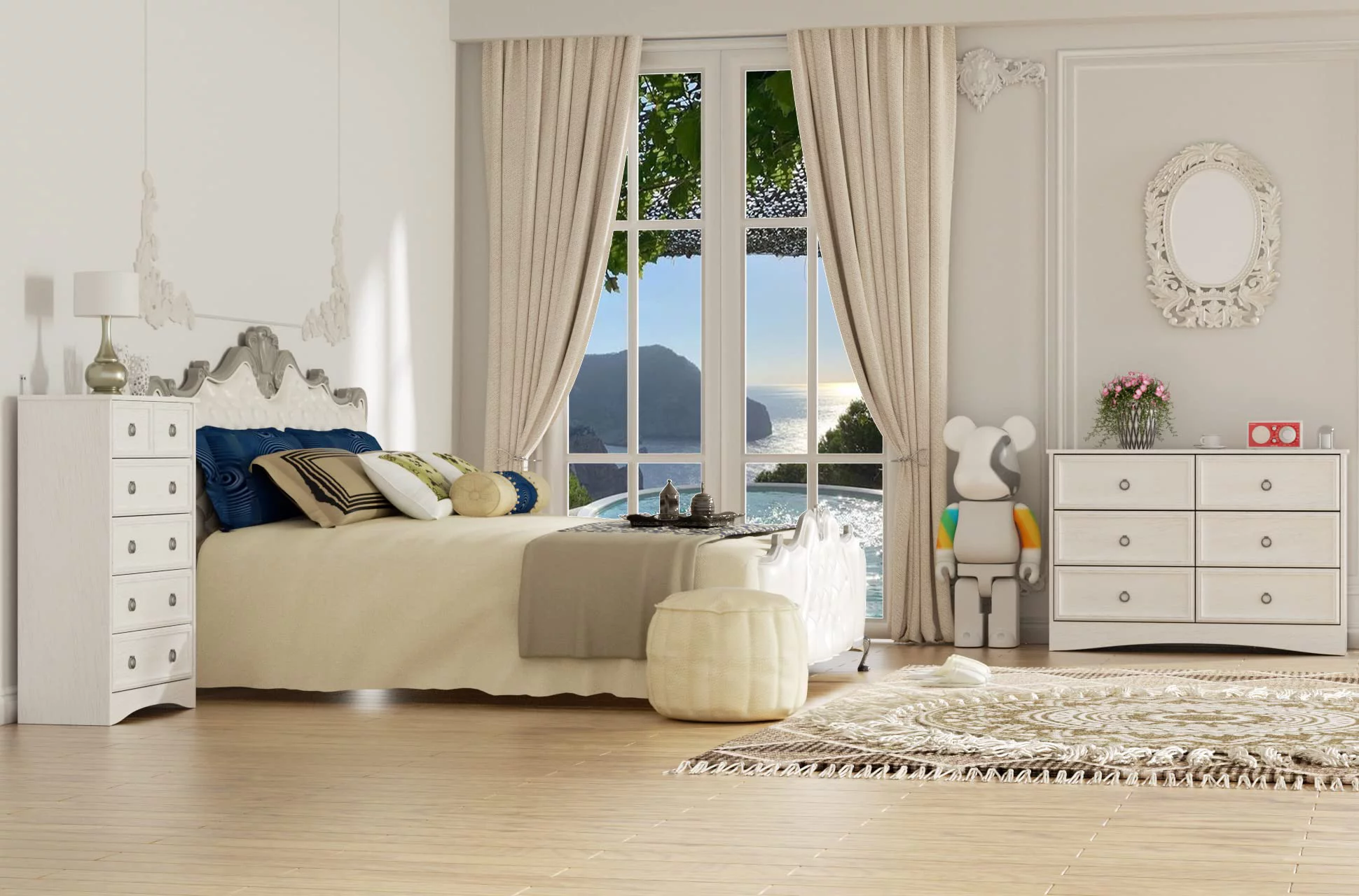 Duerer 6 Drawer White Double Dresser, Wood Horizontal Cabinet Dresser Chest of Drawers for Bedroom, Living Room