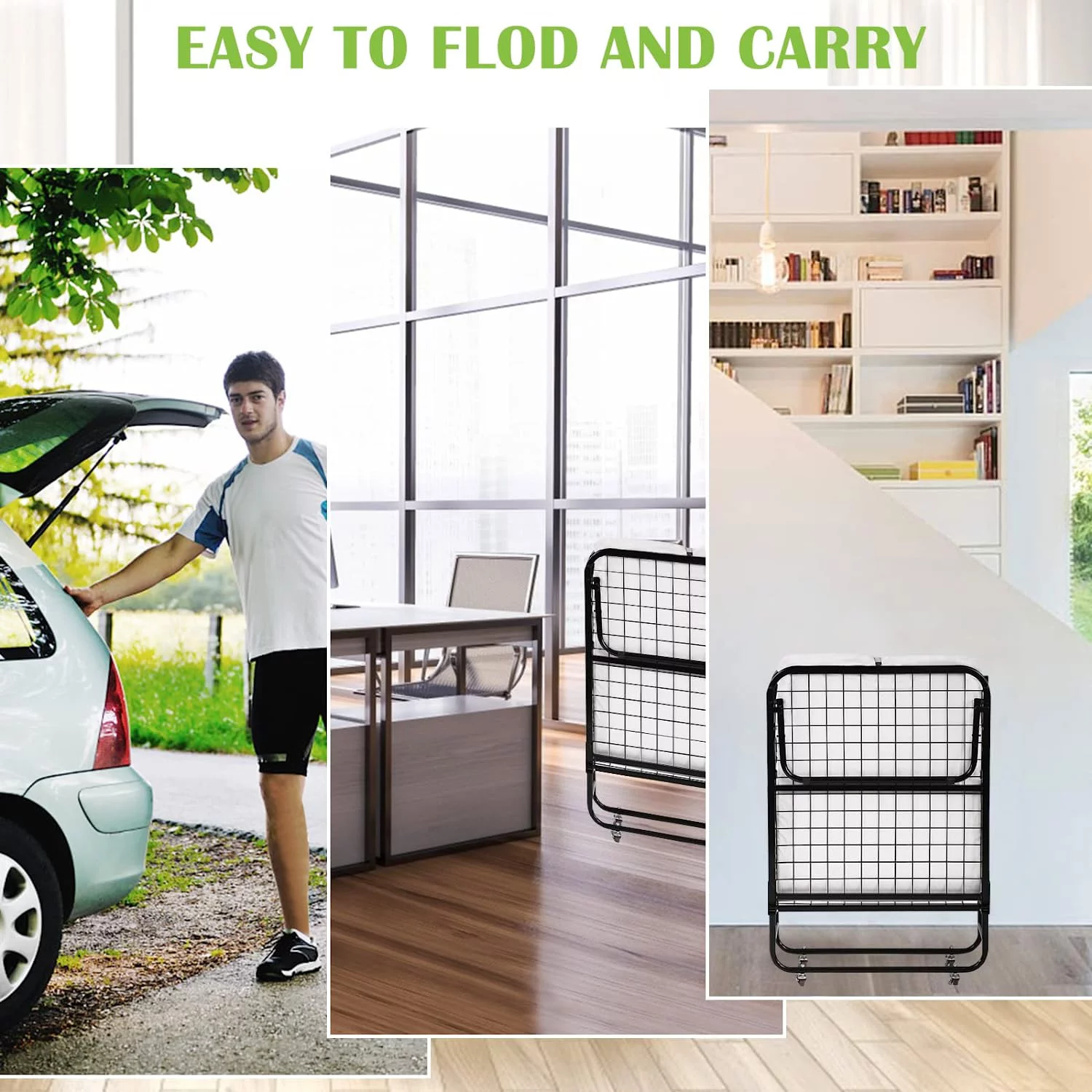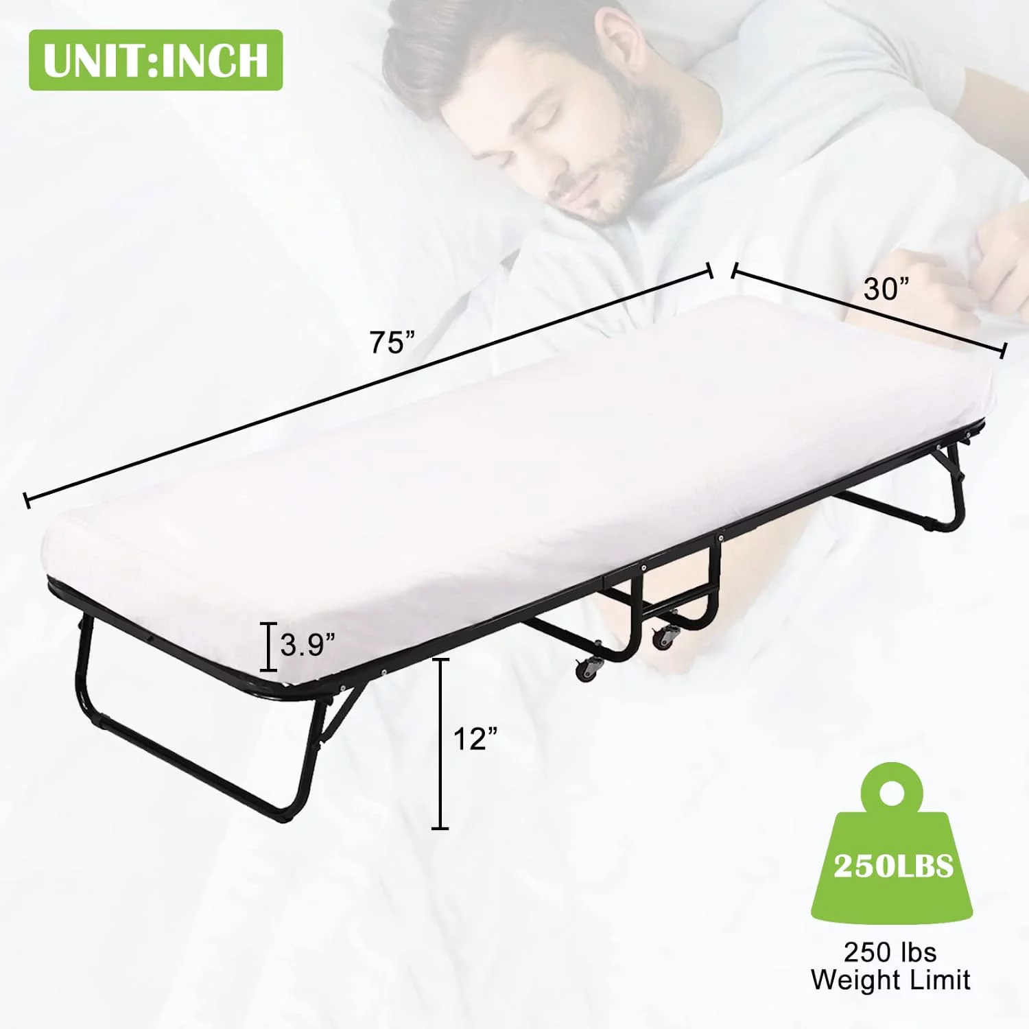 YRLLENSDAN Rollaway Folding Guest Bed with 4 inch Mattress, Portable Camping Cots for 300 lbs Adults with Wheels Rollaway Bed Twin Size with Foam Mattress Heavy Duty Foldable Metal Bed Frame