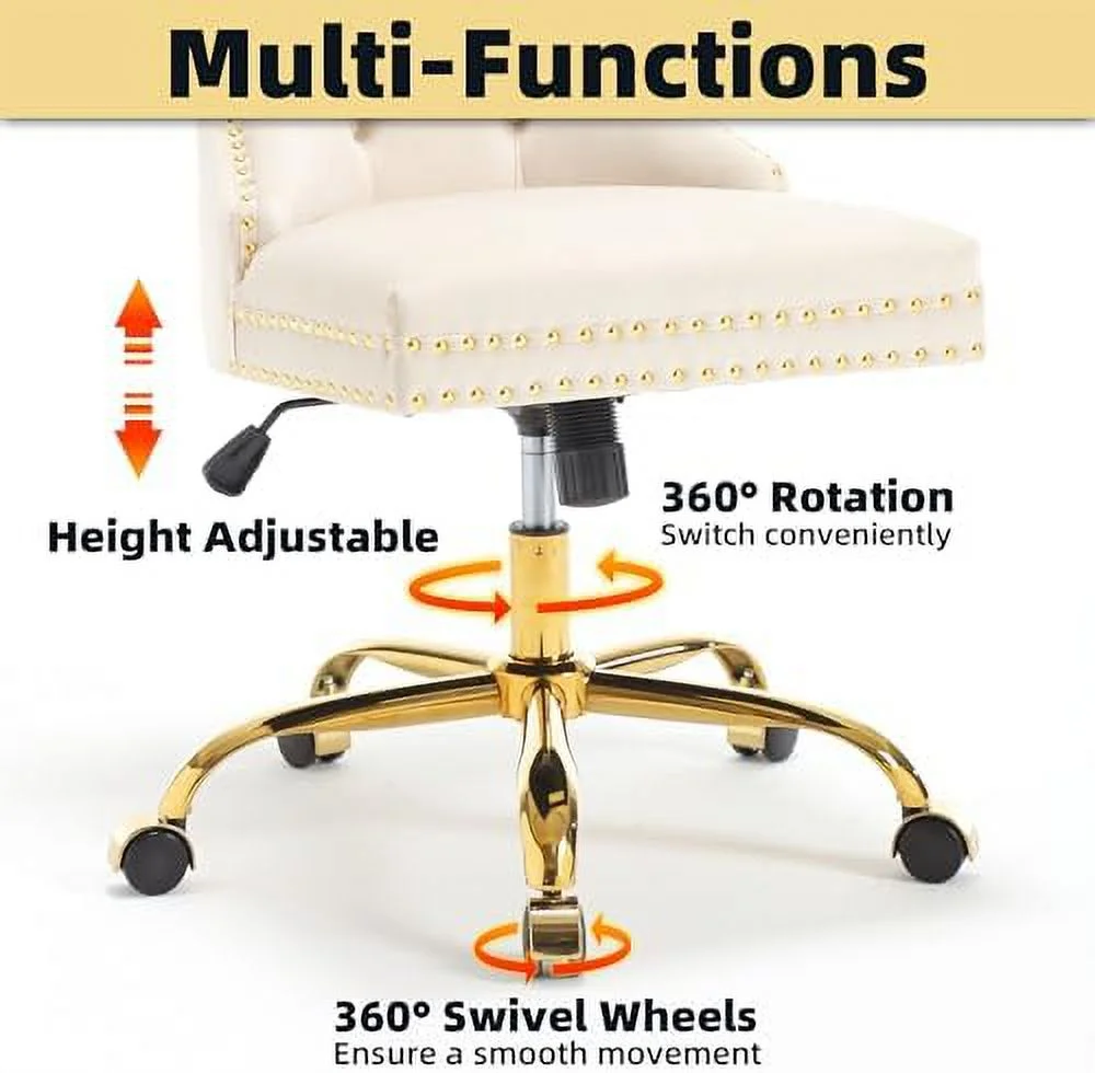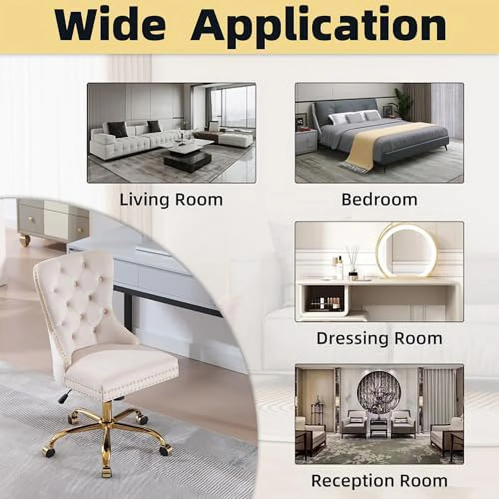 Desk Chair with Wheels Velvet Gold Office Chair Height Adjustable Armless Swivel Chair with Tufted High Back Trim Comfy Upholstered JOMA Computer Chair for Bedroom Blue