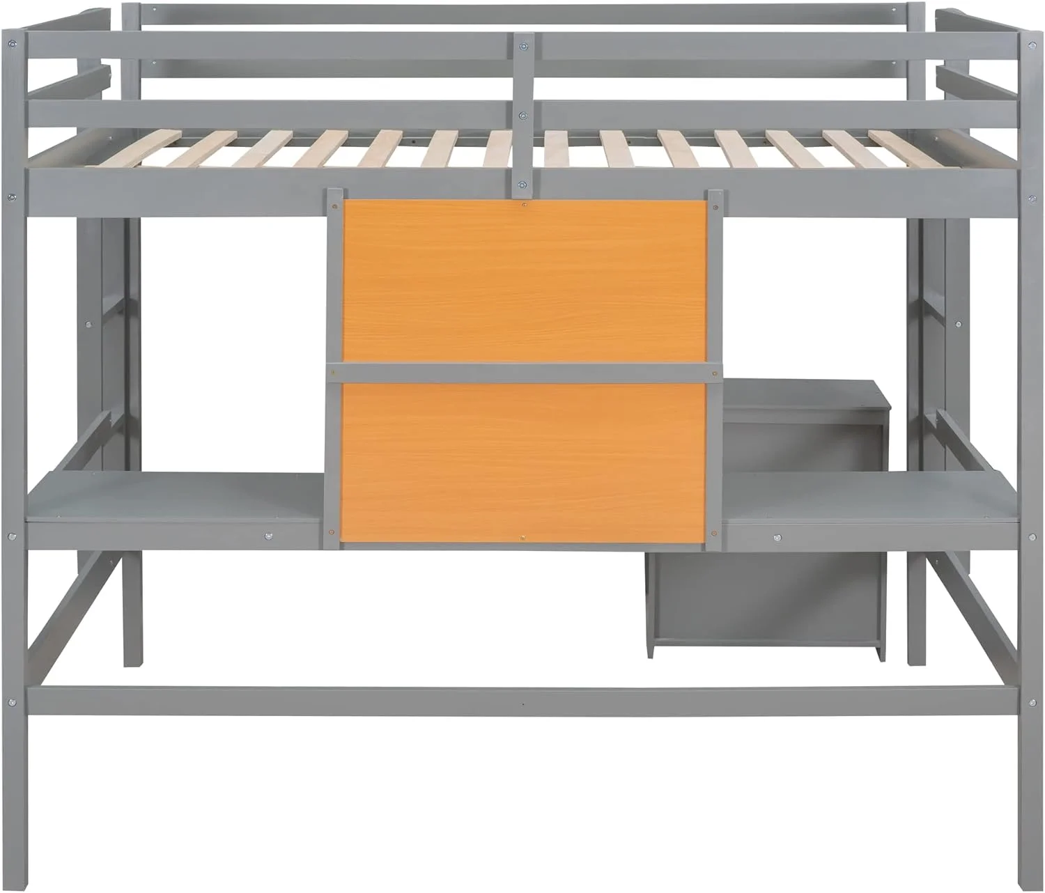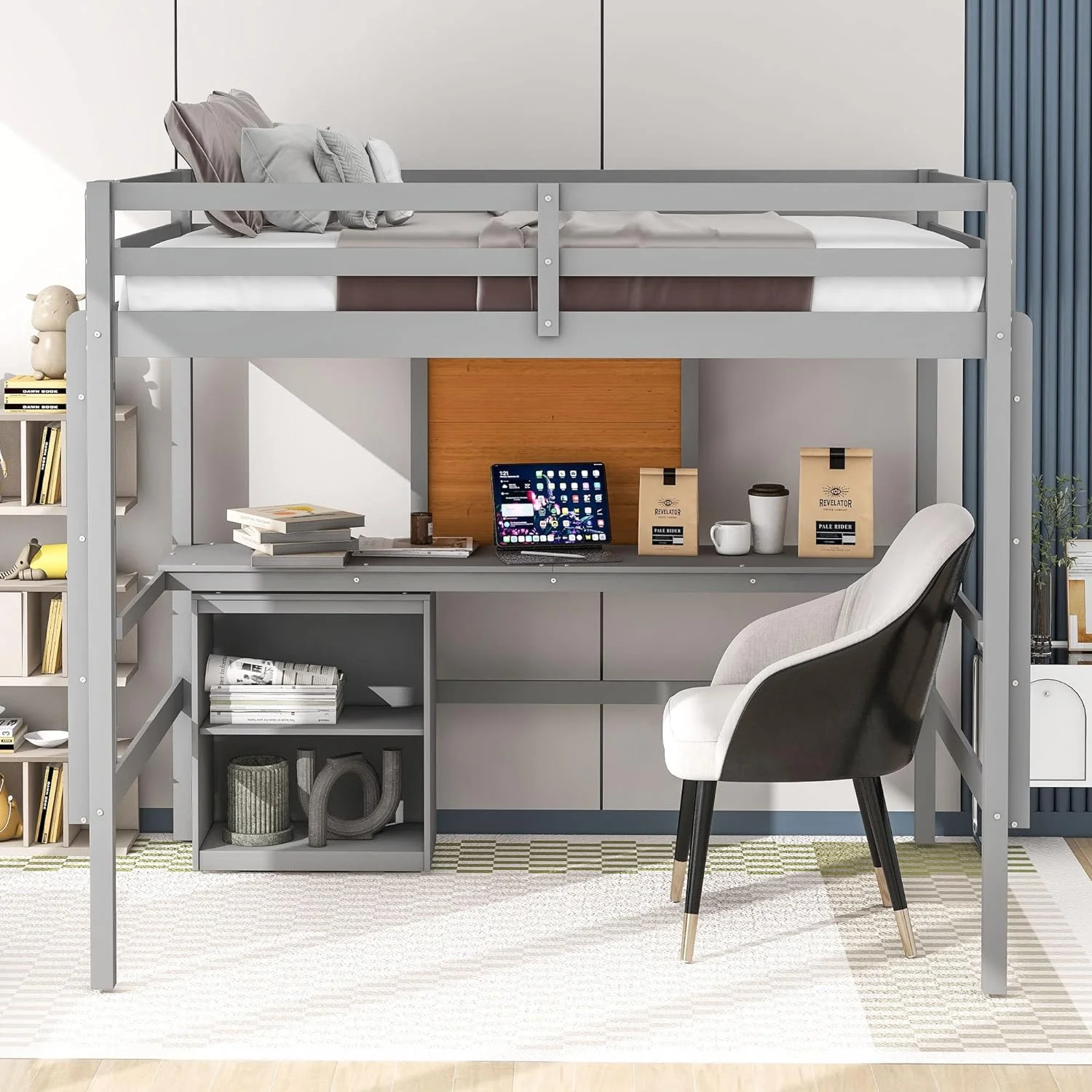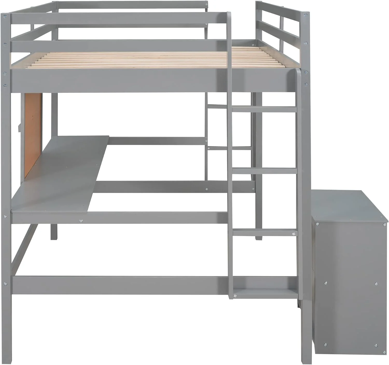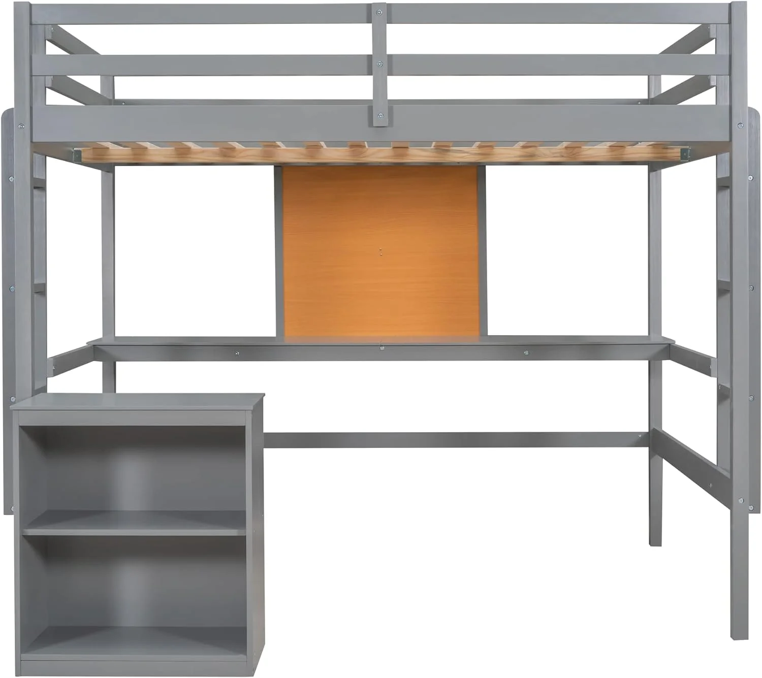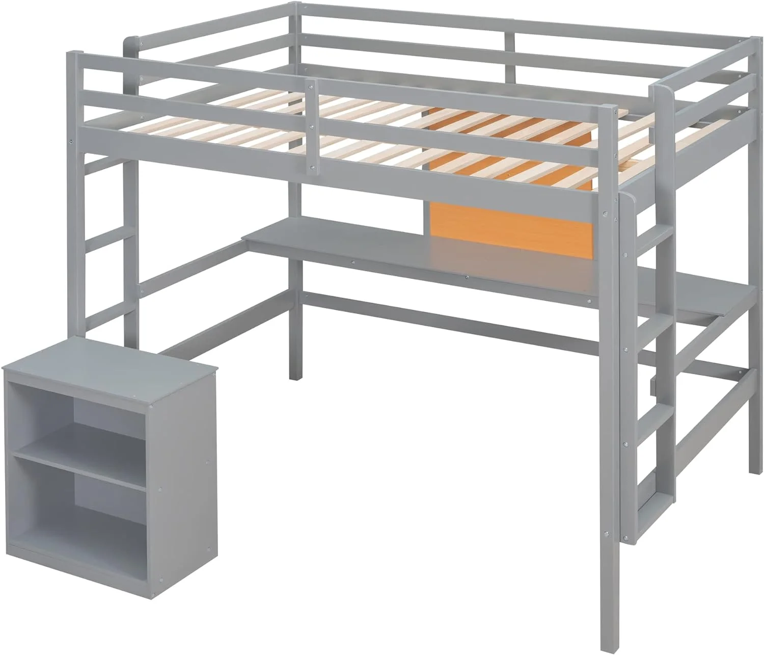 Full Size Loft Bed Frame With Desk, Storage Shelves And Writing Board, Wood Loft Beds With Two Ladders And Moveable 2-Shelf Cabinet, High Loft Bed For Kids Boys Girls Teens, Gray