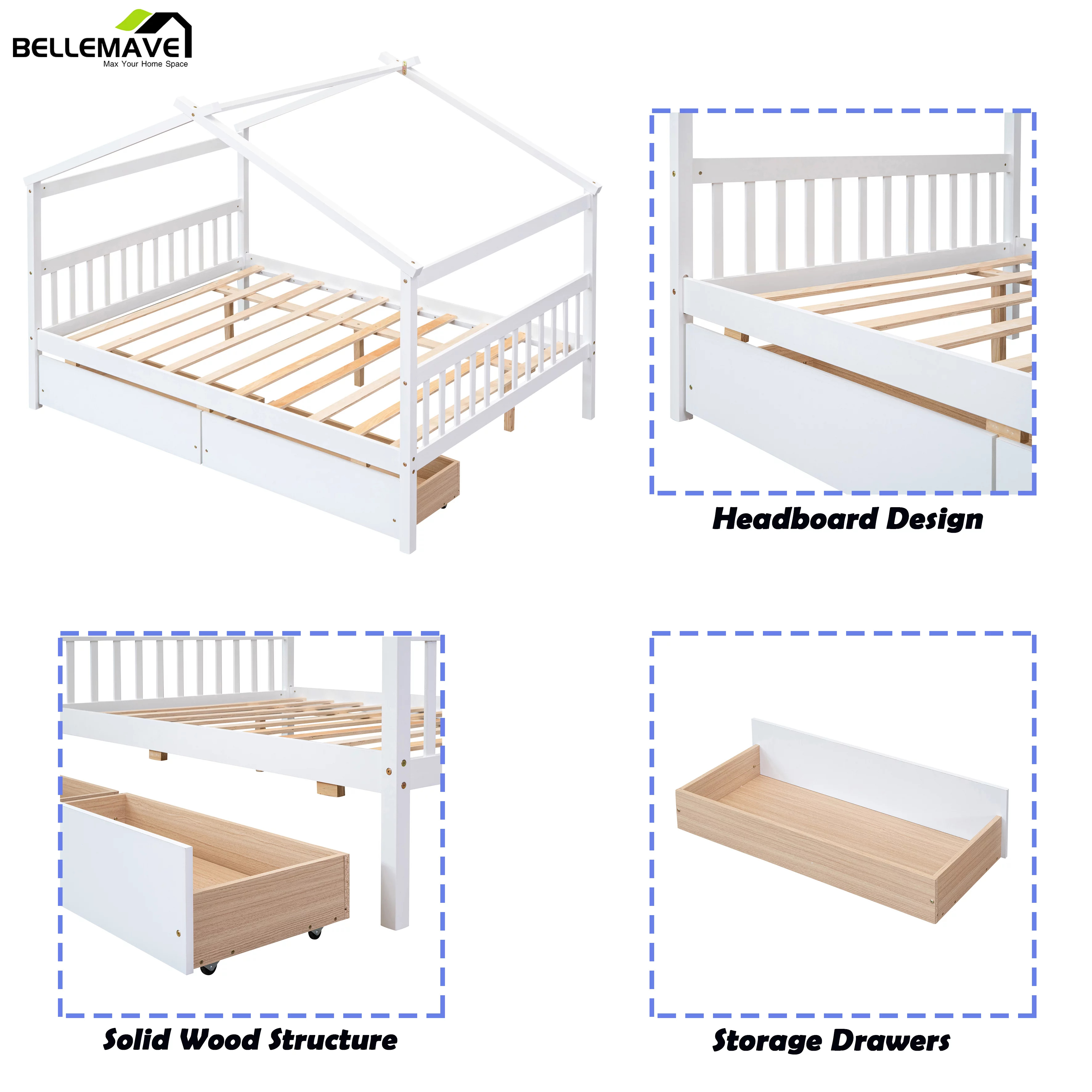 Bellemave Kids House Bed with Drawers Full Size Platform Bed with Storage Playhouse Design Wooden House Bed Frame With Headboard and Footboard for Boys Girls Teens, White