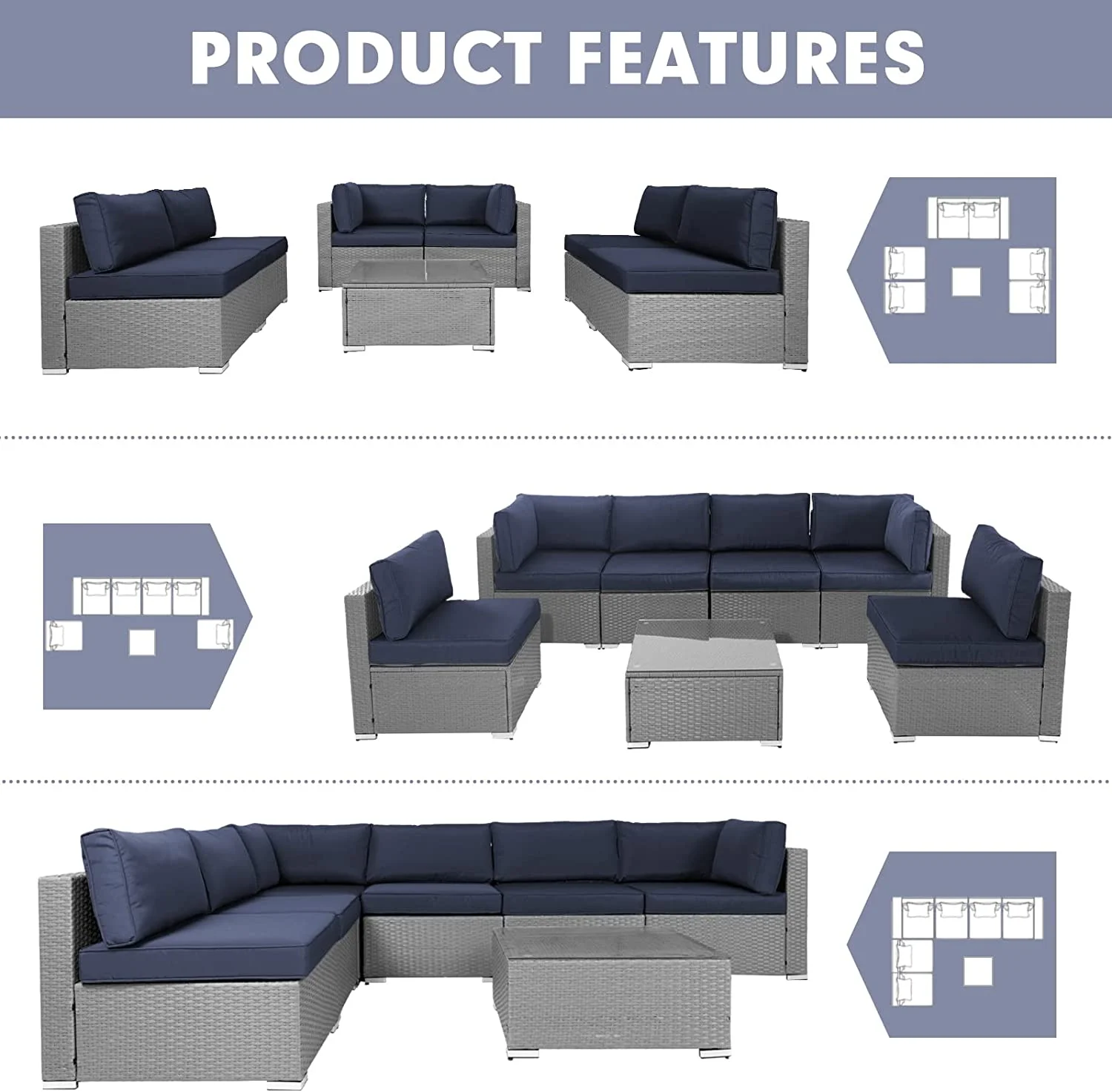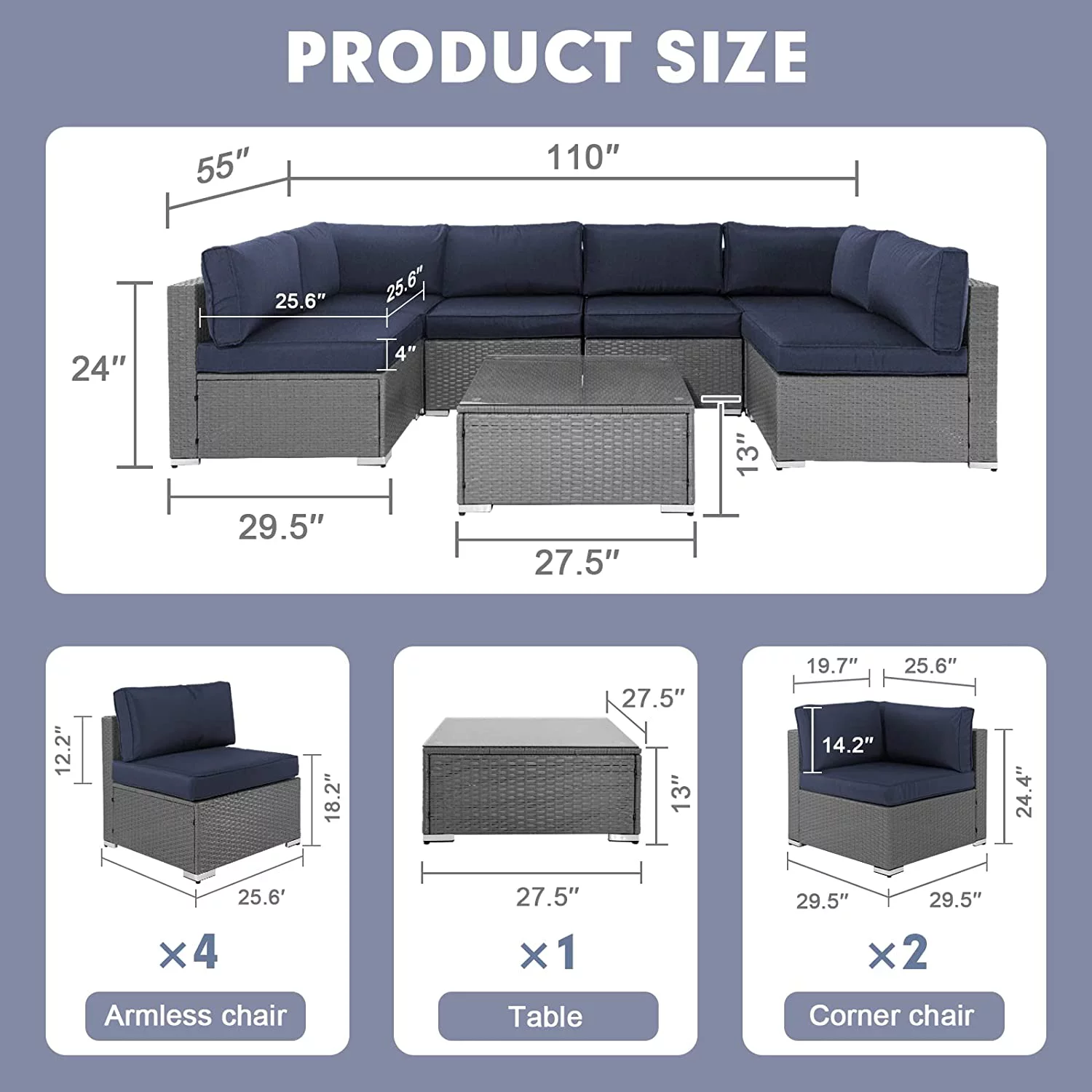 Popular 7 Piece Outdoor Sectional Sofa Patio Furniture Set All-Weather PE Grey Wicker Patio Conversation Set with Washable Cushion and Glass Table(Grey Cushions)