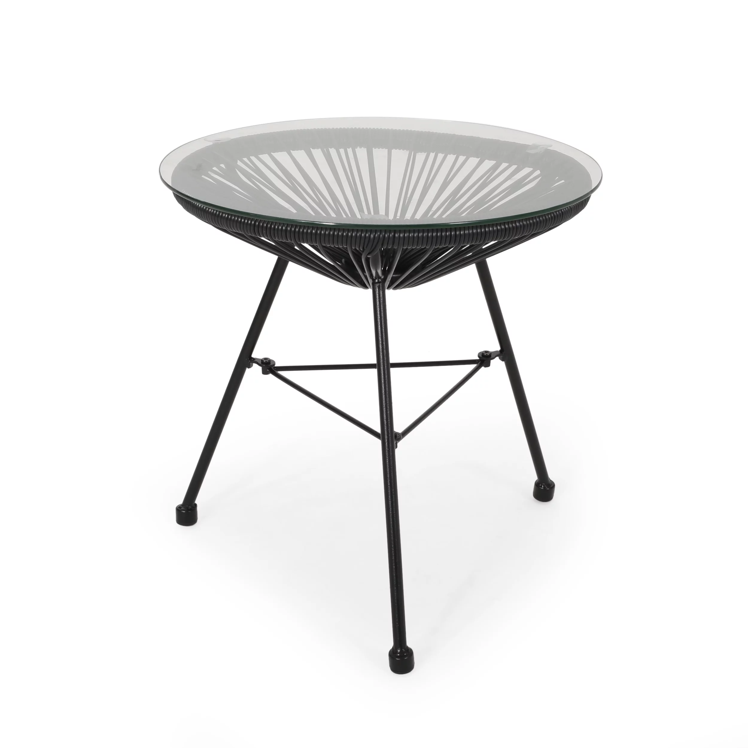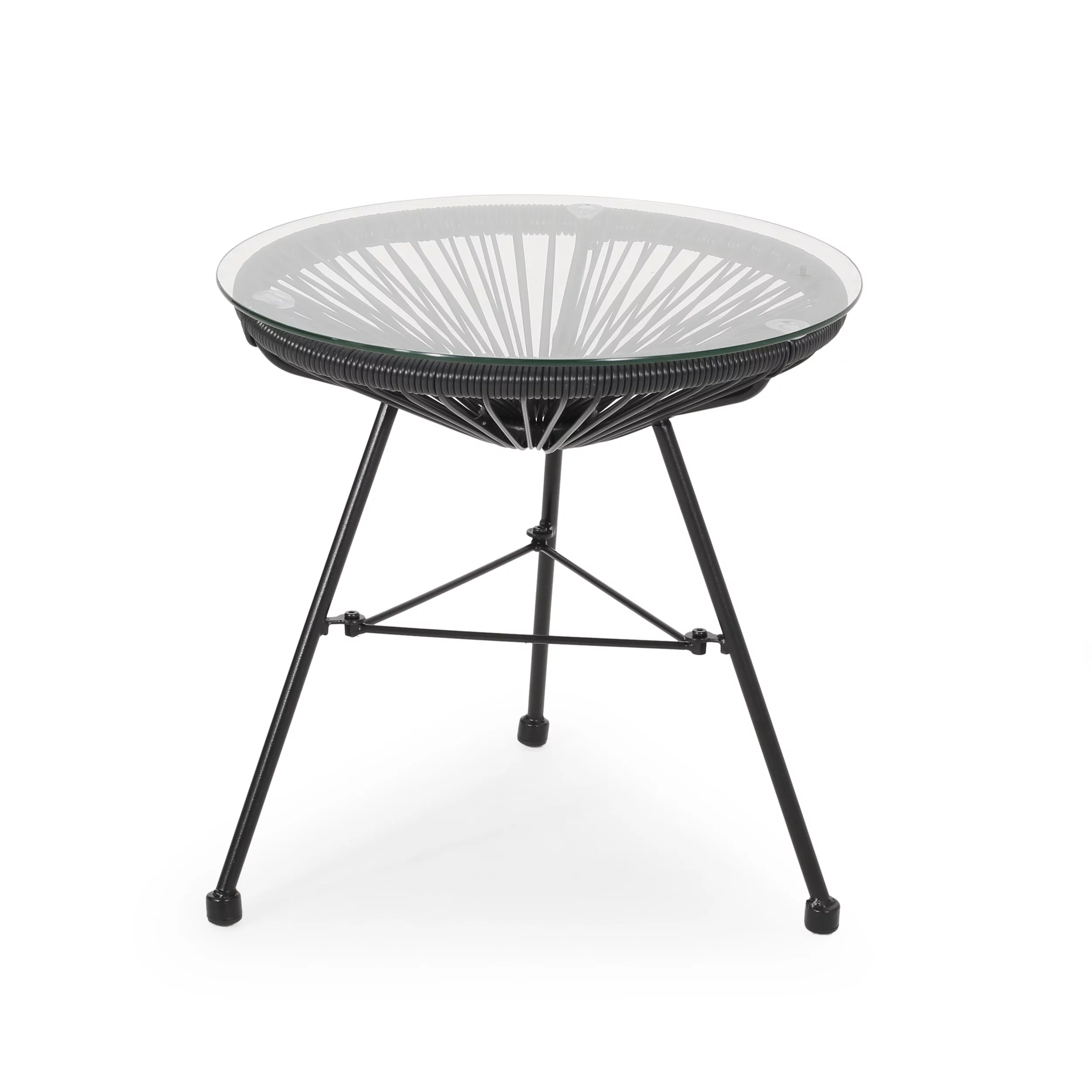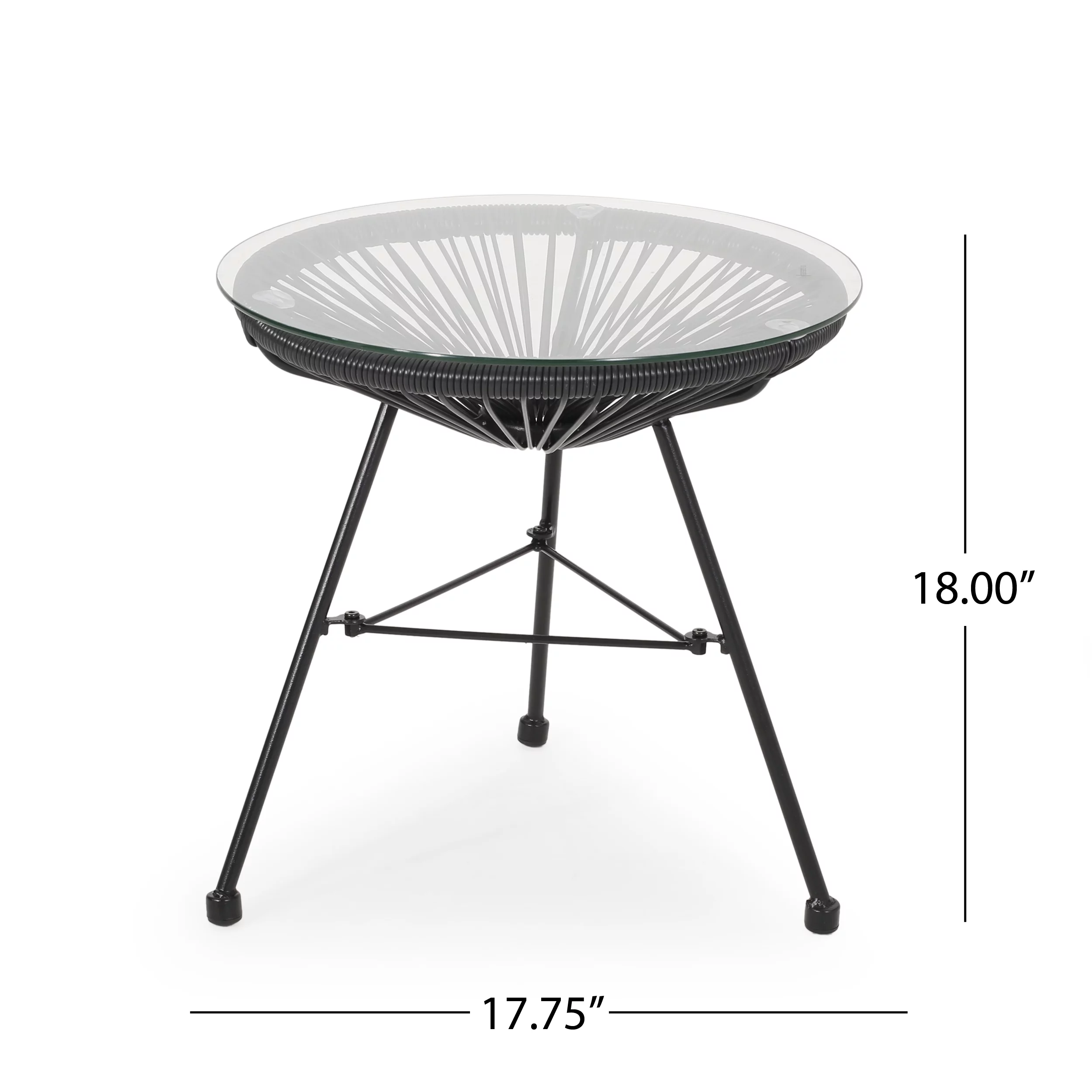 Noble House Nusa Outdoor Tempered Glass Top Faux Rattan Side Table in Black