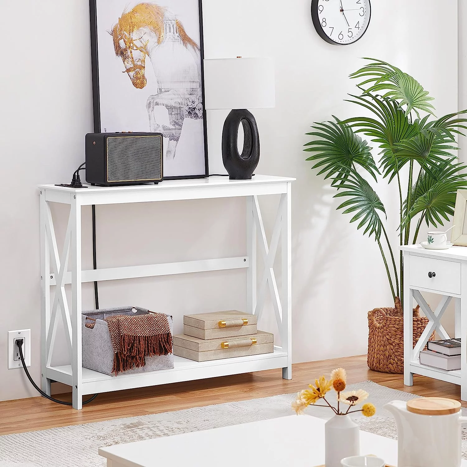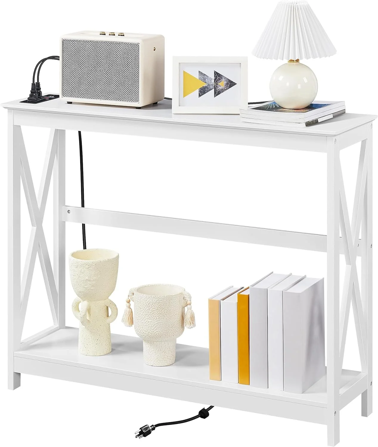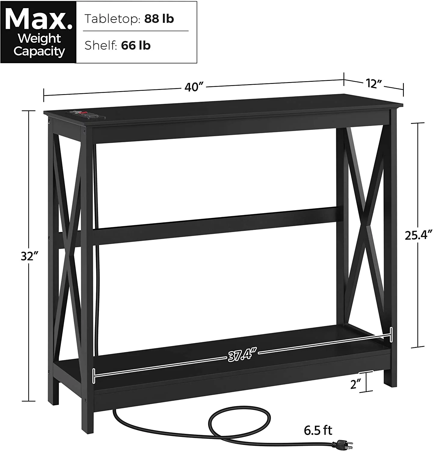 Console Table with Outlets and USB Ports, Entryway Table with Storage Shelves, Sofa Table Narrow Long with X Design for Living Room, Hallway, Foyer, Black
