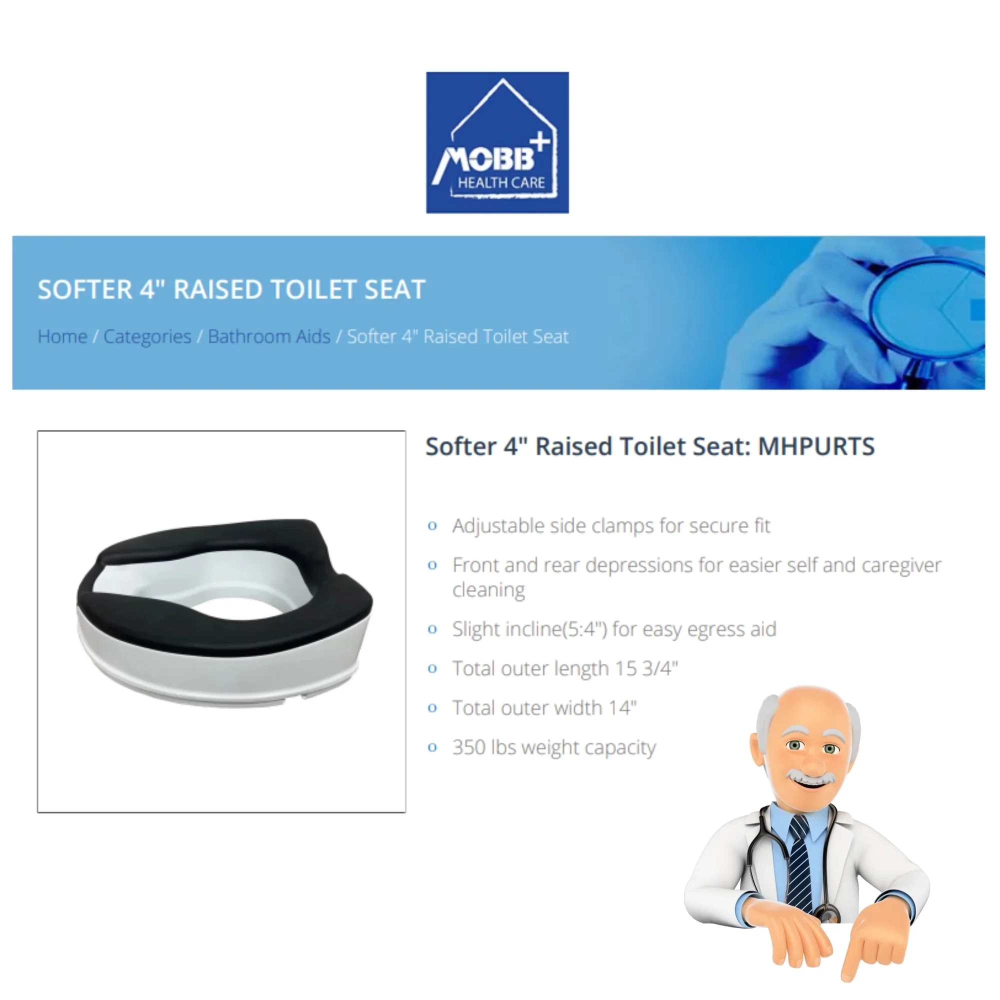 MOBB Healthcare 4-inch Raised Toilet Seat - Softer Black Padded, Easy Clean, 350lb, Adjustable White