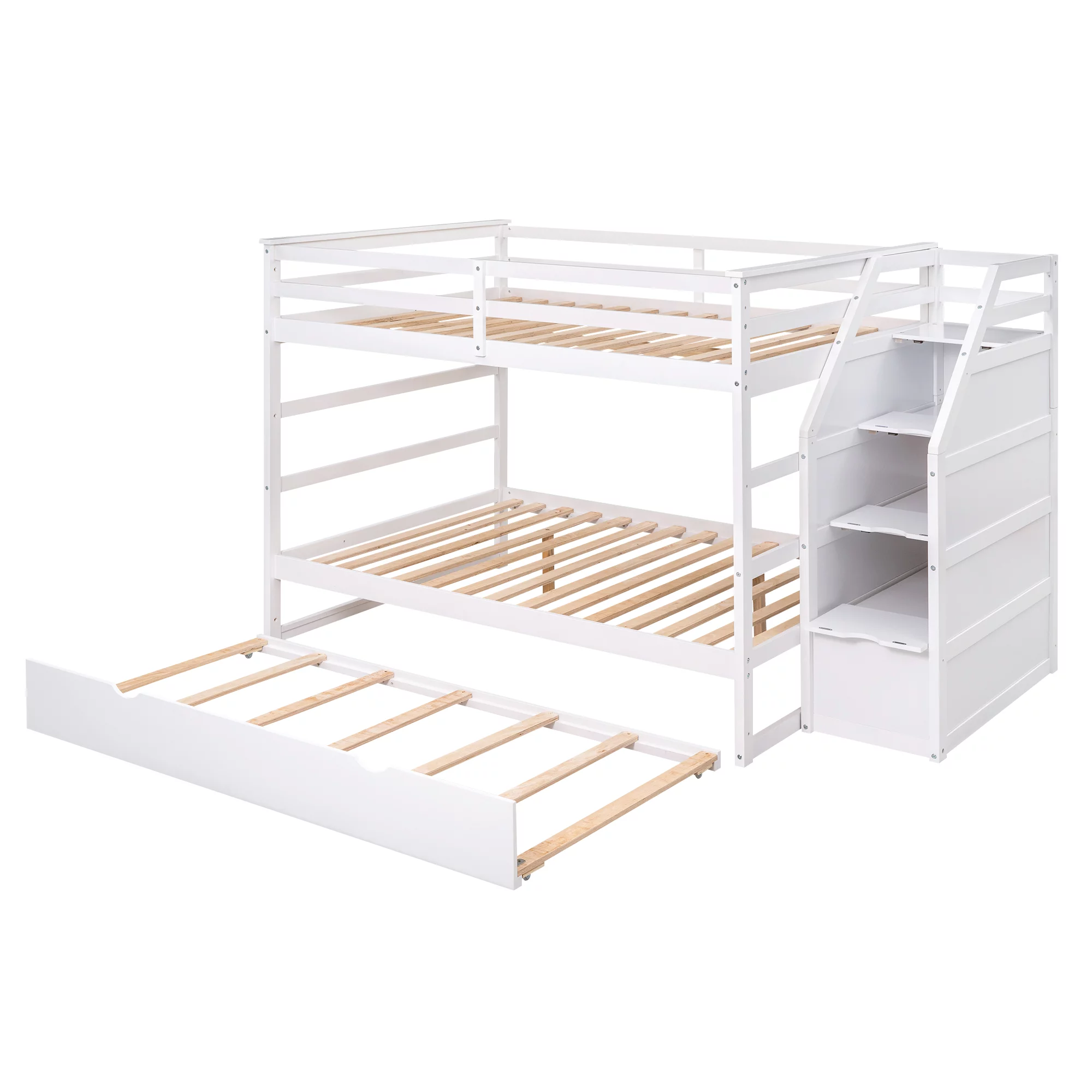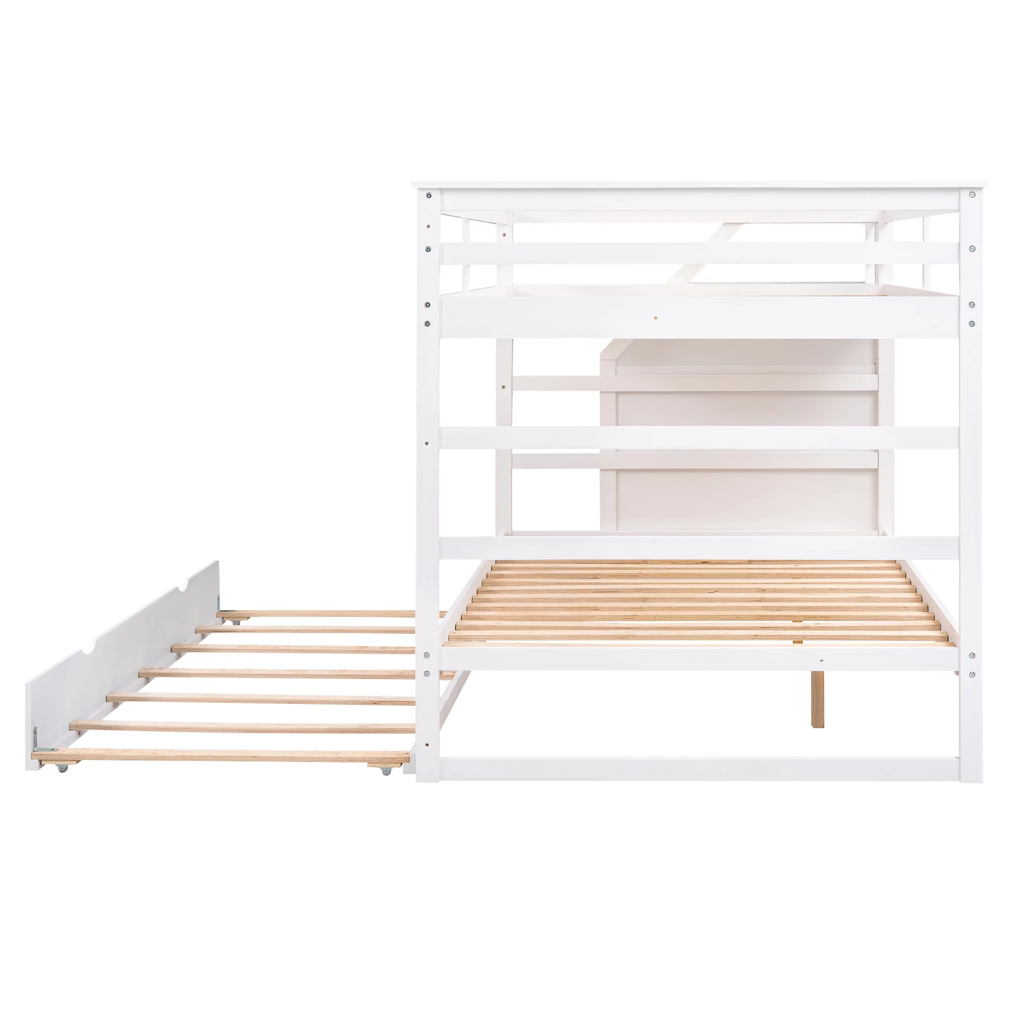 Solid Wood Full-Over-Full Bunk Bed with Twin Size Trundle, 3 Storage Stairs and Guard Rail, Full over Full Bunk Bed with Trundle for Toddler Kids Teens(White)