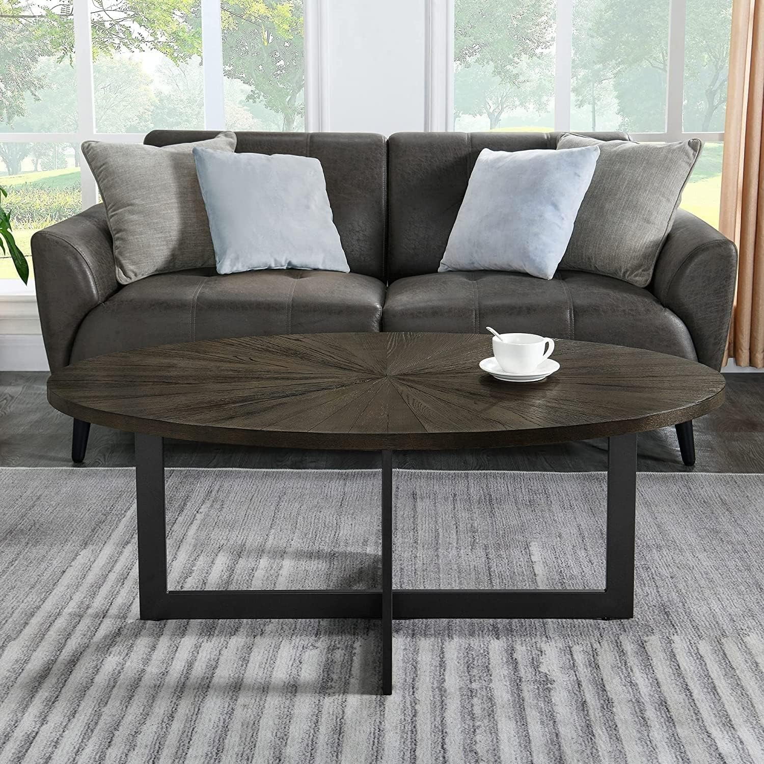 KHBIULIFE Solid Wood Contemporary Oval Coffee Table with Cross Metal Legs Brown