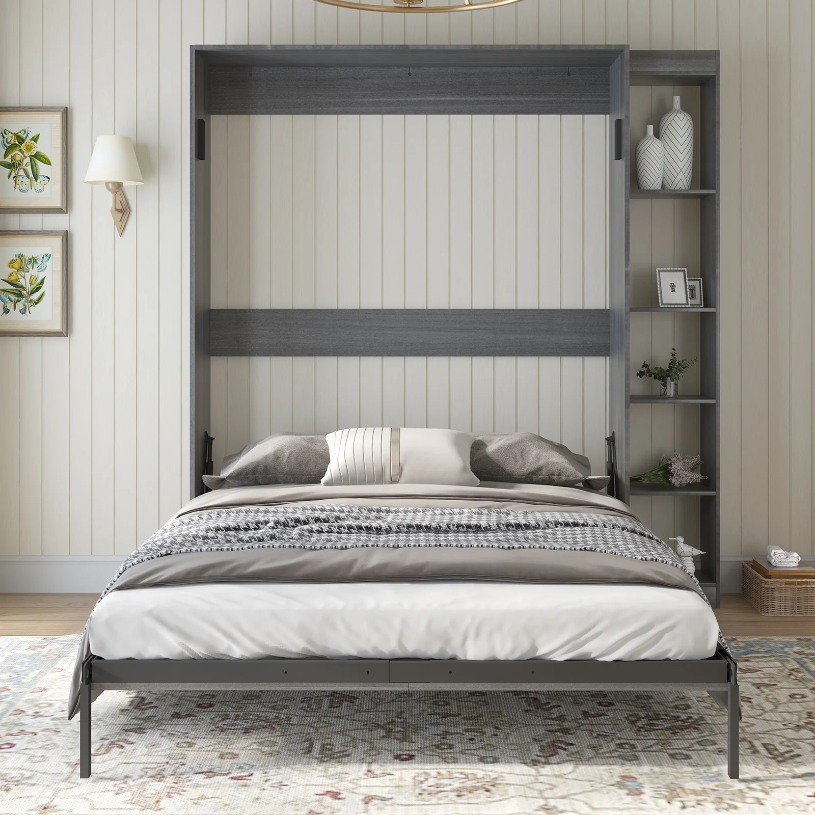 MUZZ Foldable Murphy Bed with 1 Side Cabinet, Folding Wall Bed with Space Saving Design, Fold up Murphy Bed Cabinet for Storage, Multipurpose Cabinet Bed for Bedroom/Apartment (Style5+1,Dark Grey)