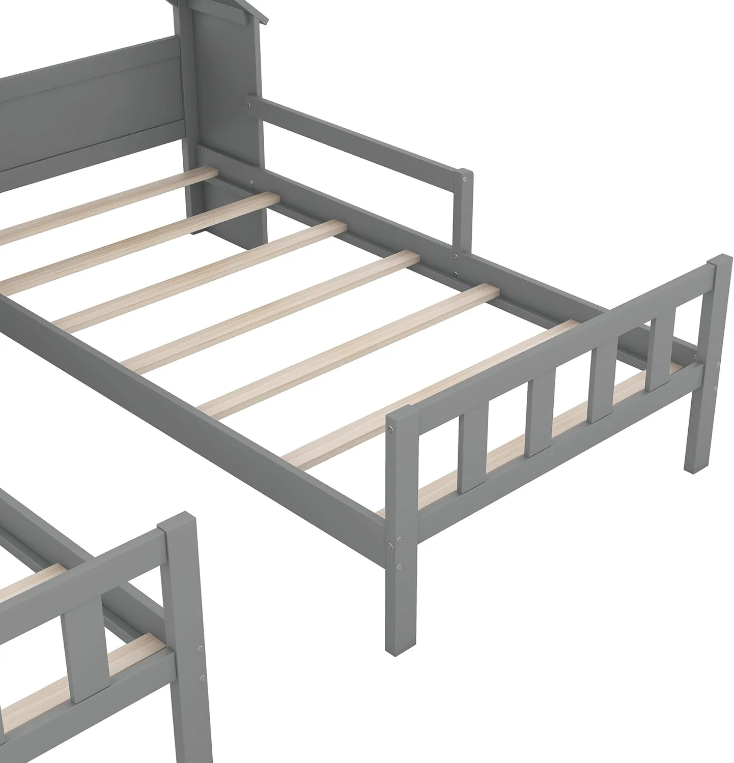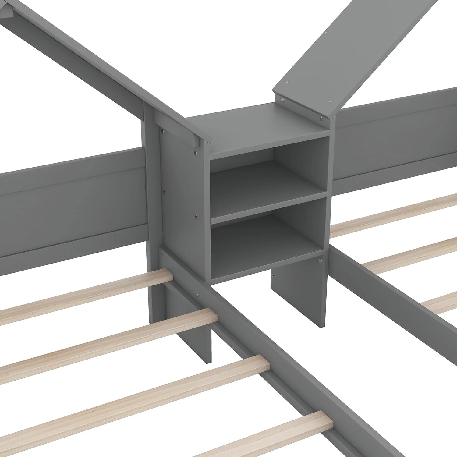 Double Size Platform Bed, Shared Bed Frame With House-Shaped Headboard And A Built-In Nightstand,Grey