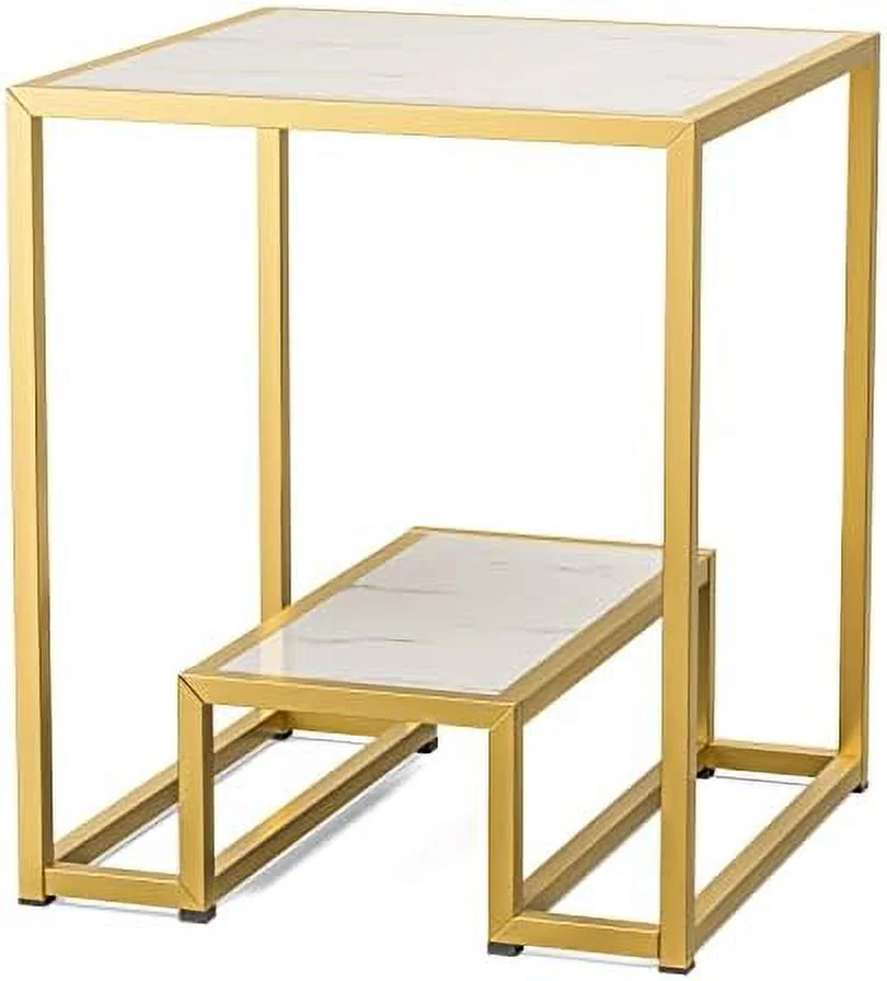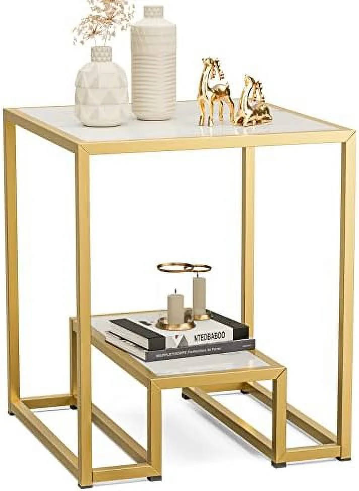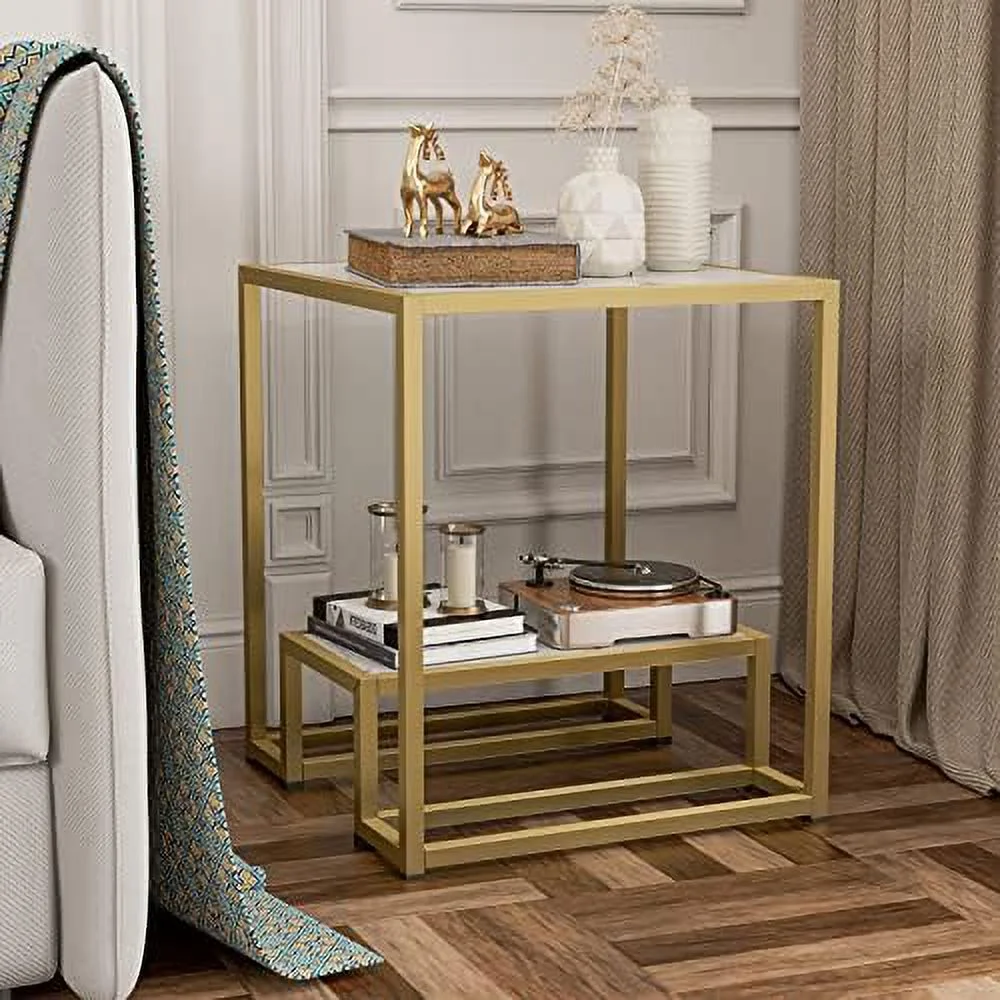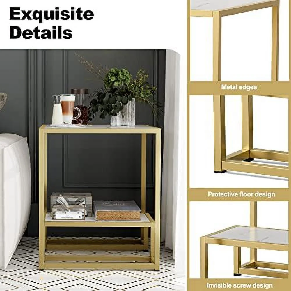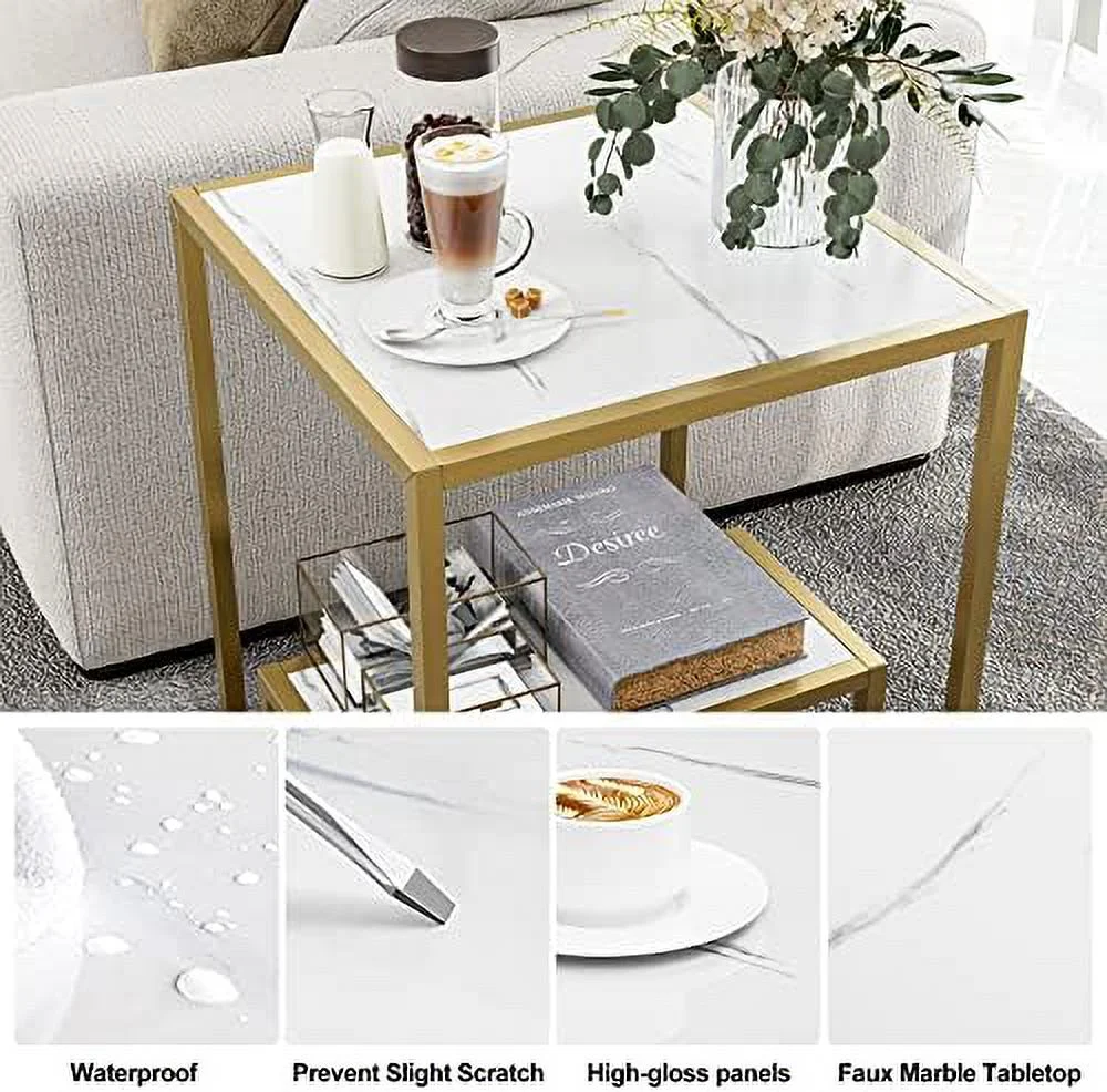 High Gloss Gold Nesting End Table 2-Tier Faux Marble Sofa Side Table with Shelf Metal Frame Bedside Table for Living Room Bedroom Office(White)