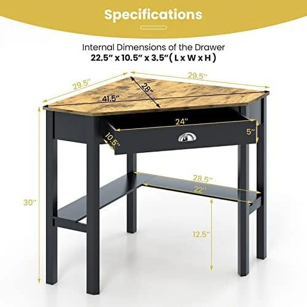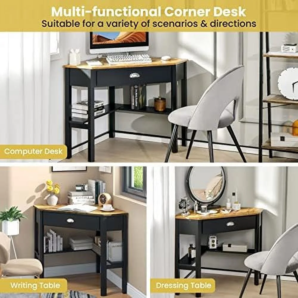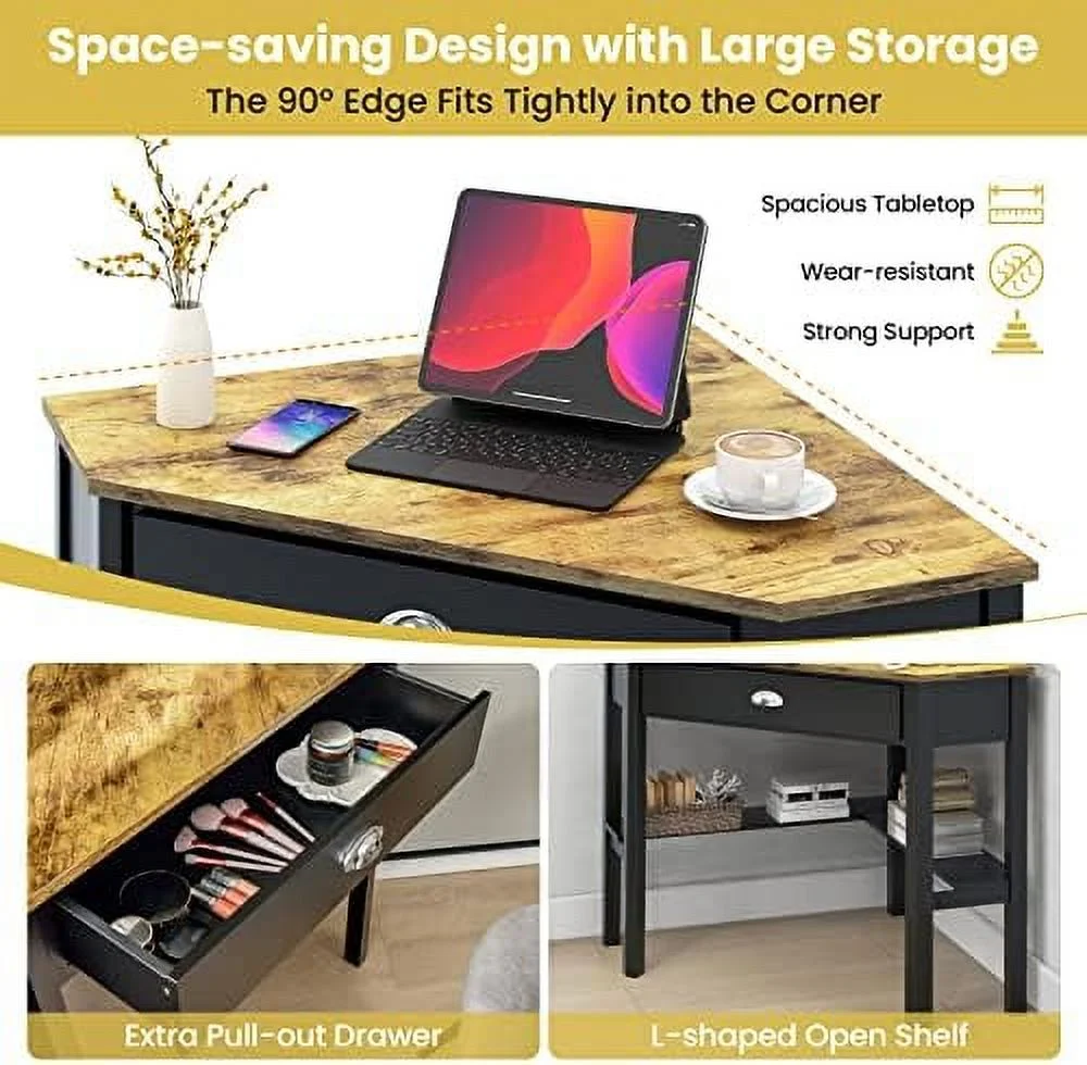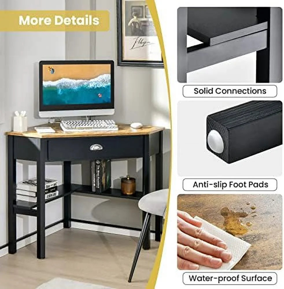 HJNIUNIU Corner Desk with Drawer and Shelves Wooden Home Office Desk Triangle Computer Desk Writing Study Desk Computer Workstation Makeup Vanity Table (Rustic Brown & Black)