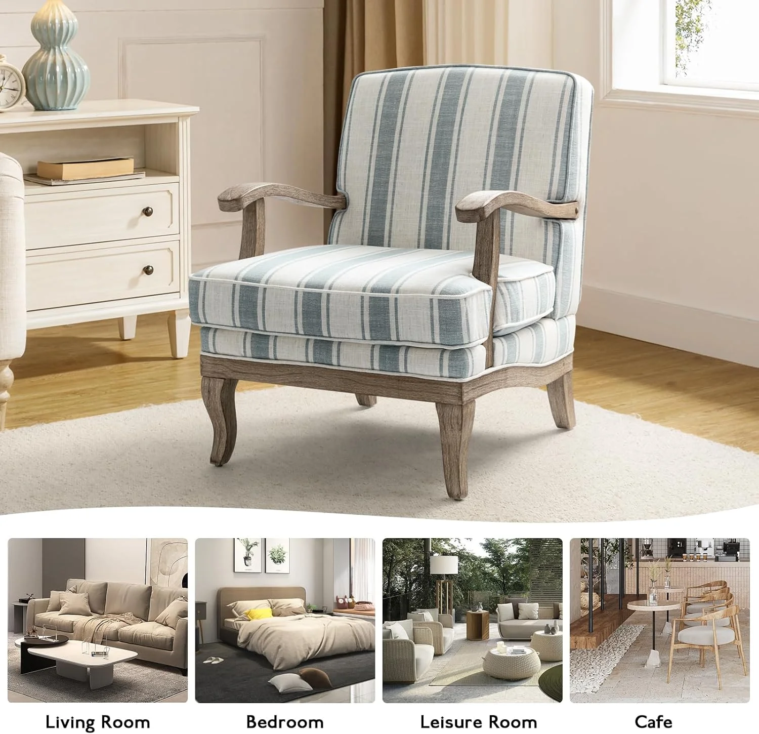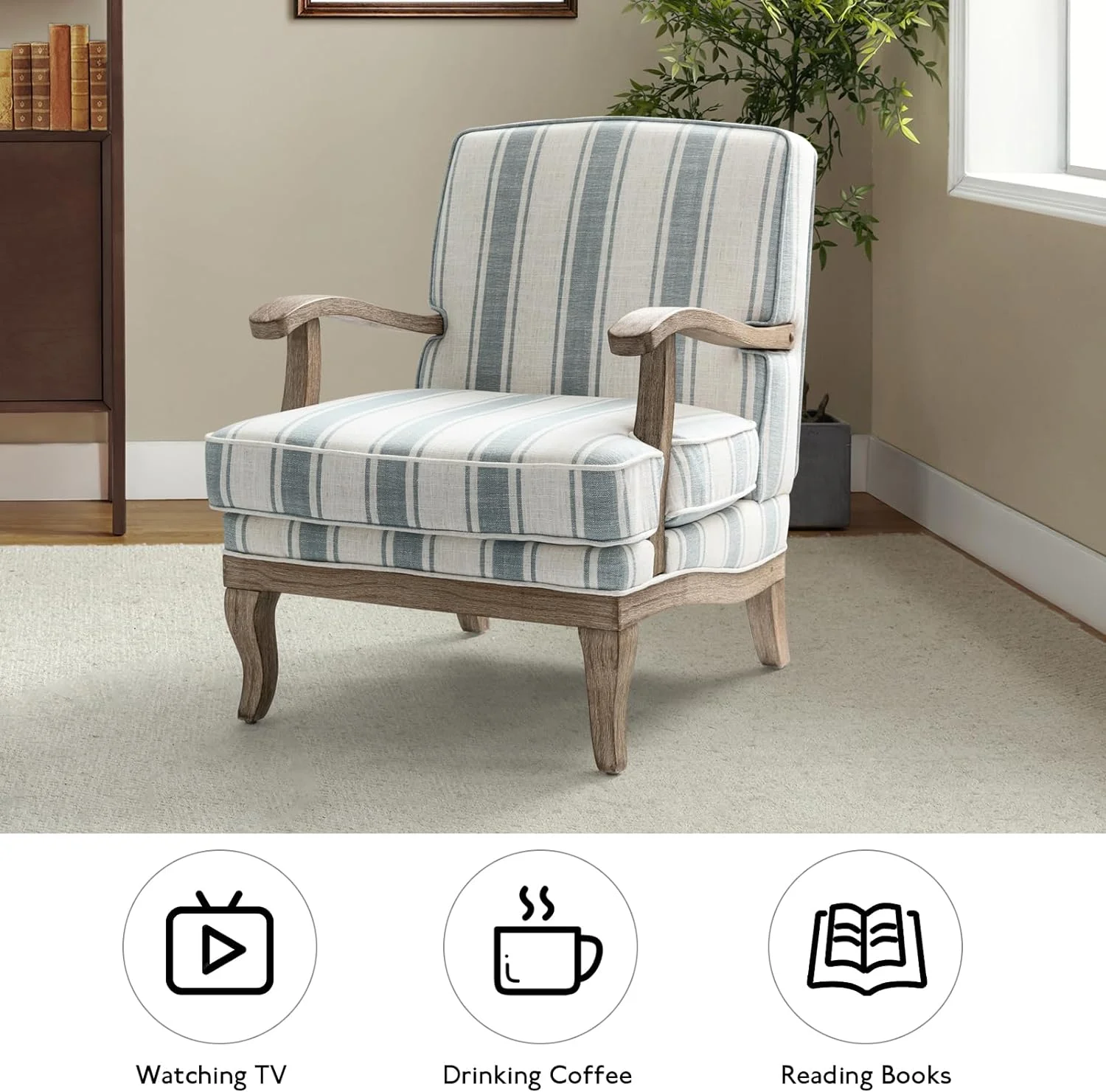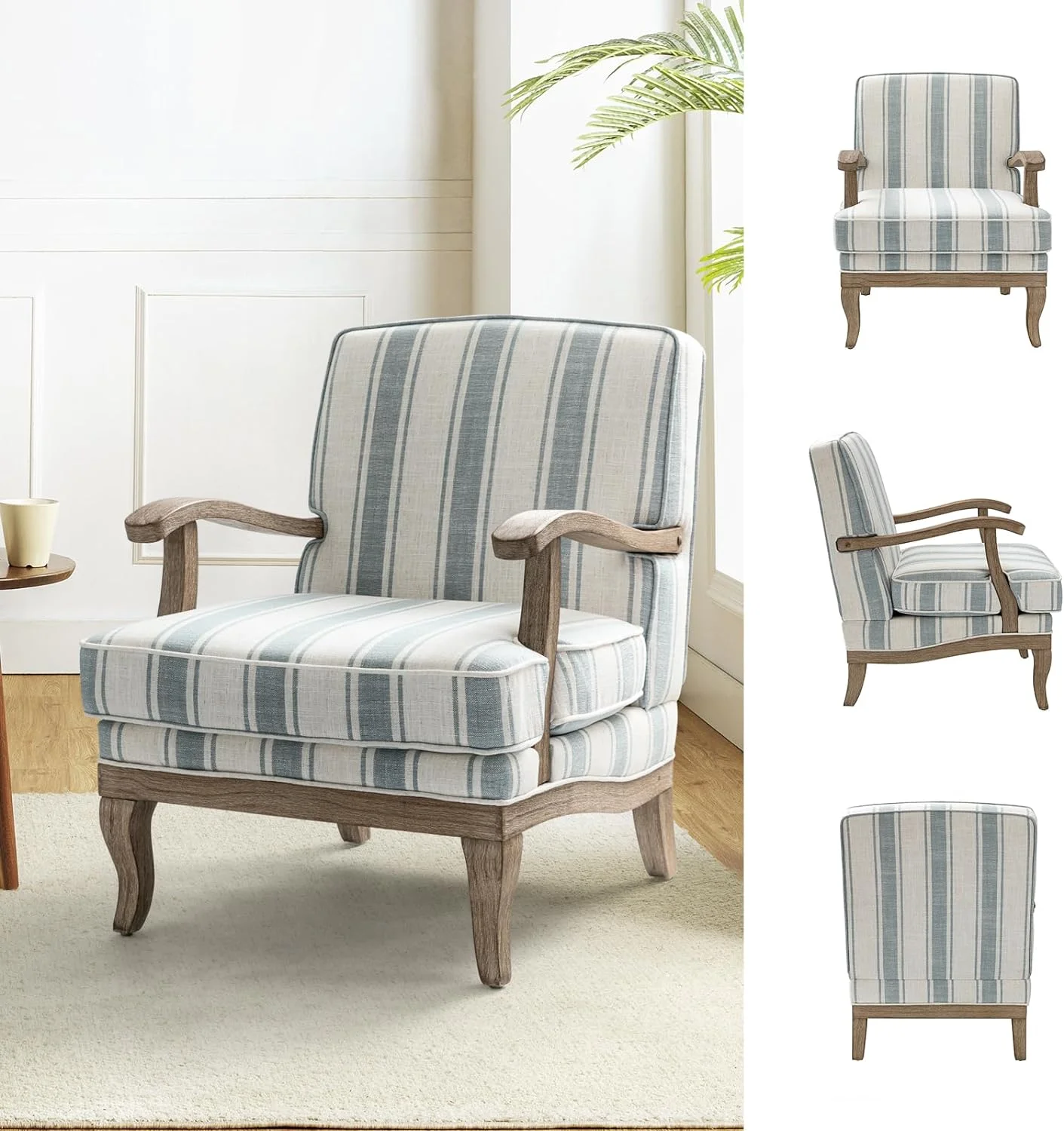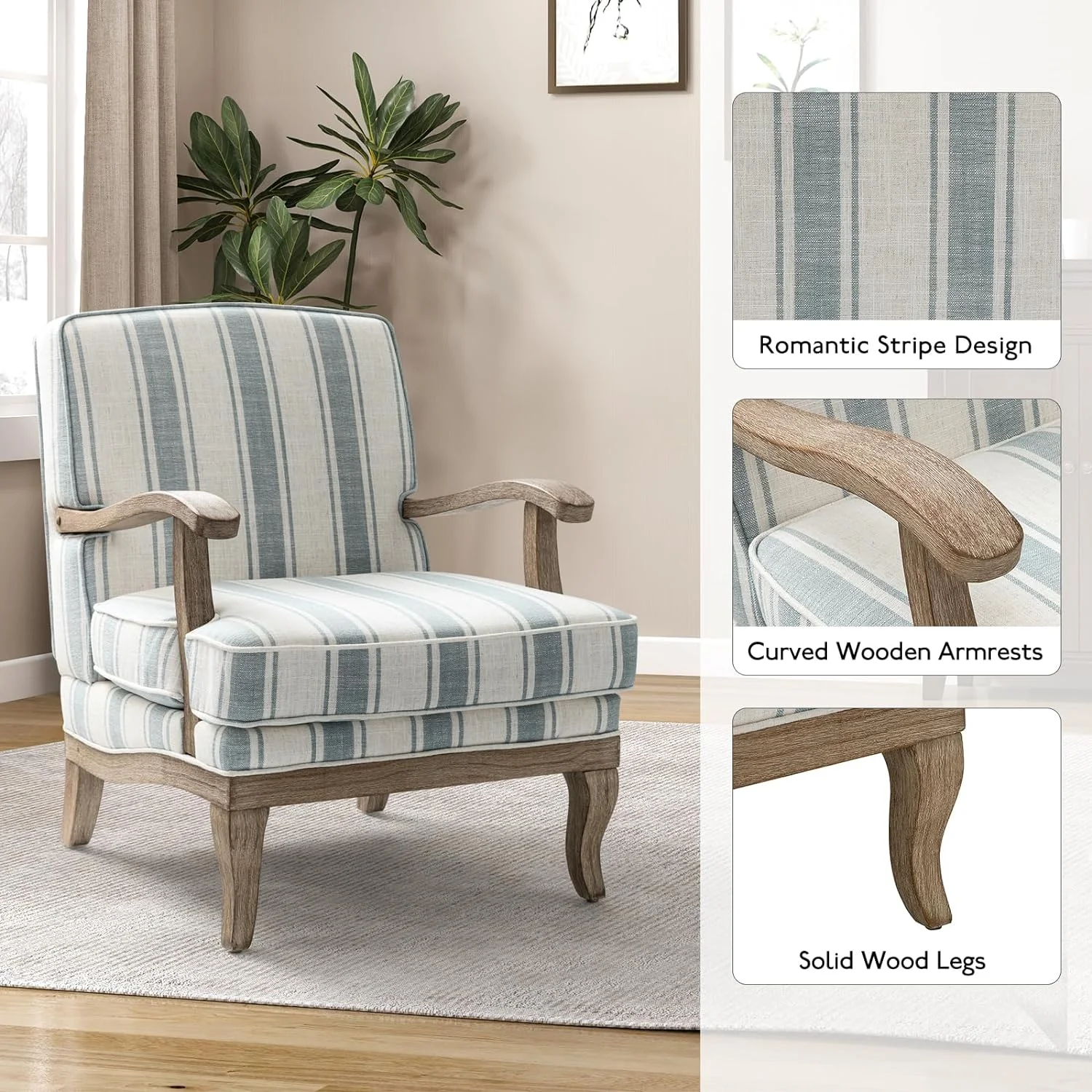 Modern Chair Set Of 2, Upholstered Living Room Accent Chair, Lounge Armchair With Graceful Curves, Farmhouse Chairs With Romantic Stripes, Accent Chair For Bedroom, Blue