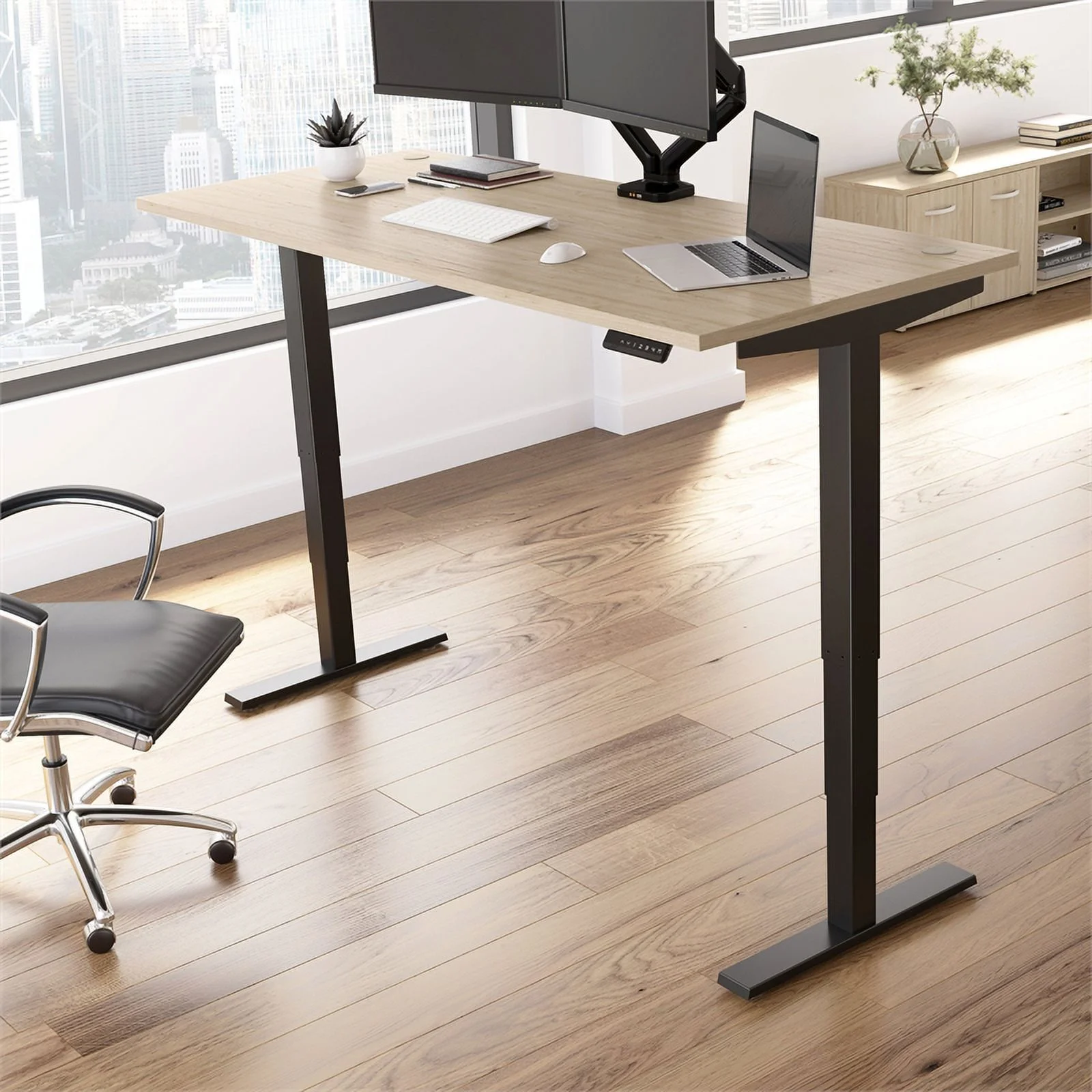 Bowery Hill 71" Engineered Wood Adjustable Standing Desk in Natural Elm/Black