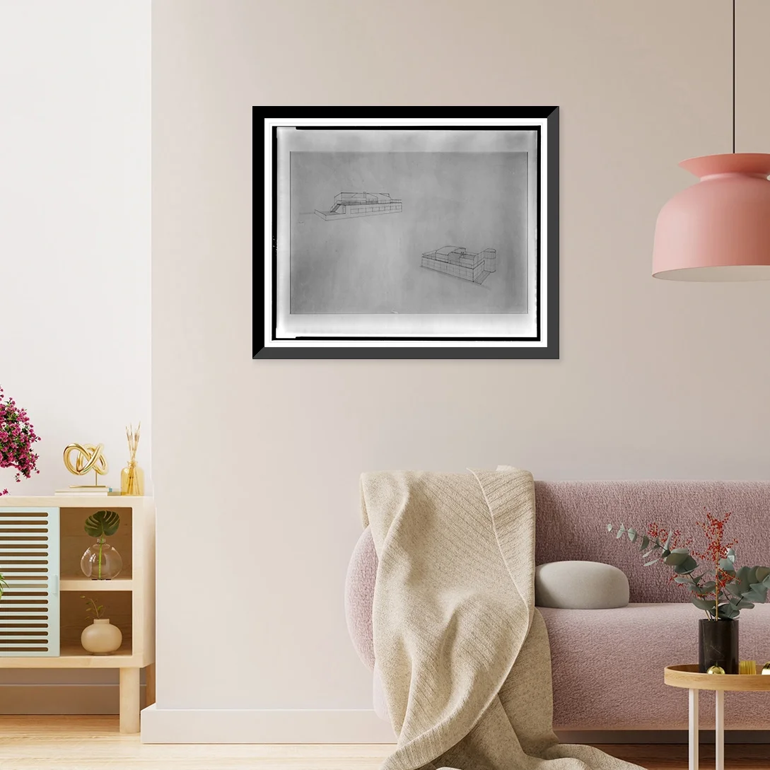 Historic Framed Print, [Nucleus House. Exterior showing different screening and canopy systems for roof terrace with furniture. Perspective projection. Rendering], 17-7/8" x 21-7/8"