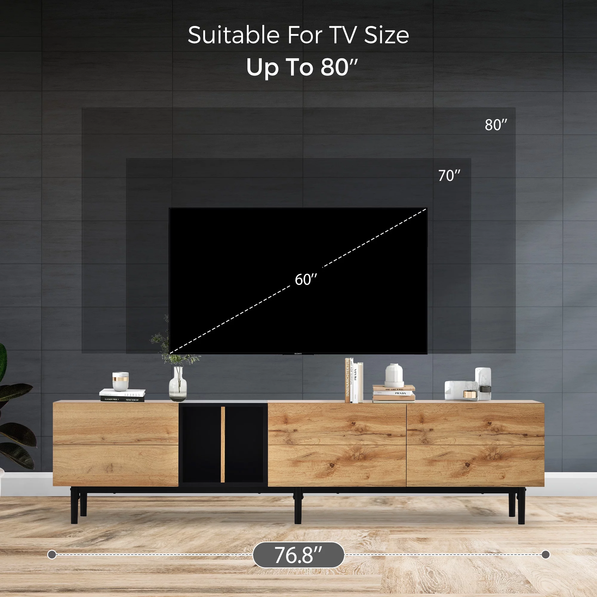 EUROCO Mid-Century Modern TV Stand Up to 80" Contemporary Rectangle ,Unique Style TV Console Table with 3 Doors & Large Storage Cabinet for Living Room Bedroom