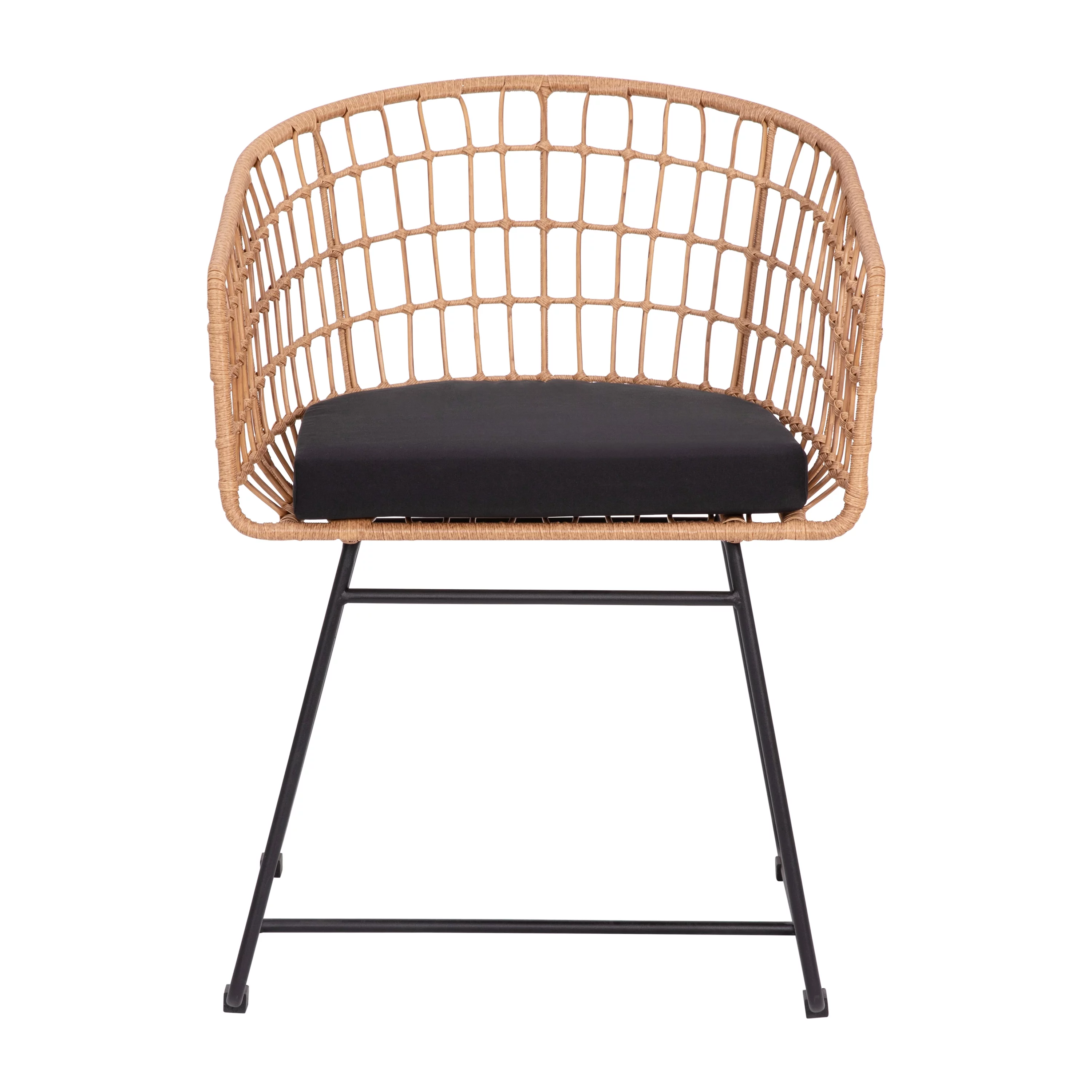 BizChair Set of 2 Indoor/Outdoor Patio Boho Club Chairs, Rope with Natural PE Wicker Rattan, Black Cushions and Sled Base
