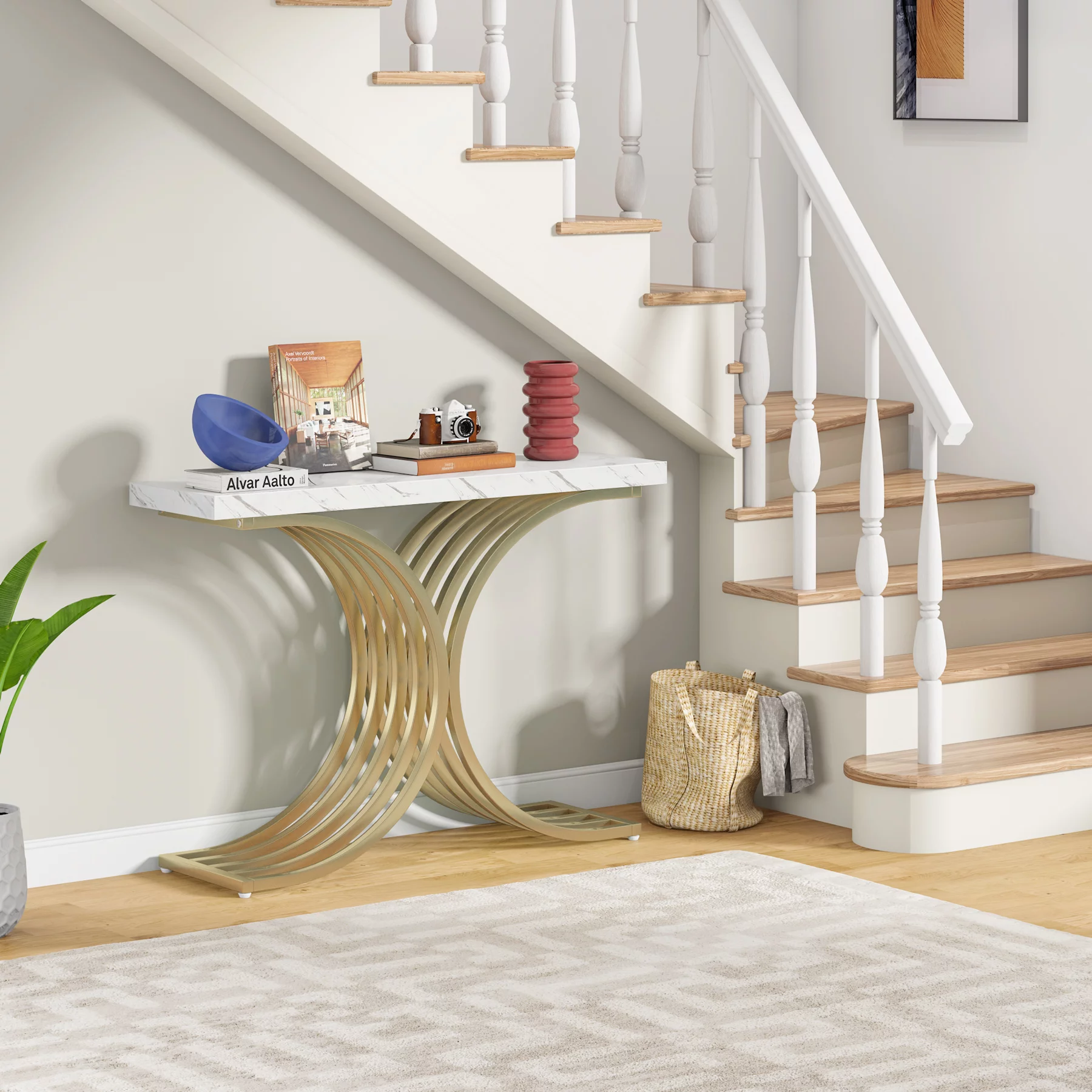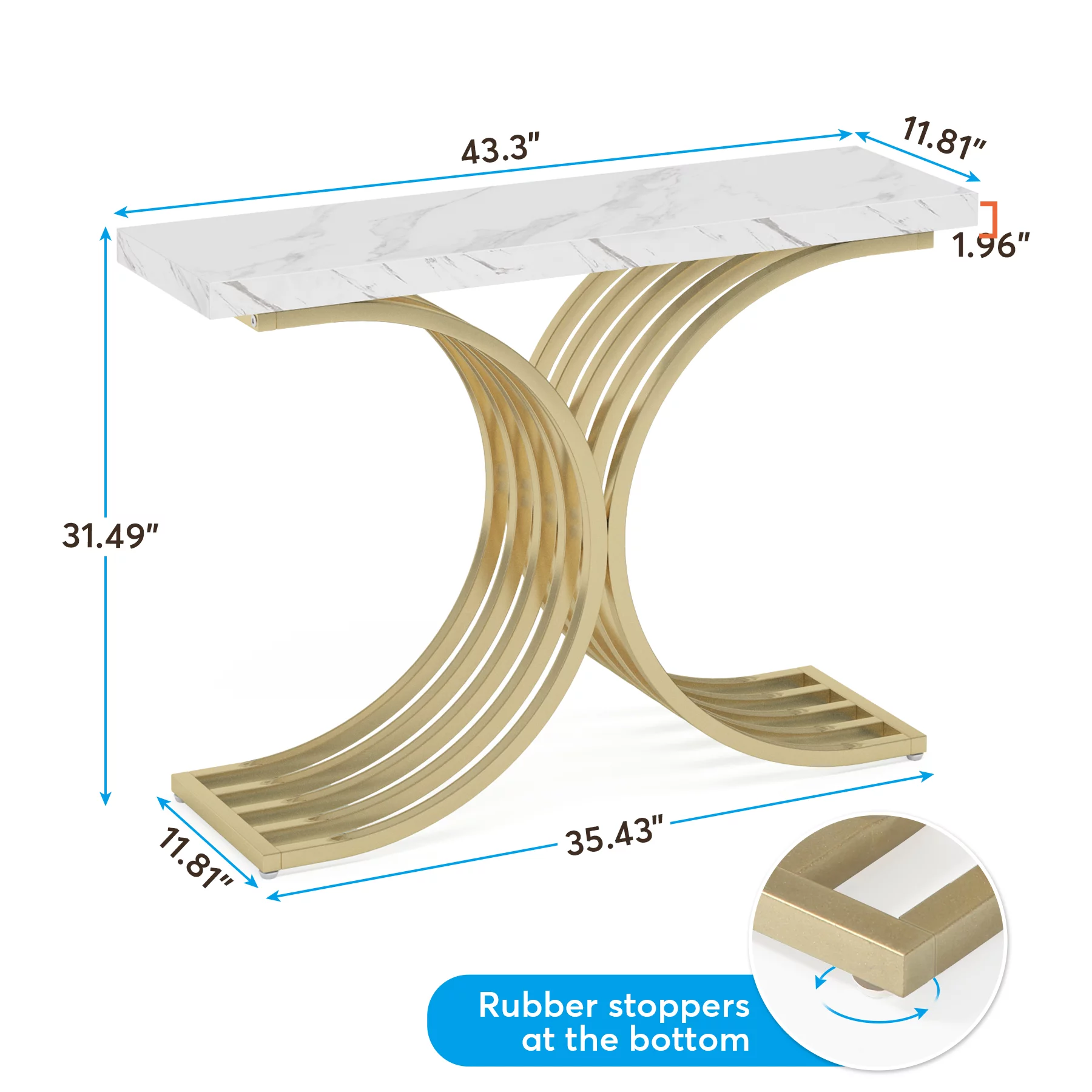X-Base Gold and White Console Table, Narrow Sofa Accent Table with Faux Marble Top for entrance, Hallway