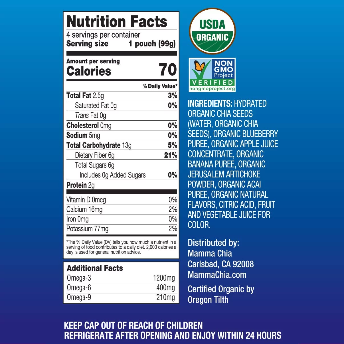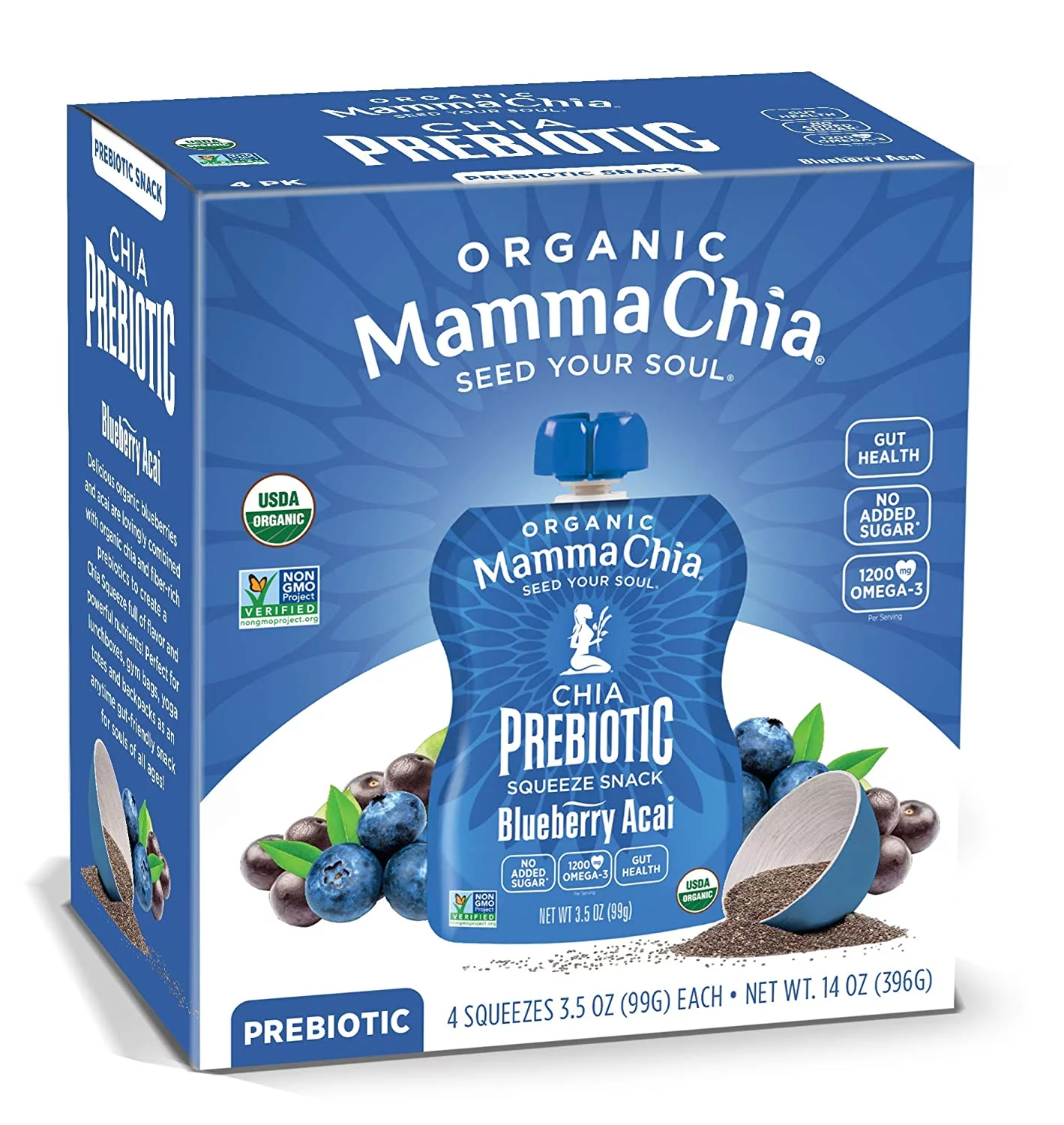 Mamma Chia, Organic Chia Prebiotic Squeeze, Blueberry Acai, 4 Squeezes, 3.5 oz Pack of 2