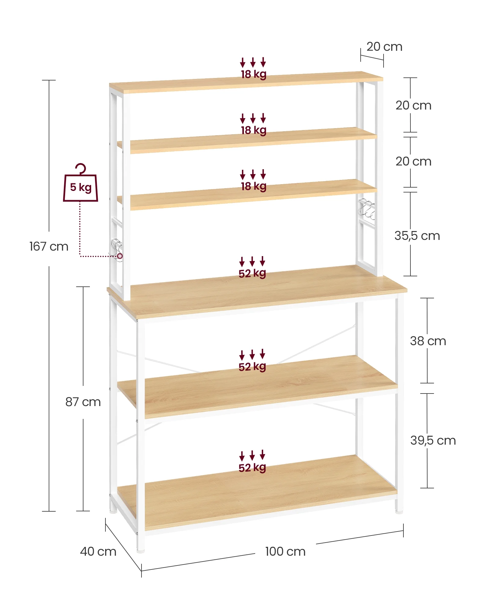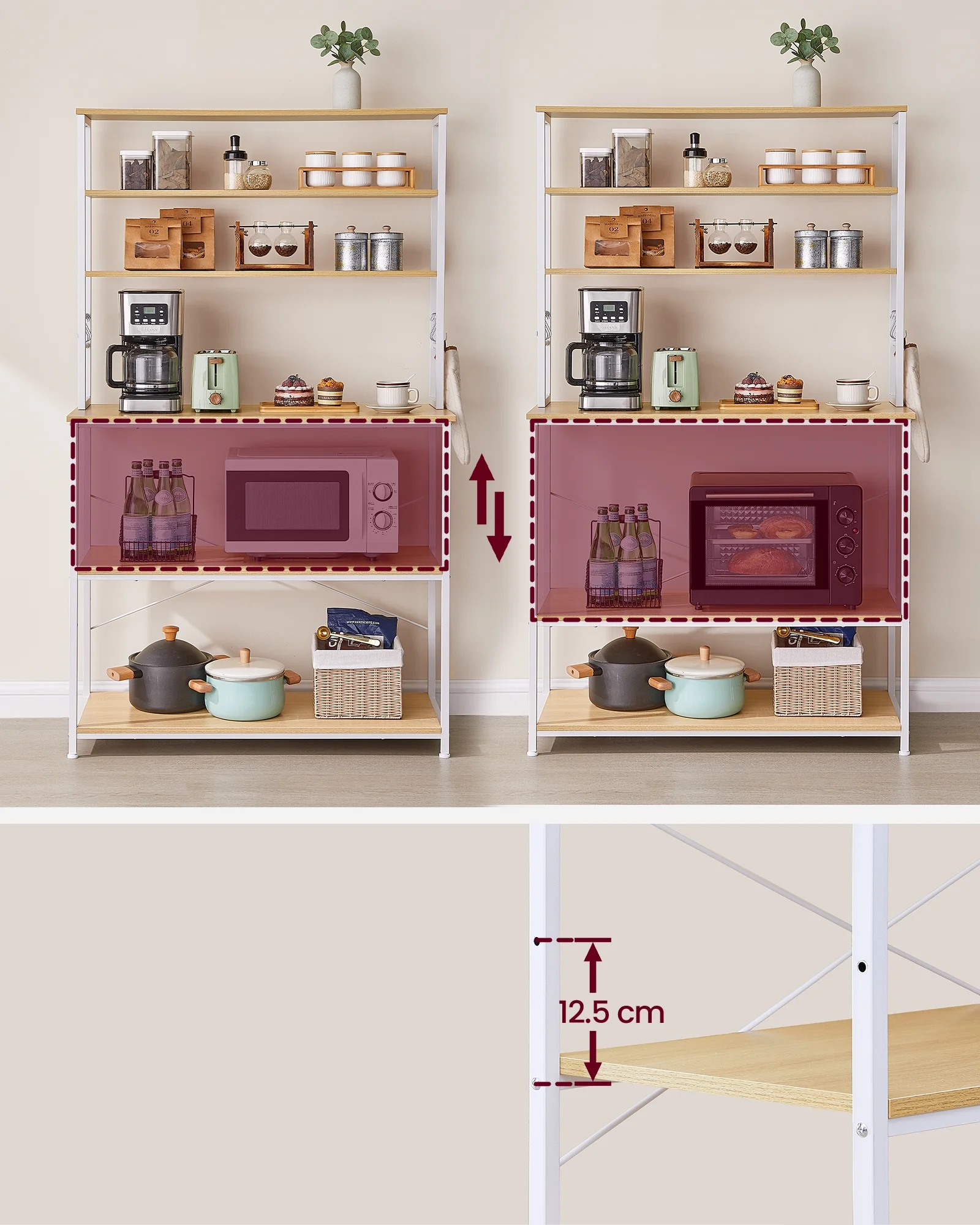VASAGLE Coffee Bar Kitchen Baker’s Rack with Storage Storage Shelf Island with 6 Hooks Microwave Stand Oak and White