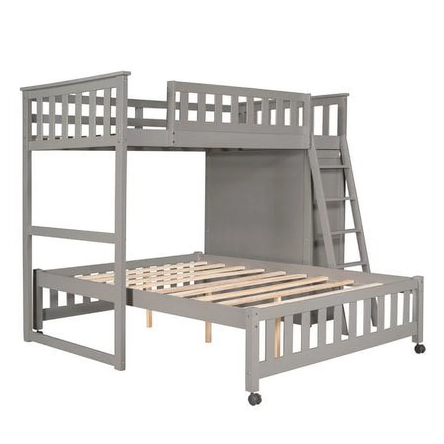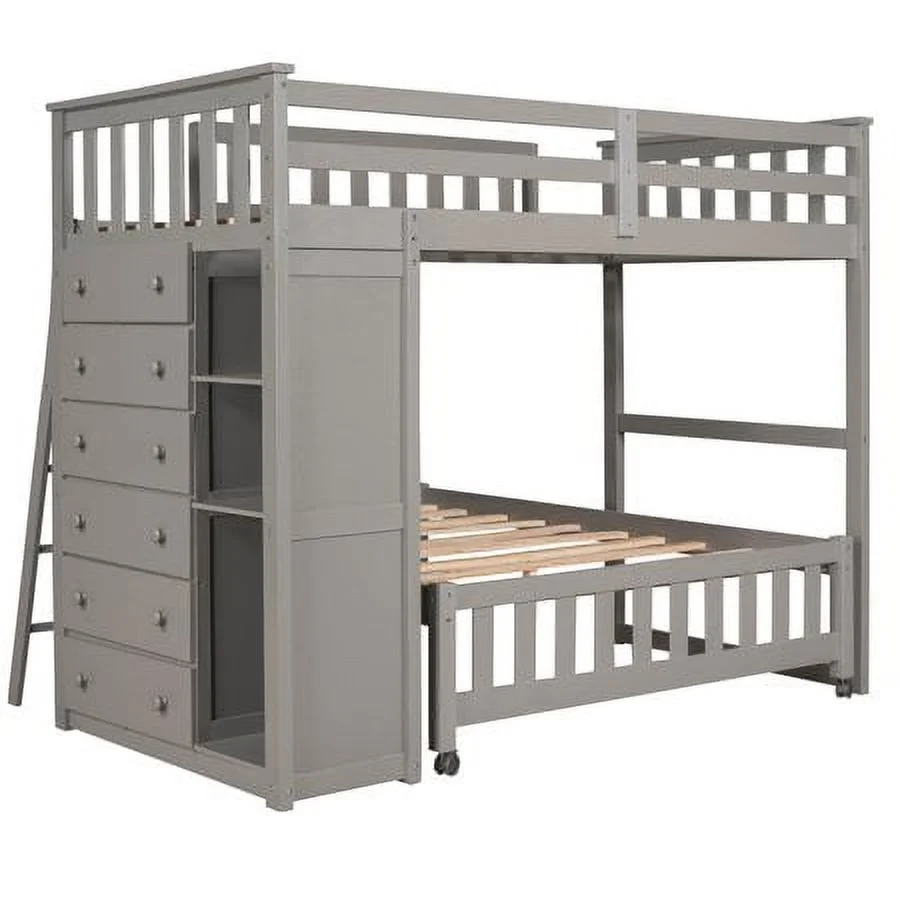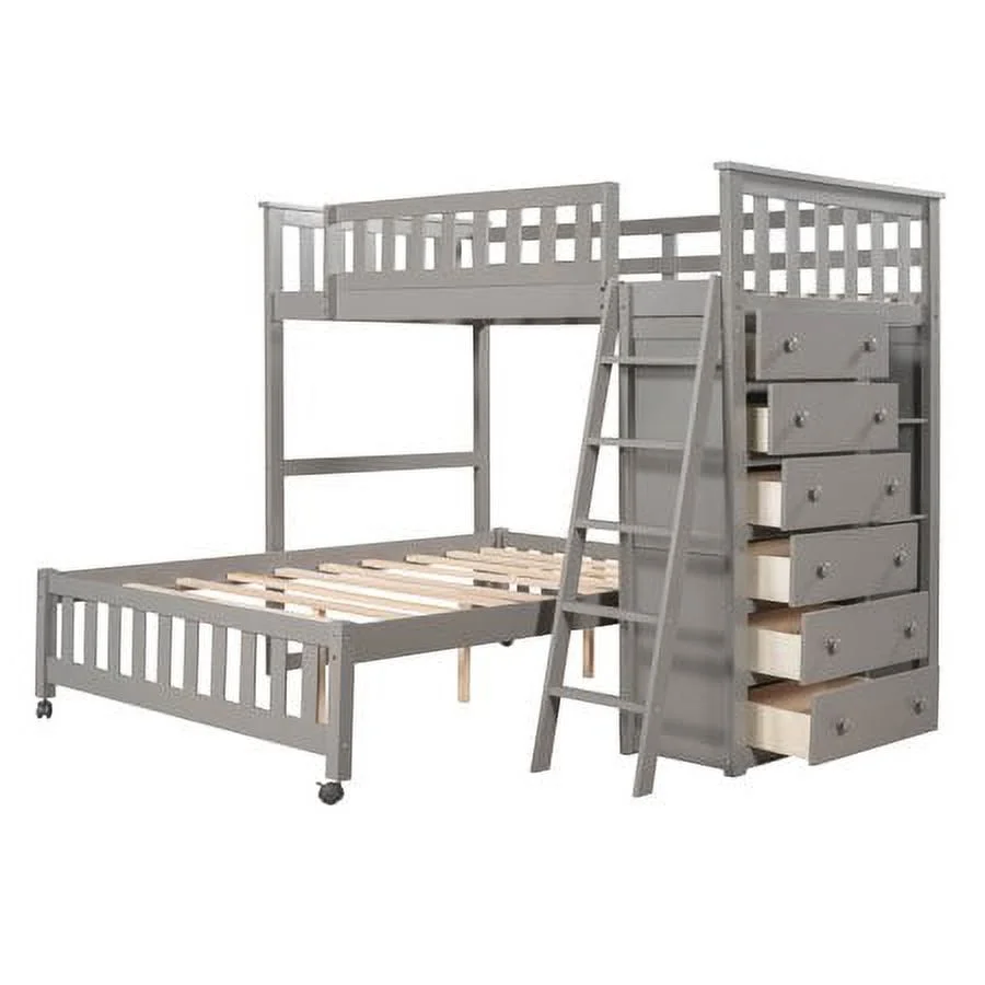 CHURANTY Twin Over Full Wooden Bunk Bed with 6 Storage Drawers and 3 Flexible Shelves, Twin Loft Bed with Movable Lower Bed, for Kids Teens Adults, Gray