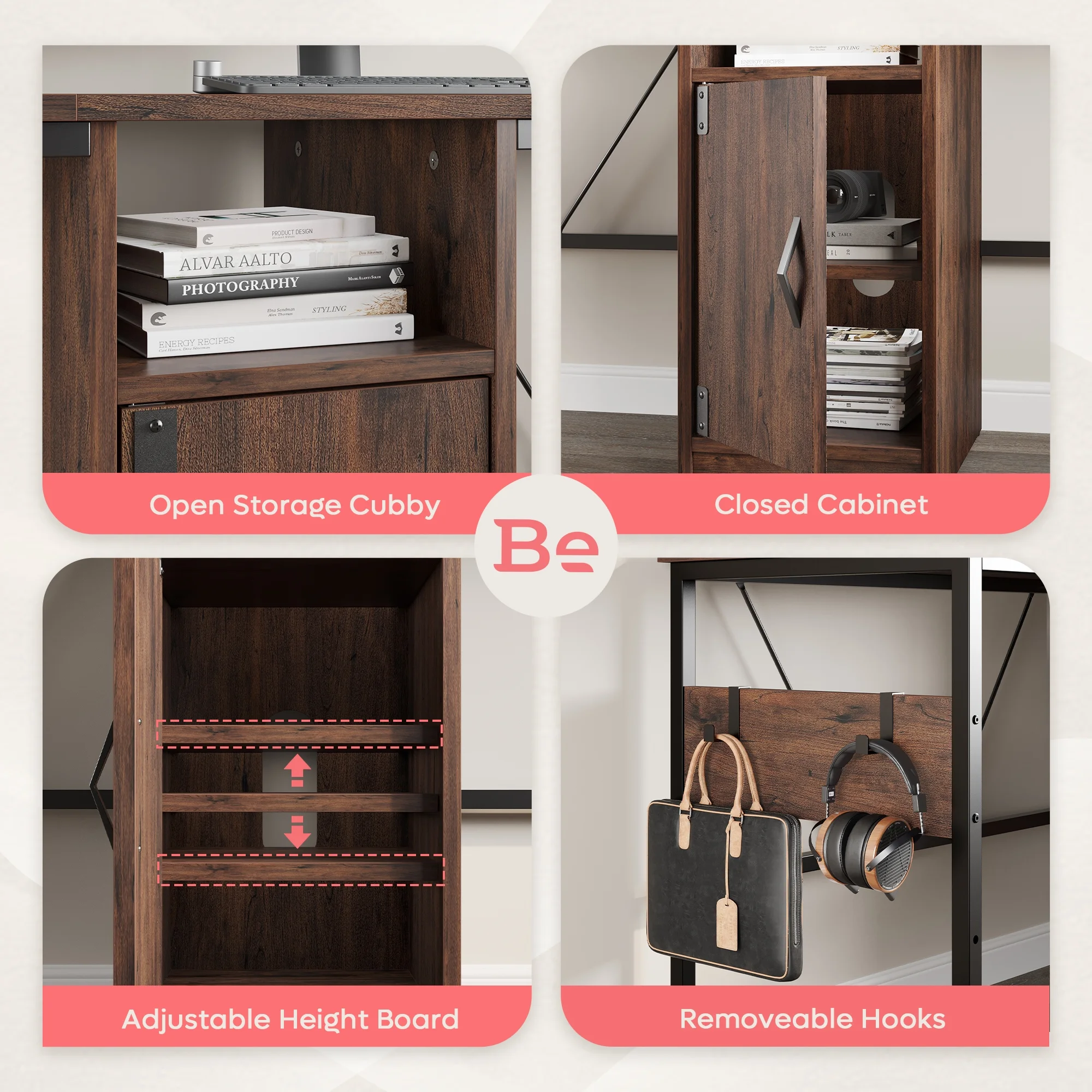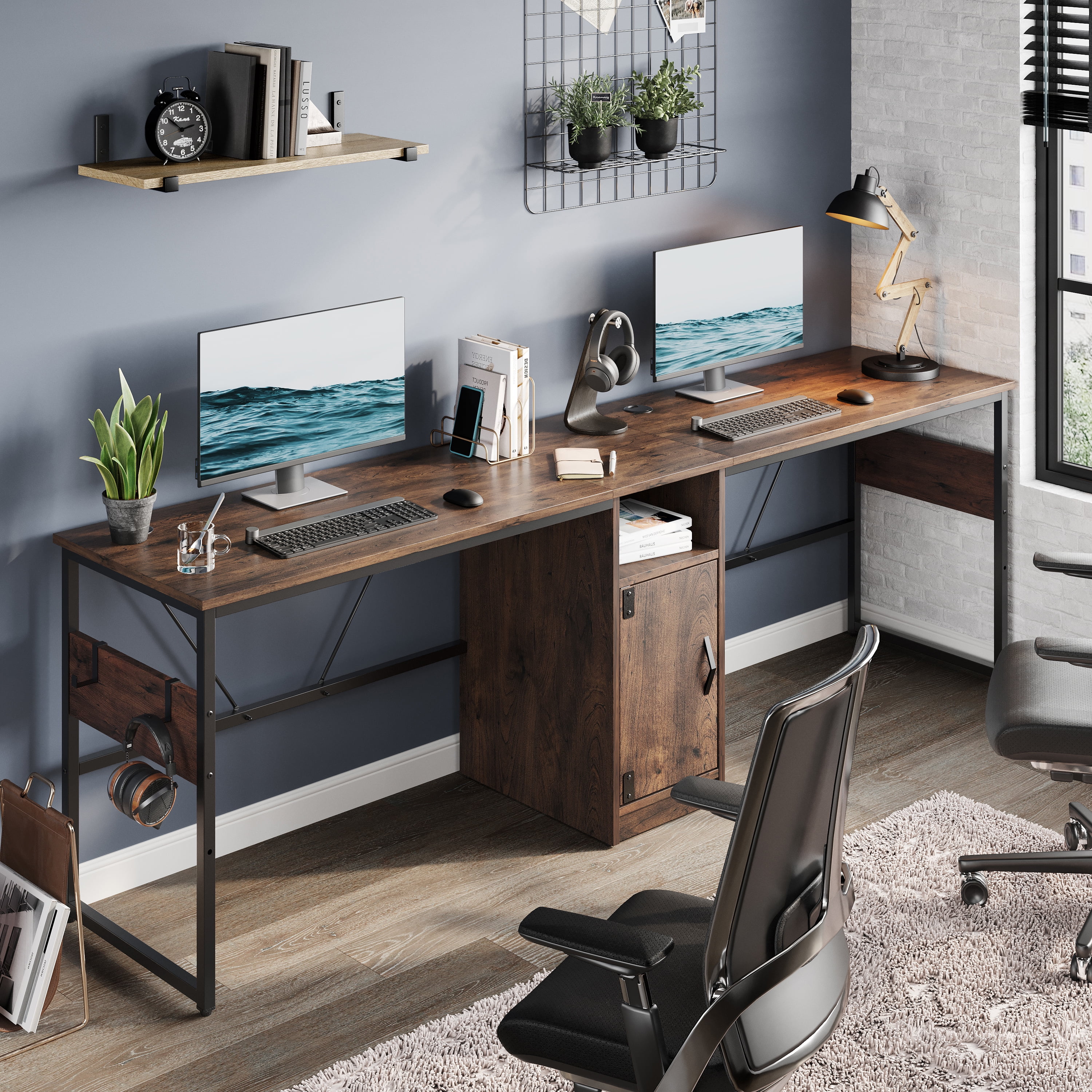 Bestier Reversible 60 inches L Shaped Computer Desk with Storage Cabinet Long Desk for 2 Person Cherry