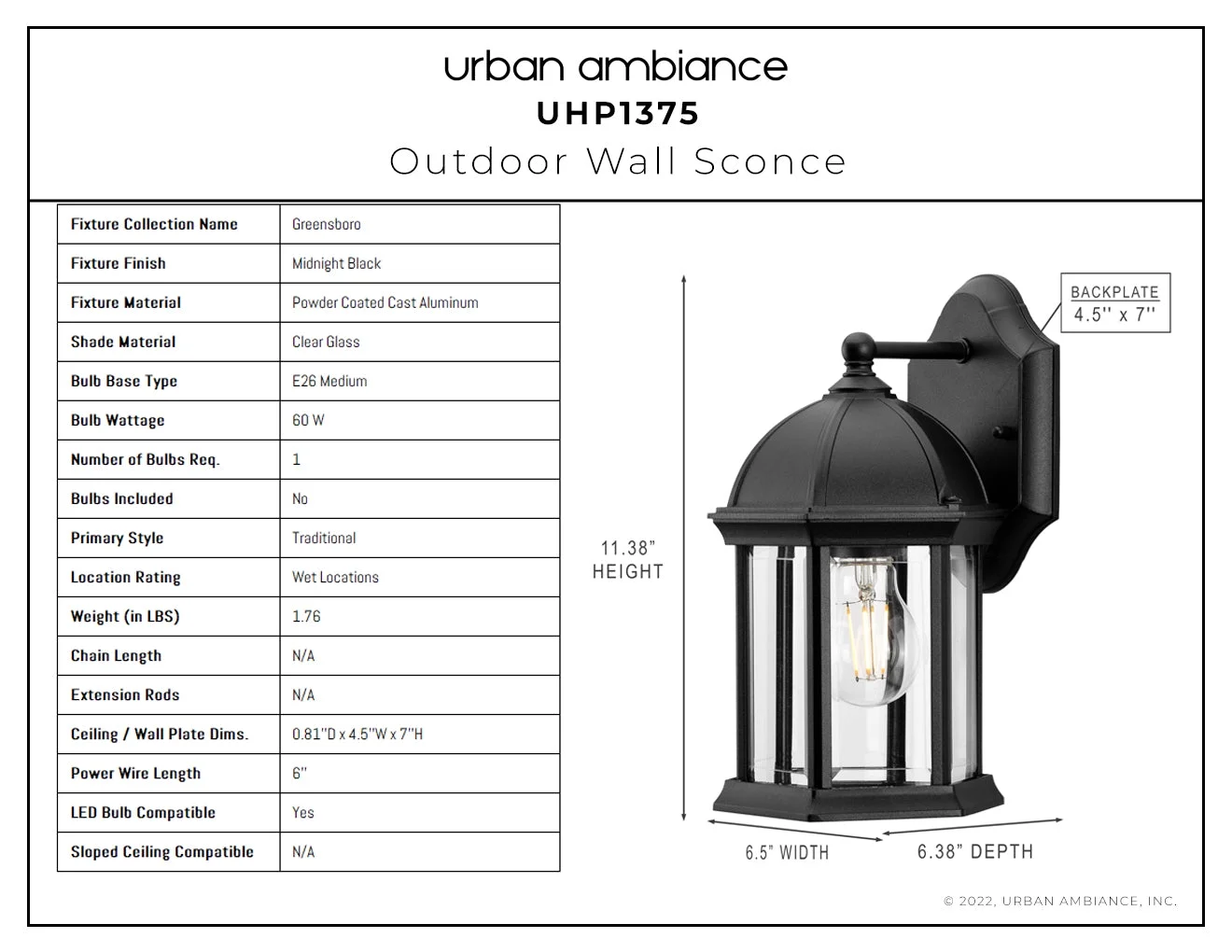 Luxury Tudor Wall Sconce, 11.375H x 6.5W, with Traditional Style, Midnight Black, UHP1375 by Urban Ambiance