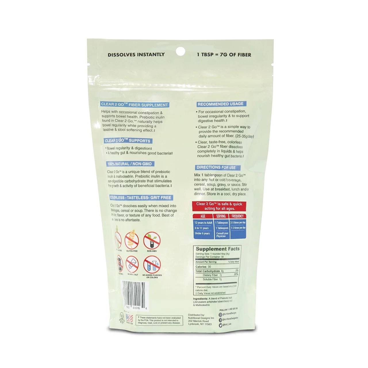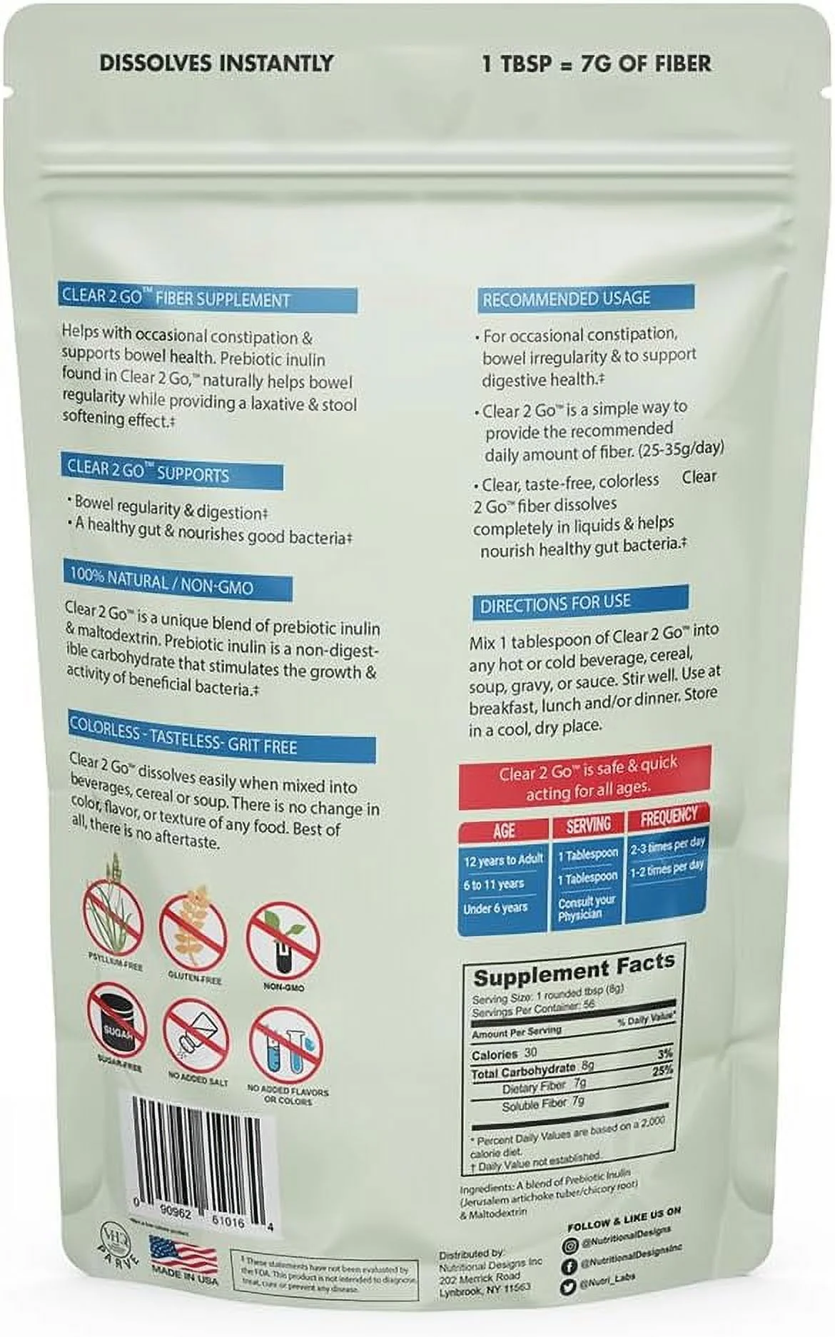 Clear 2 Go Support Bowel Health Regularity & Digestion. Fiber Supplement by Nutritional Designs No Flavor Sugar Free, 15.8 oz