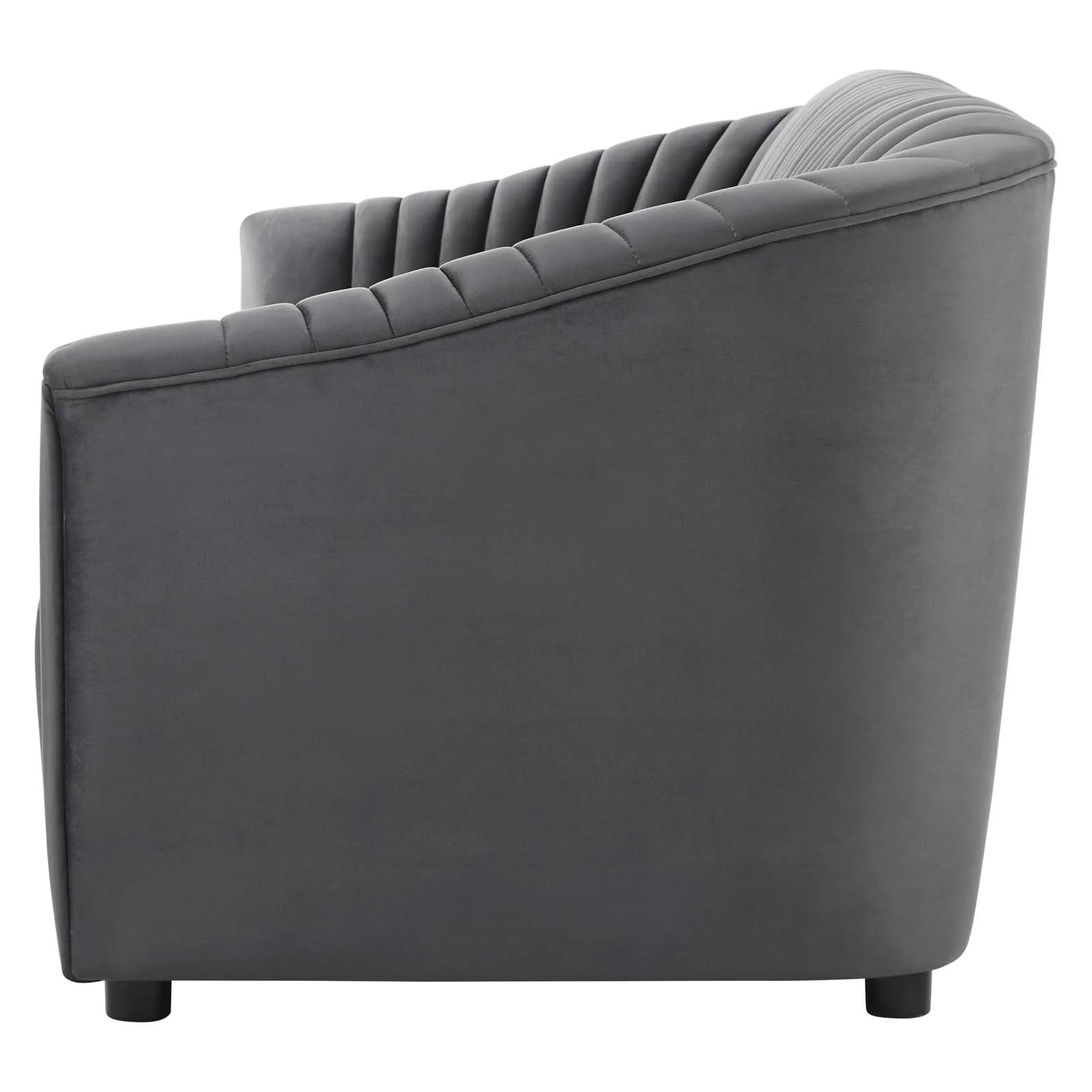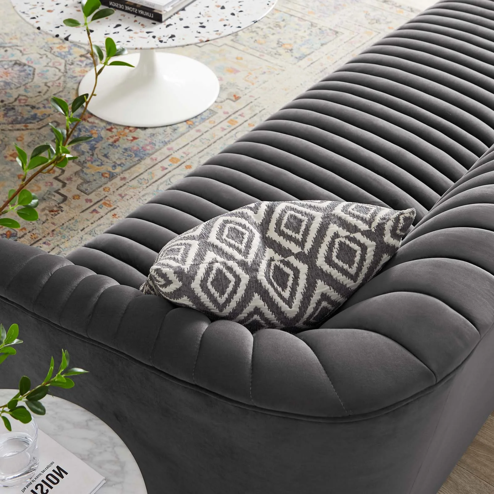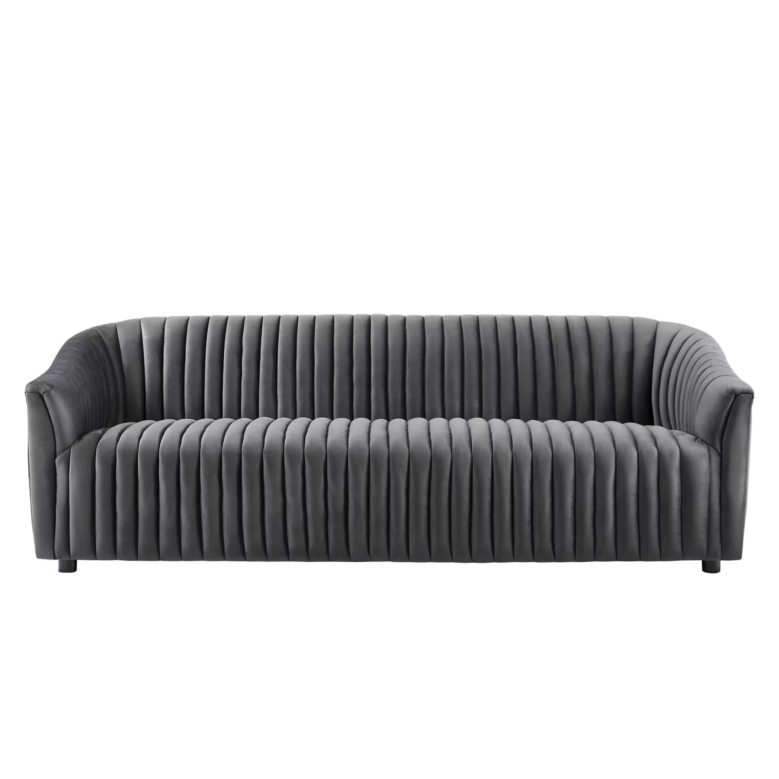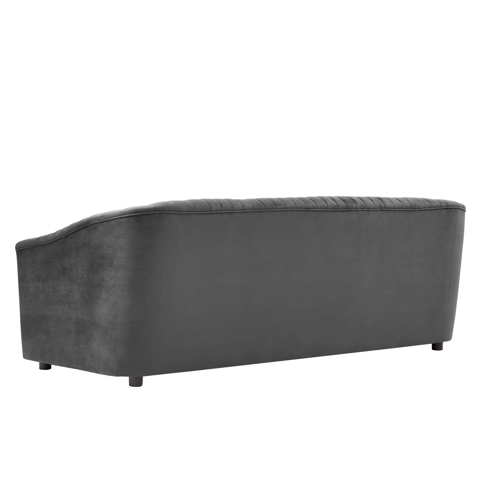 Tufted Sofa, Charcoal Grey Gray, Velvet, Modern Contemporary, Mid Century Living Hotel Lounge Cafe Lobby