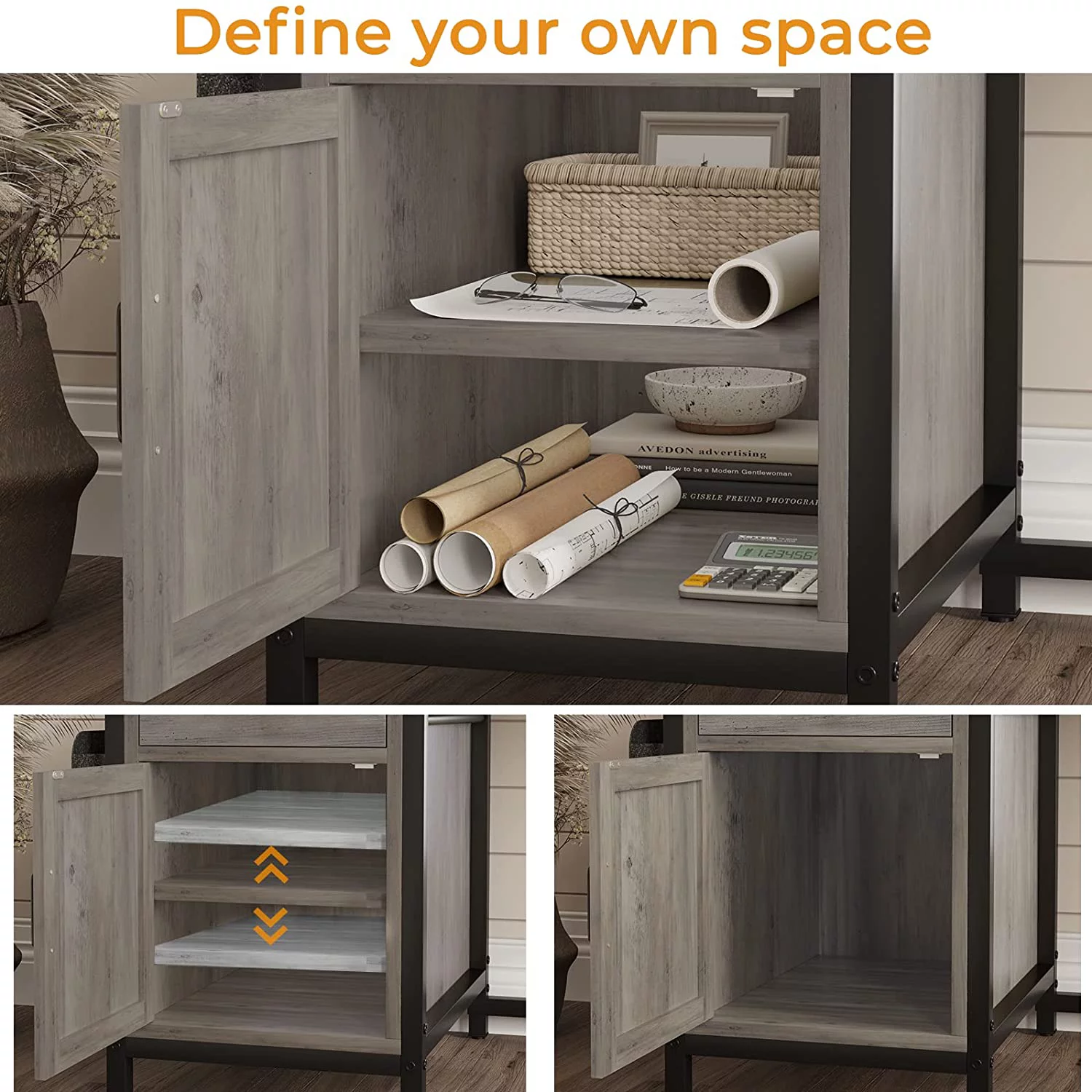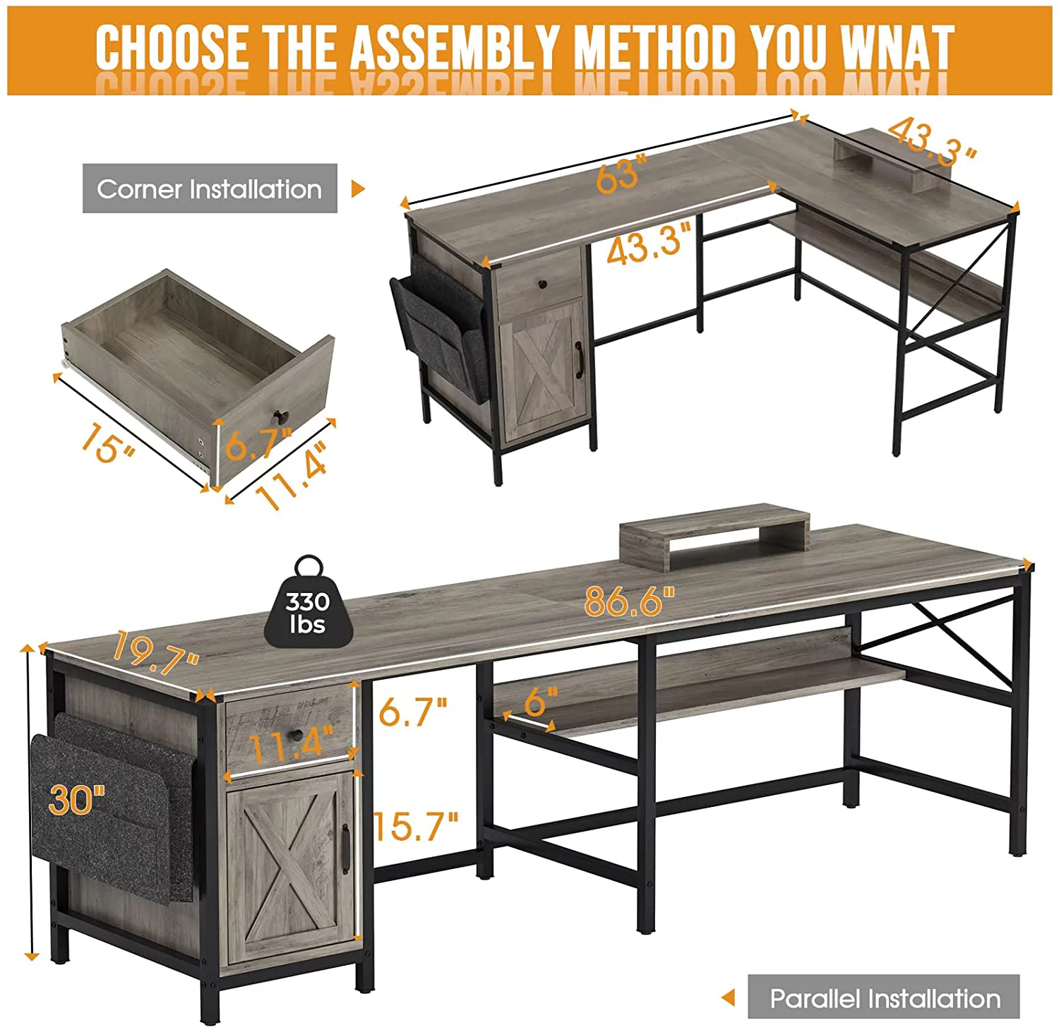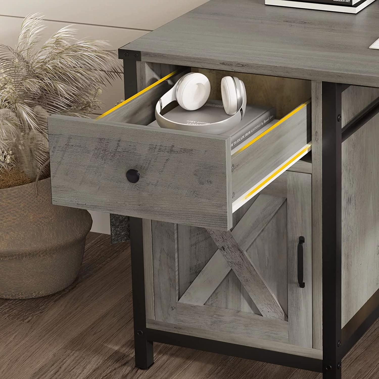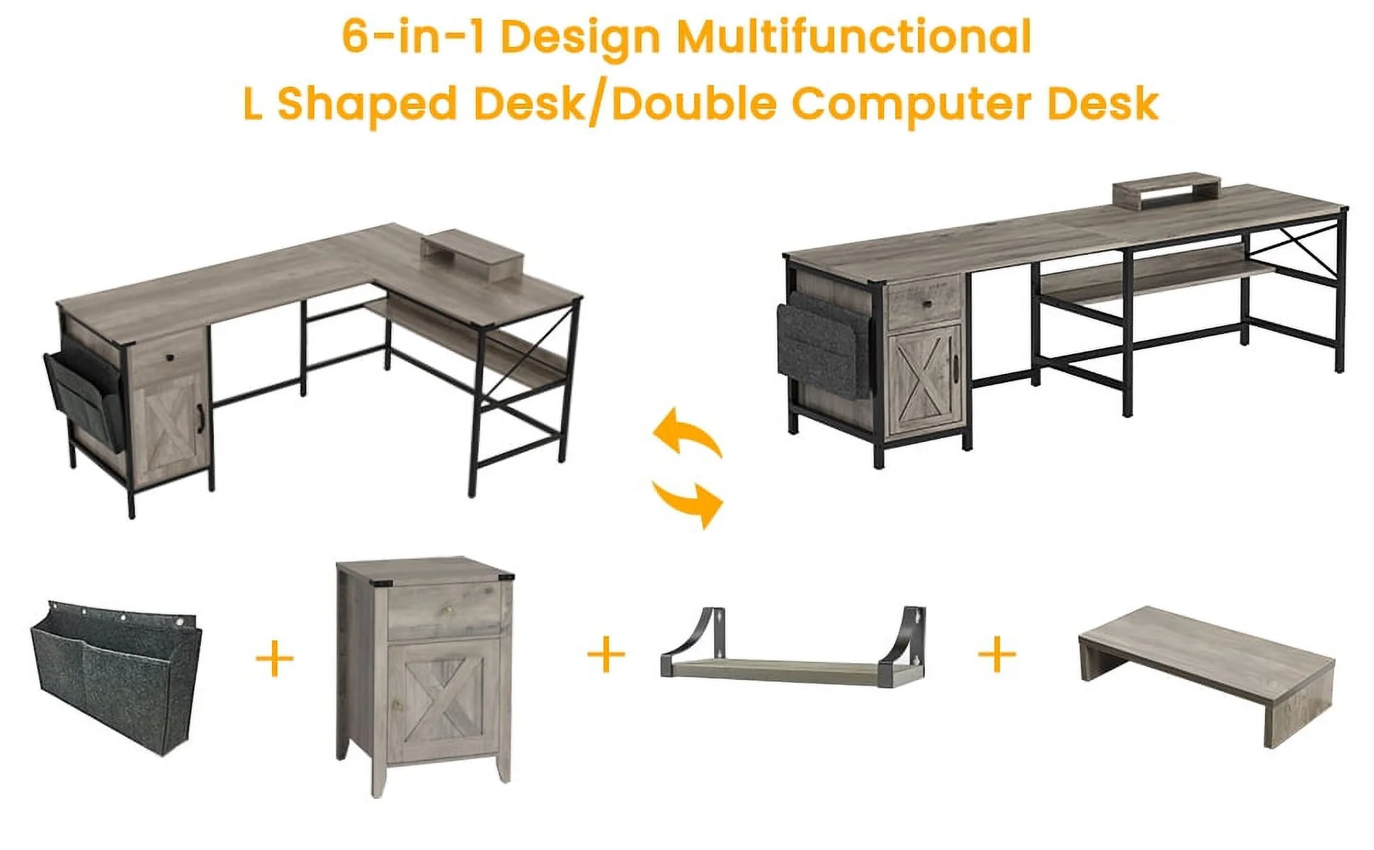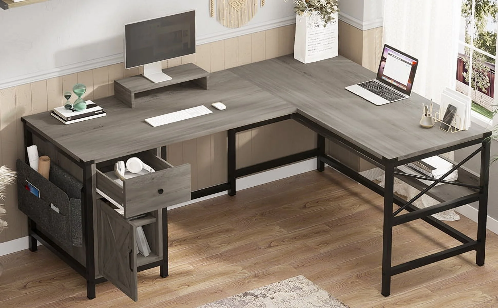 Elrhdgi Office Desk with Drawer and Storage Cabinet,L Shaped Office Desk Computer Desk with Power Strip and Monitor Stand,Grey