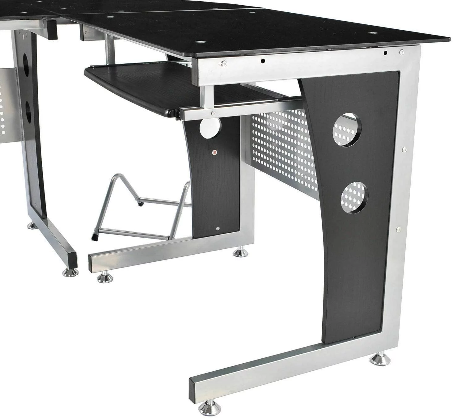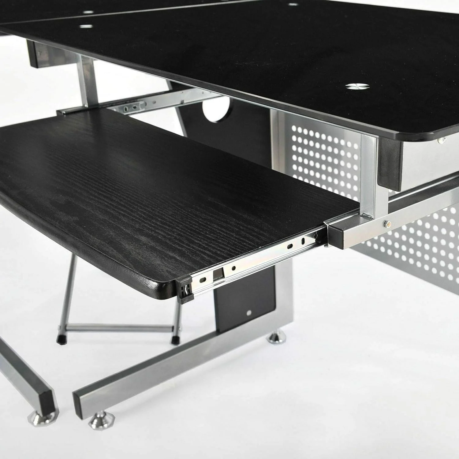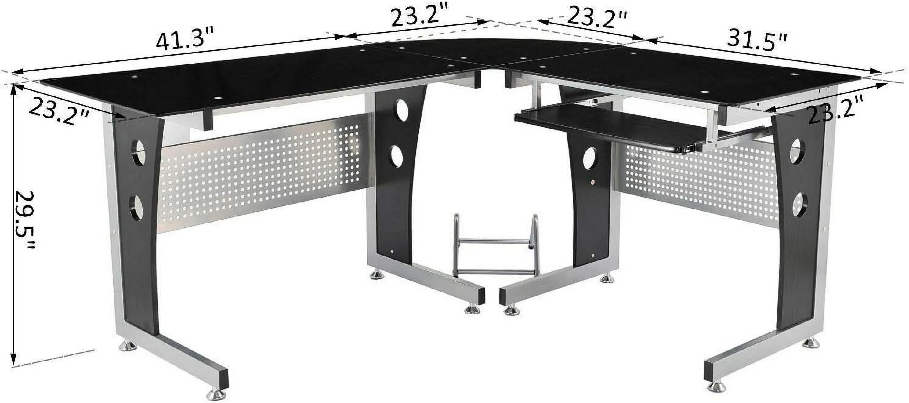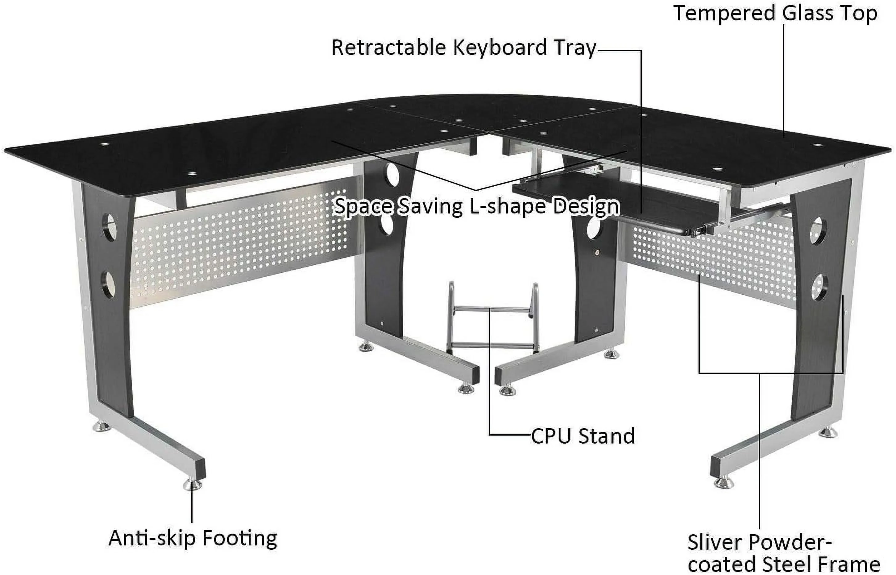 Black L-Shape Corner Tempered Glass Top Computer Desk Slide-Out Keyboard Tray CPU Tower Stand Laptop Notebook PC Workstation Study Writing Reading Gaming Table Perfect For Home Dorm Room Or Office Use