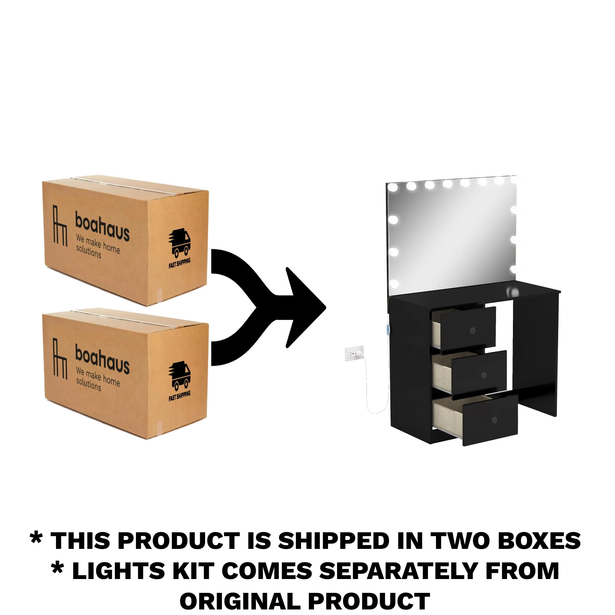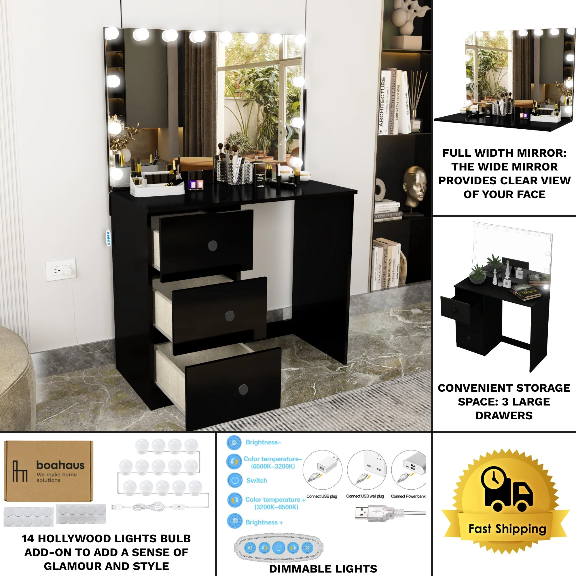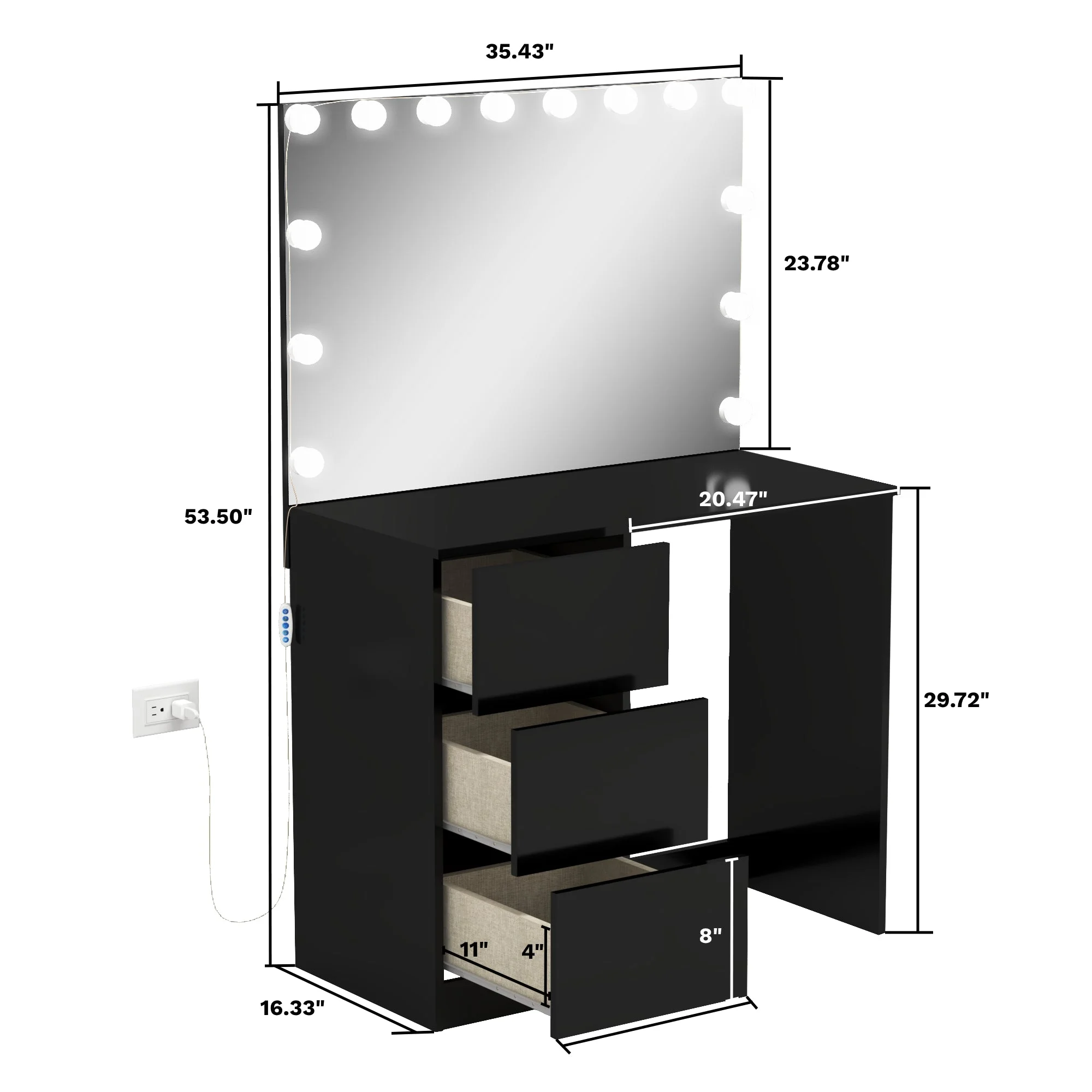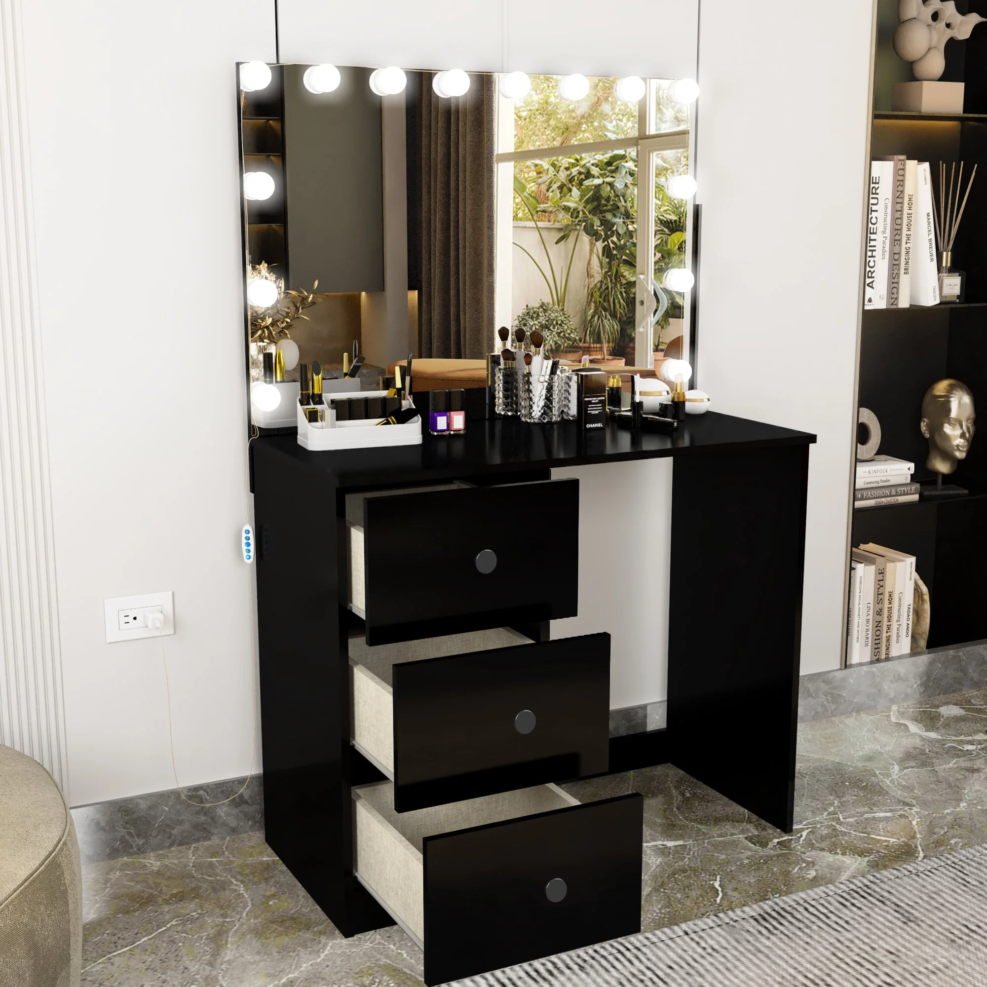 Ember Interiors Leia Mini Modern Vanity Table Lights, 3 Drawers, Mirror, Black Painted, for Bedroom