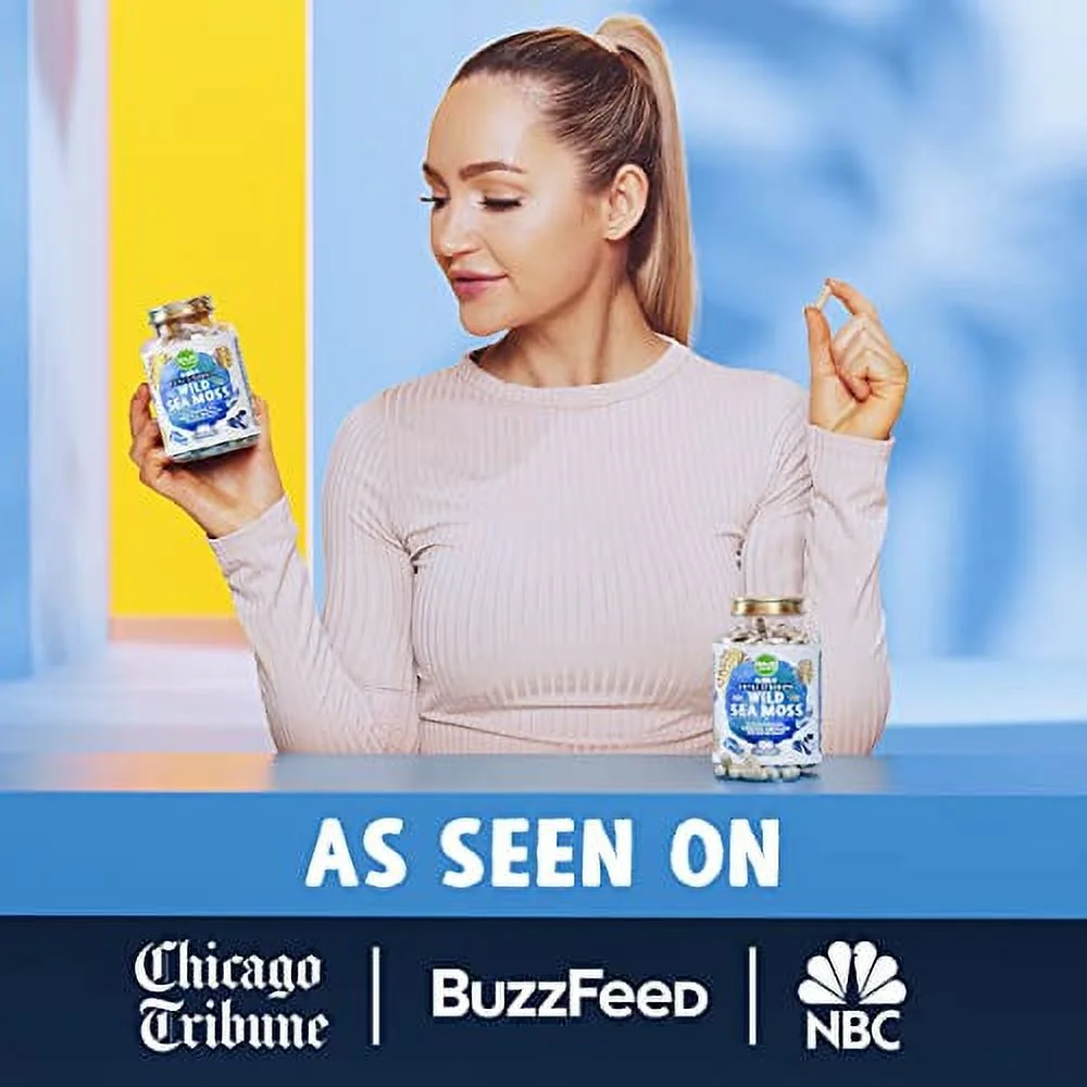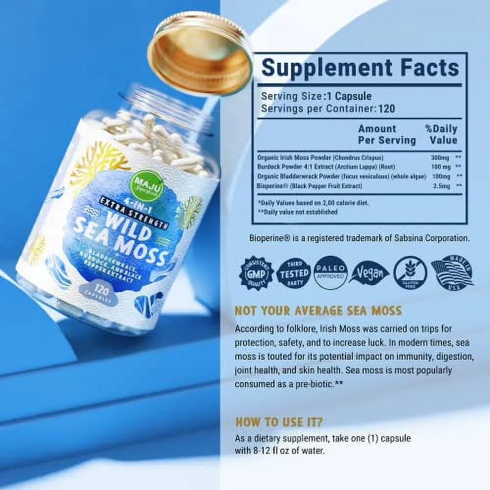 MAJU Wild Irish Sea Moss Capsules (120ct), Stronger Than Gel, 4-in-1 w/Bladderwrack + Burdock Root, Organic, Sebi Inspired, Raw, Seamoss Pills Powder, Wild, 1 Bottle