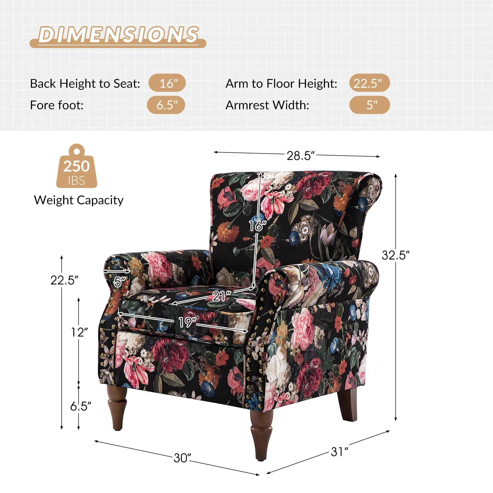 HULALA HOME Avelina Nailhead Trim Comfy Accent Armchair with Rolled Arms BLACK Floral