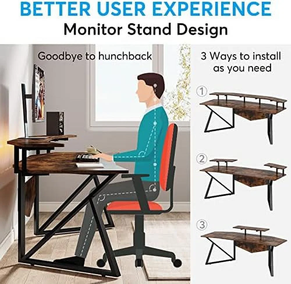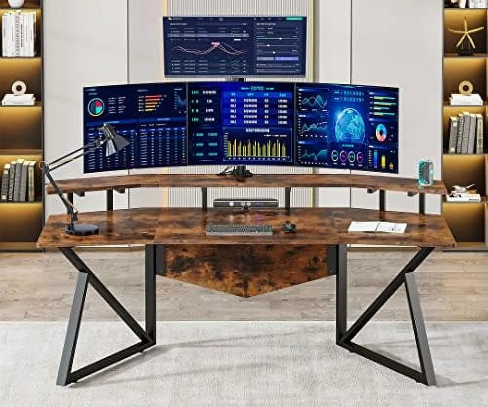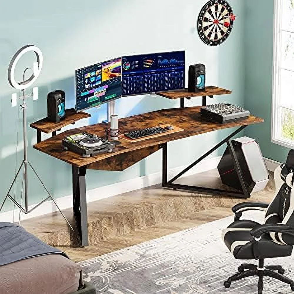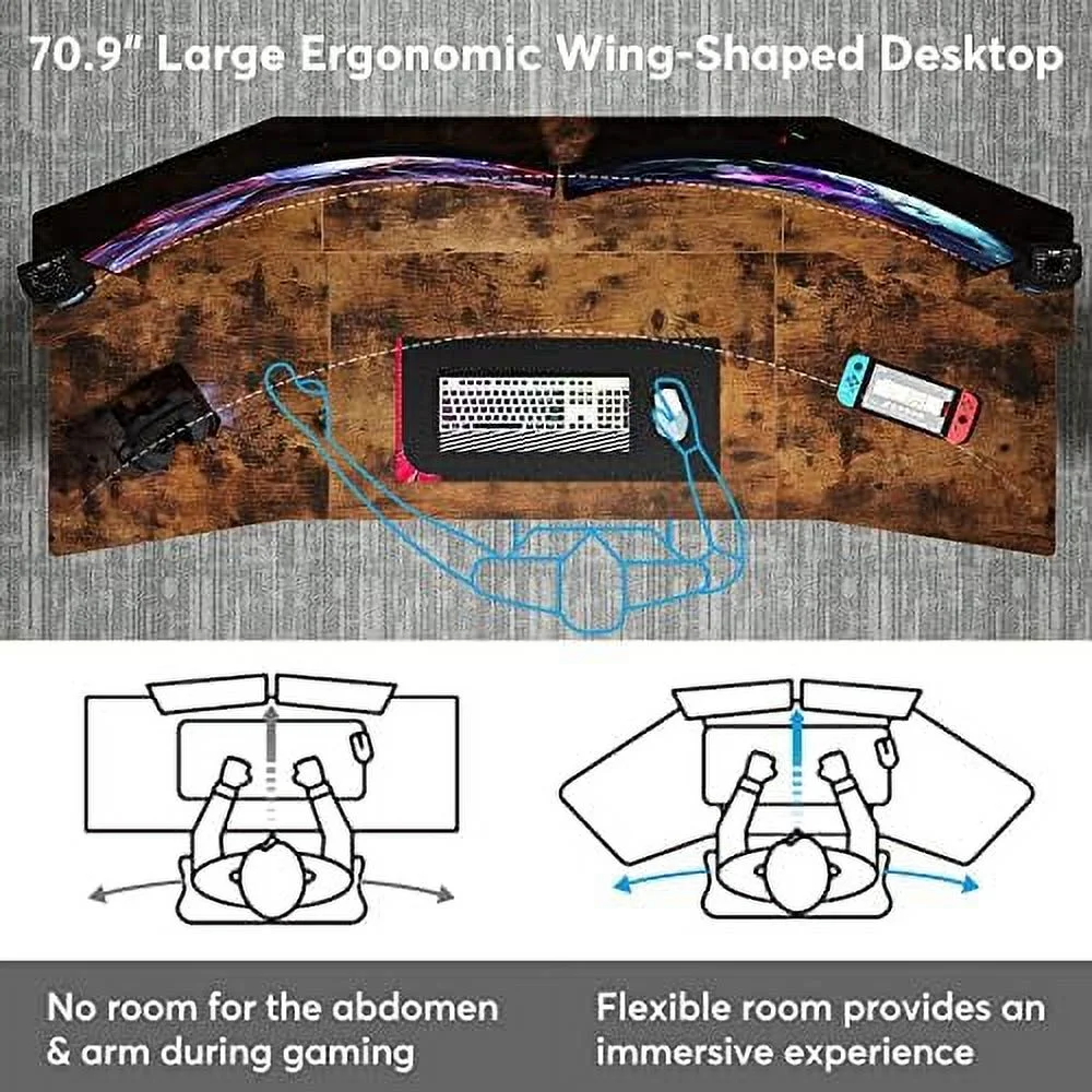 Computer Desk 70.9" Large Office Desk with Monitor Stand Wing-Shaped Gaming Studio Desk Study Table Workstation for Live Streamer Rustic Brown