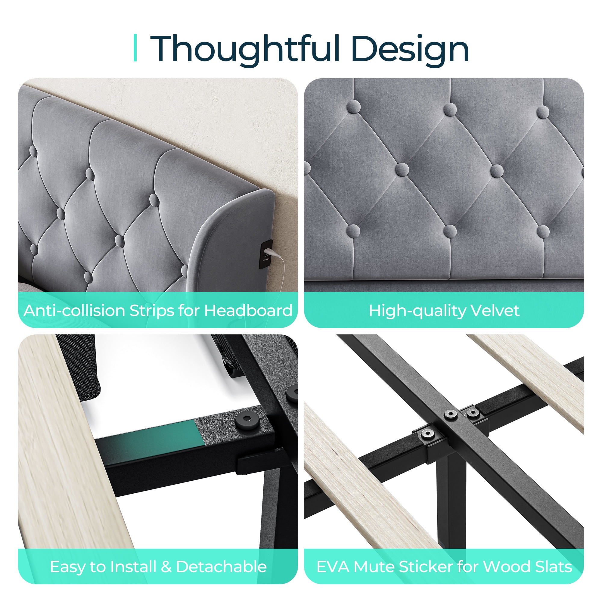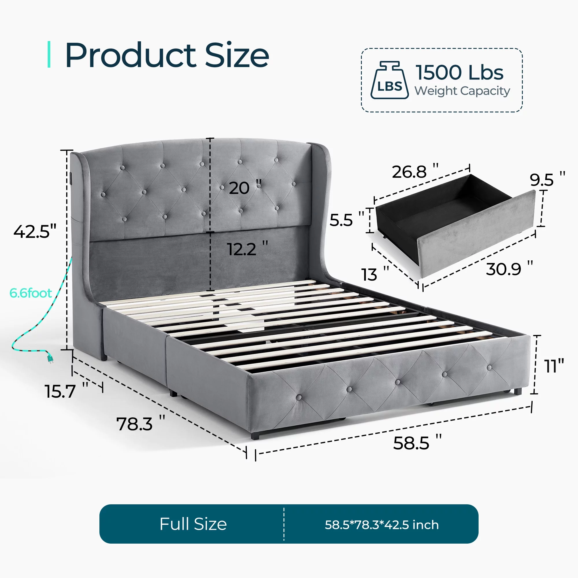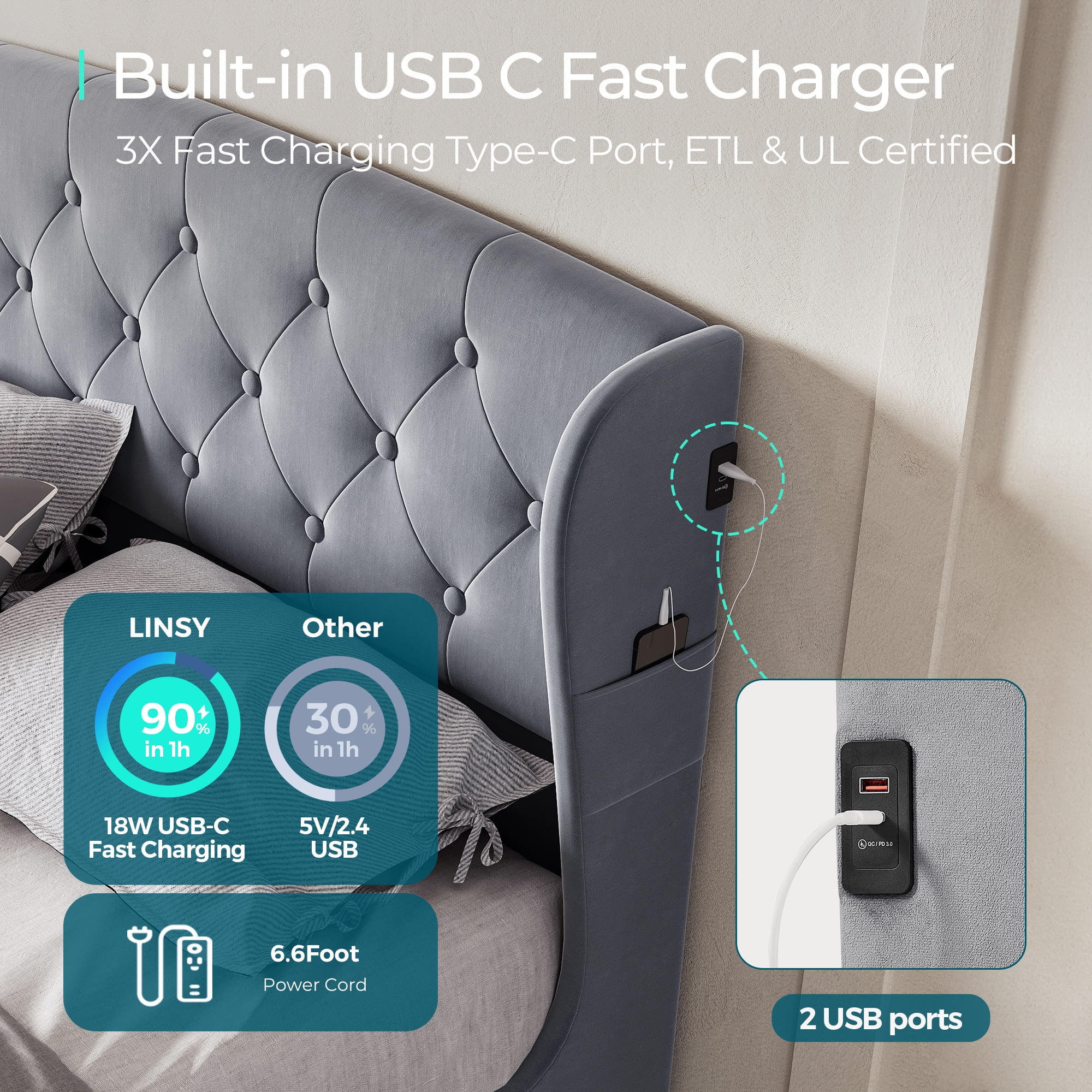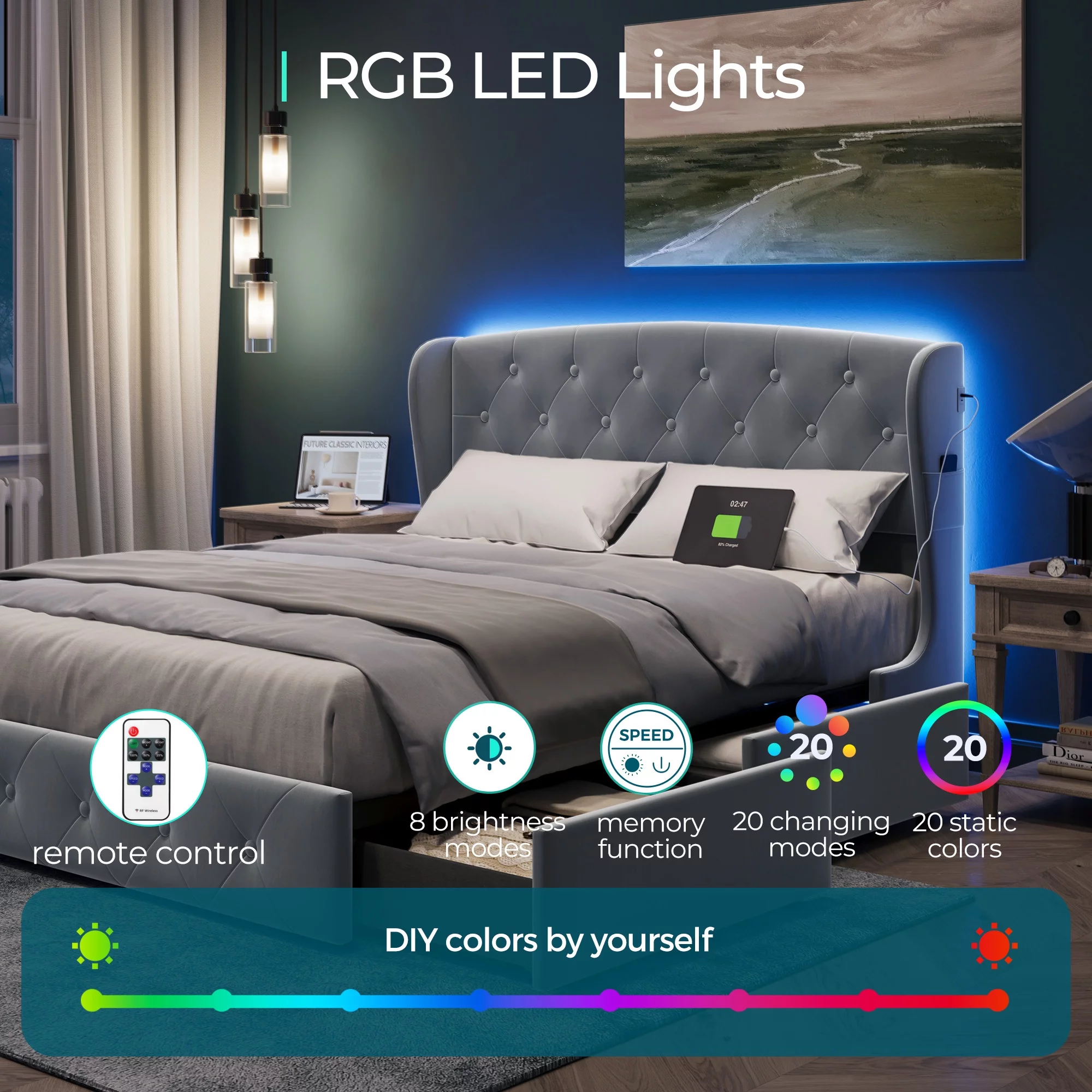 Linsy Home Upholstered Full Size Platform Bed Frame with Headboard and 4 Storage Drawers, Storage Bed with Remote RGB Lights & Fast Charger, No Box Spring Needed, Light Grey