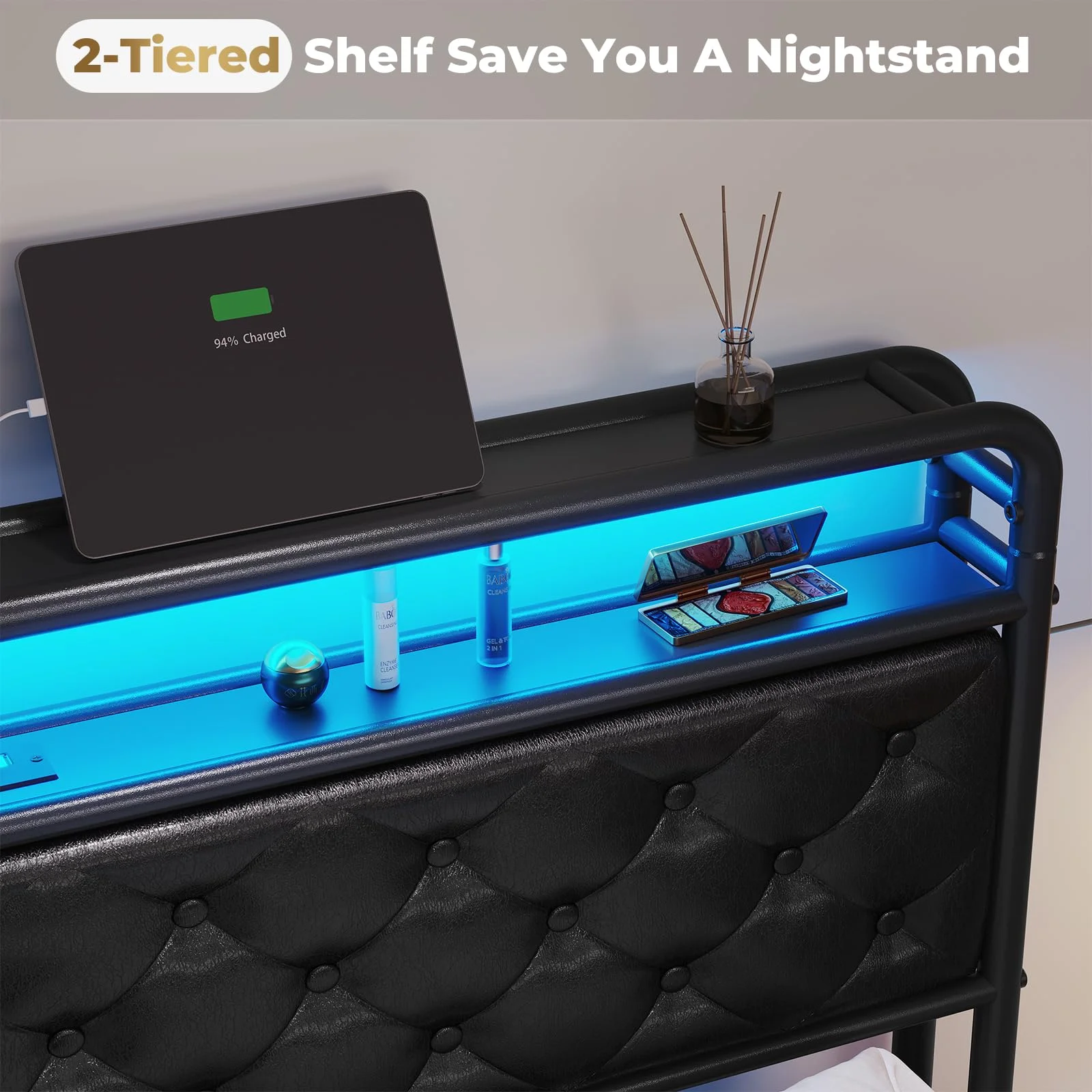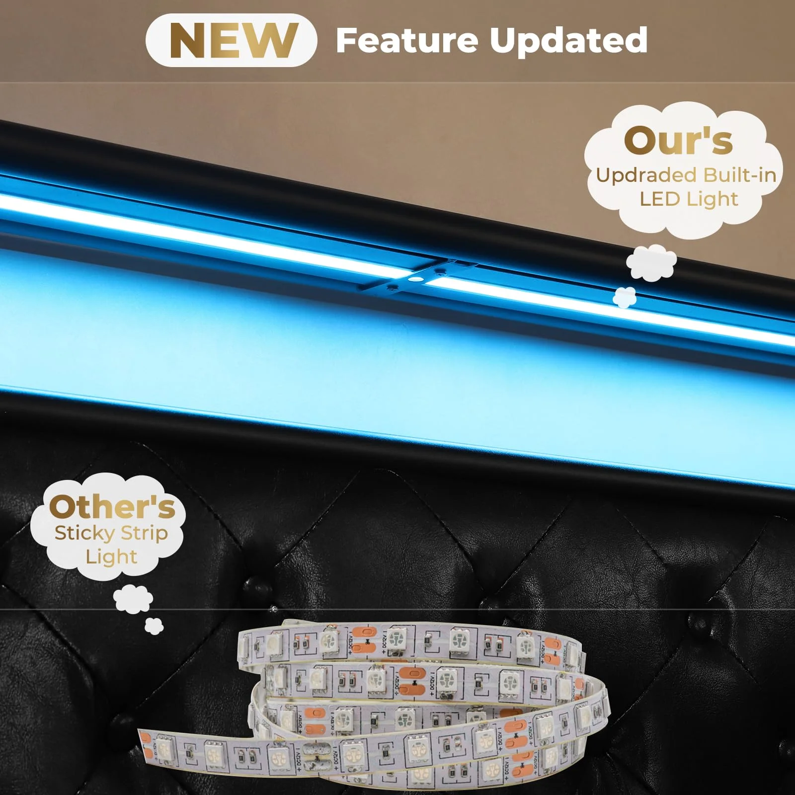 ADORNEVE King Size Bed Frame with Built-in LED Light Headboard, USB Ports and Outlets, Faux Leather Upholstered Platform Bed Frame with Diamonds Tufting Design, Black