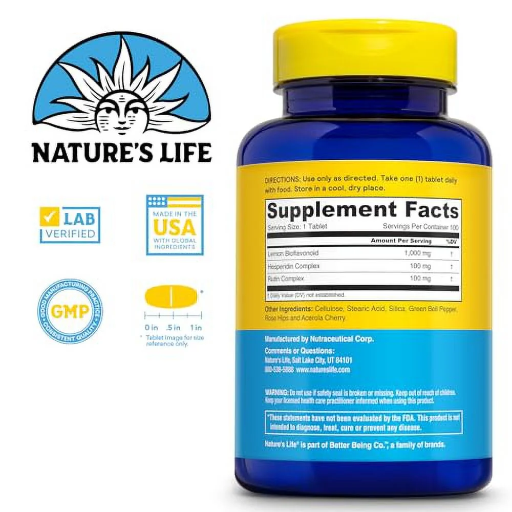 Nature's Life Lemon Bioflavonoids 1000mg - Citrus Bioflavonoids Supplement with Hesperidin and Rutin - Antioxidant and Cellular Support, Vitamin C Absorption - 60 Day Guarantee, 100 Serv, 100 Tablets
