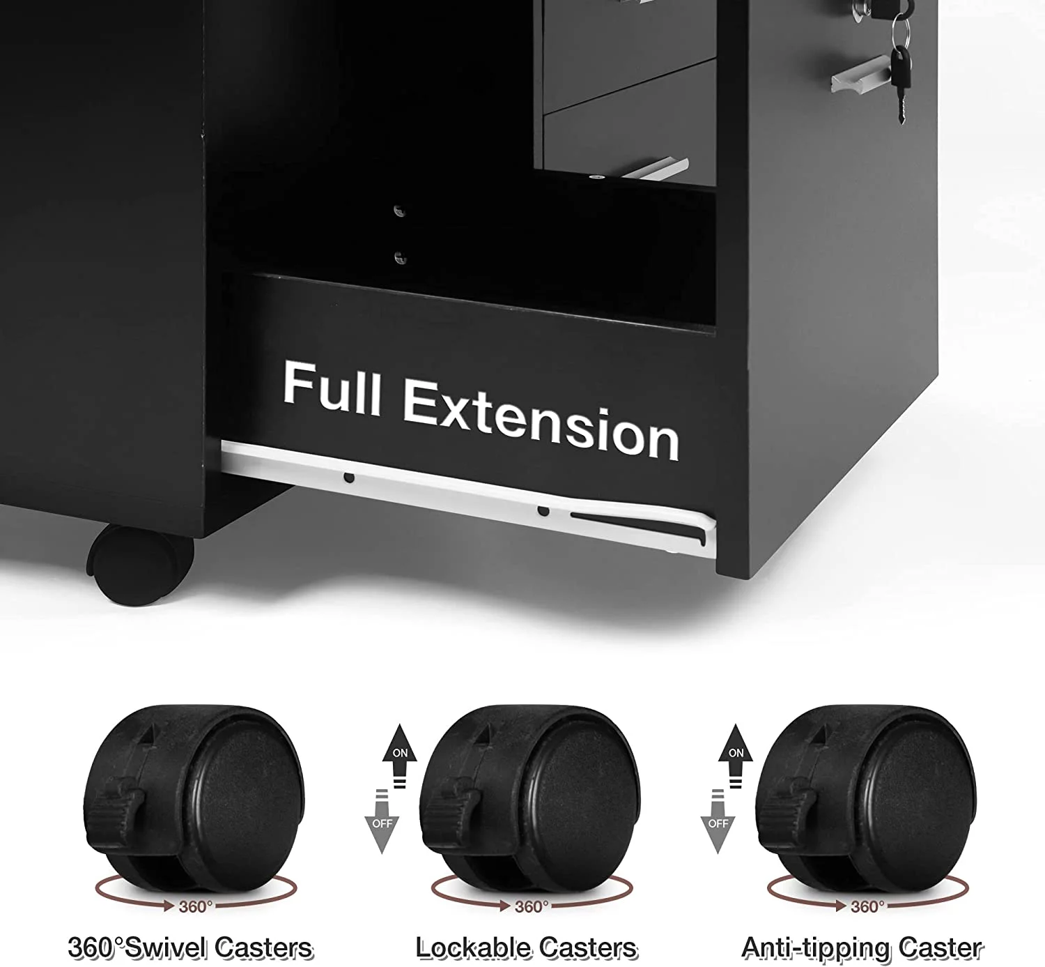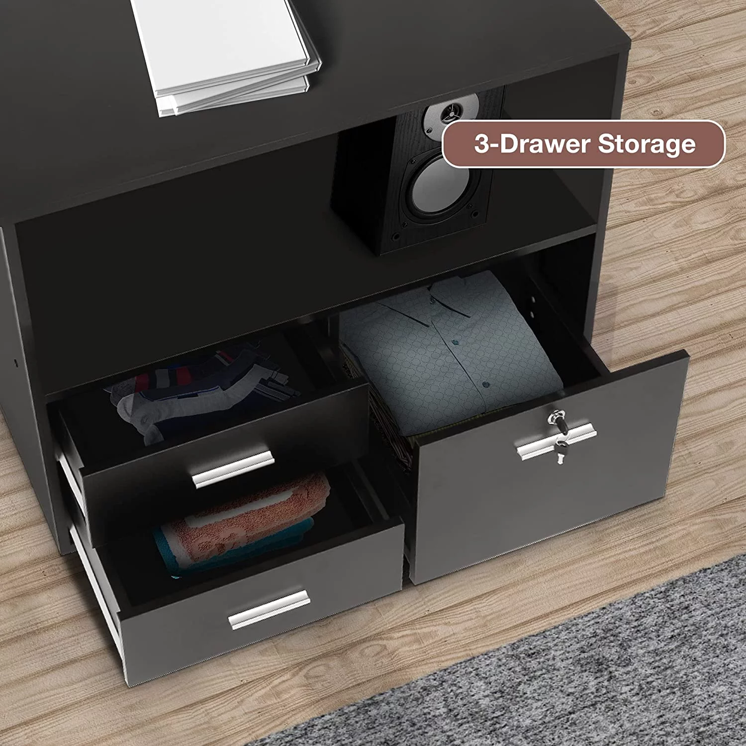 Karmas Product Wood File Cabinet with Lock 3 Drawer Large Mobile Lateral Filing Cabinet with Rolling Wheel Printer Stand with Open Storage Shelves for Home Office, Black