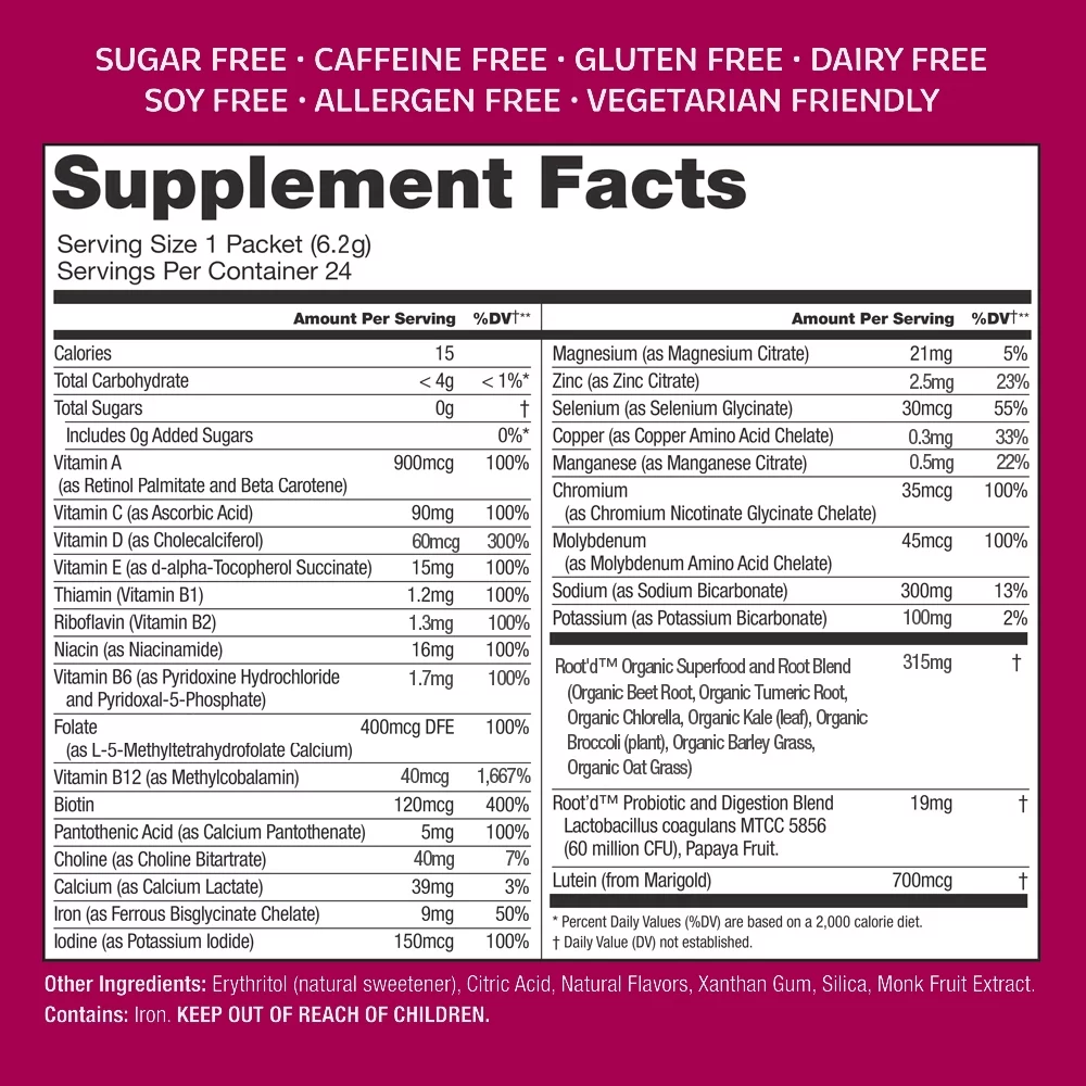 Root'd Multivitamin Powder for Women - 25 Vitamins & Minerals with 3x Electrolytes, 9 Organic Superfoods, Probiotics & Enzymes, Sugar-Free Multivitamin & Hydration | 24 Vitamin Drink Mix Packets