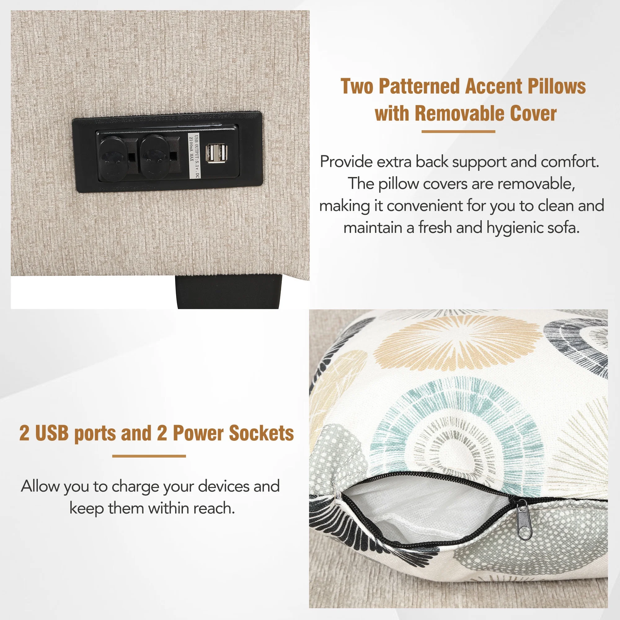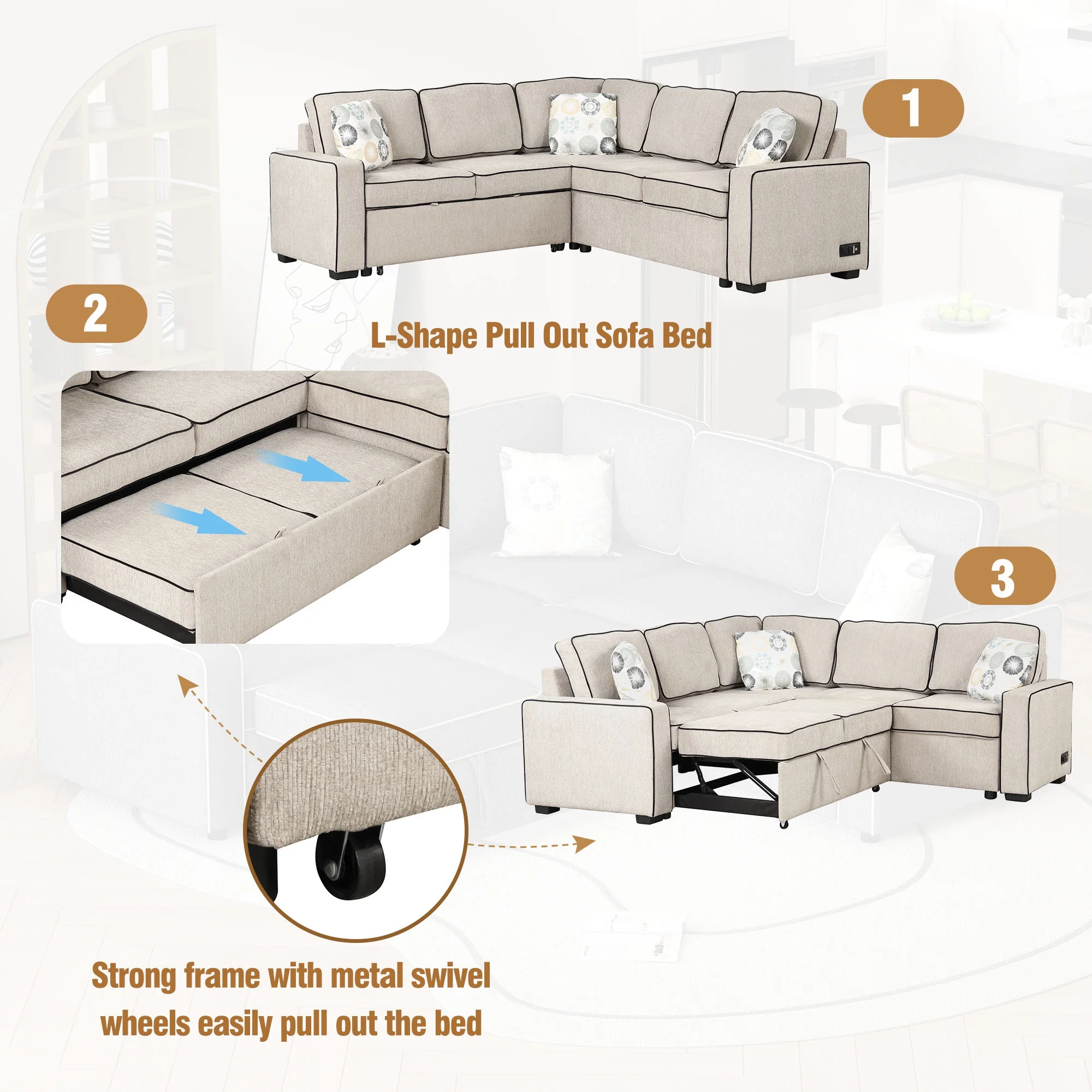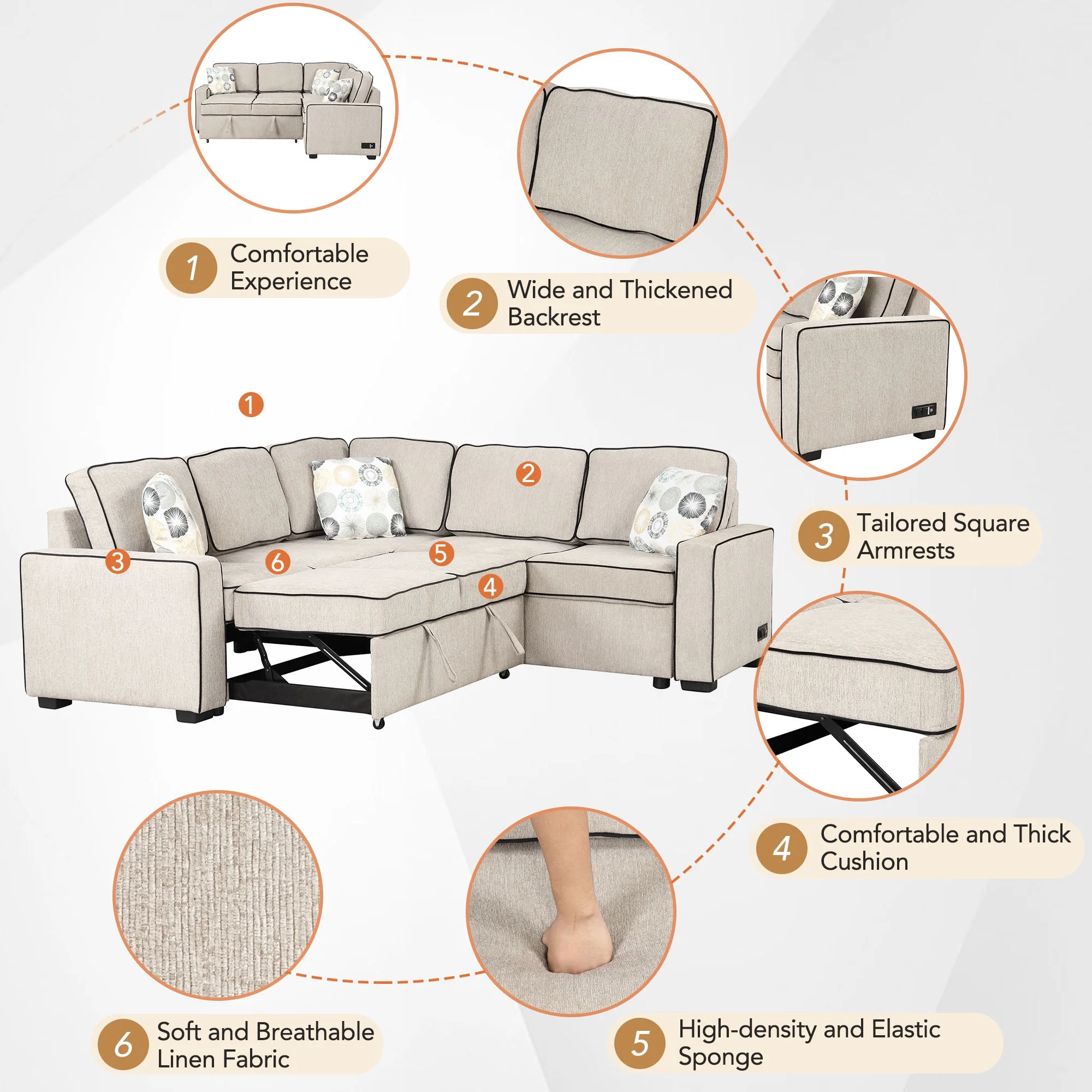 Euroco 5 Seat Pull Out Sofa Bed L-Shaped Sofa with 2 USB Ports, Sockets, Pillows, 83" Convertible Sleeper Sofa for Living Room, Bedroom, Office, Cream