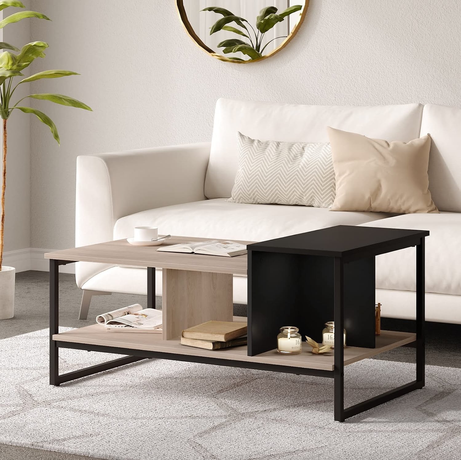 Unique Lift Top Coffee Table with 2-Level Different Heights Tabletop for Living Room Spaces, Industrial Wood Desk Coffee Table with Metal, 31.5"