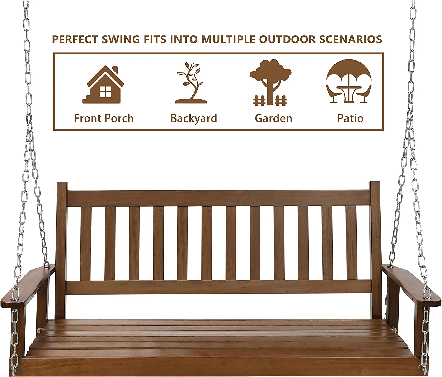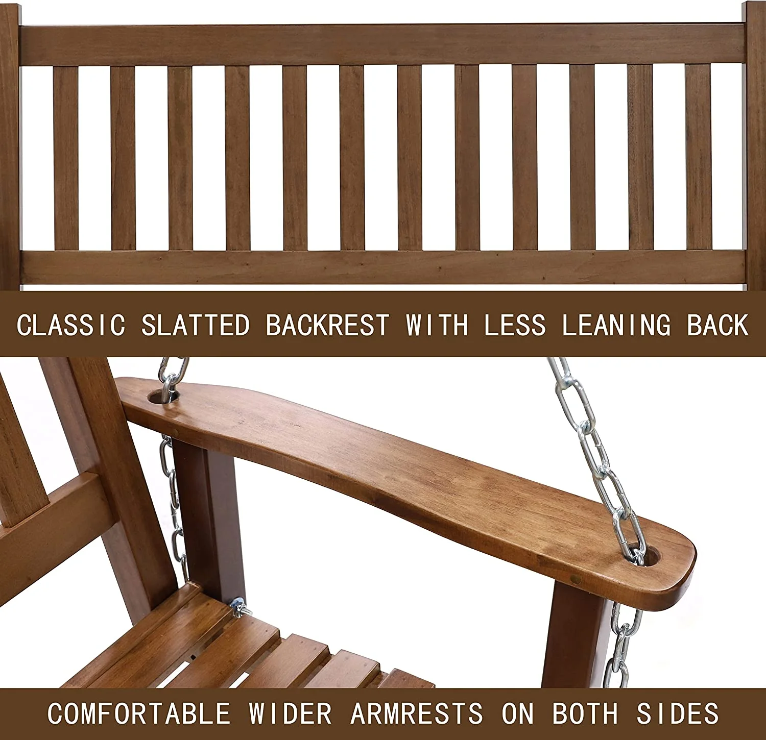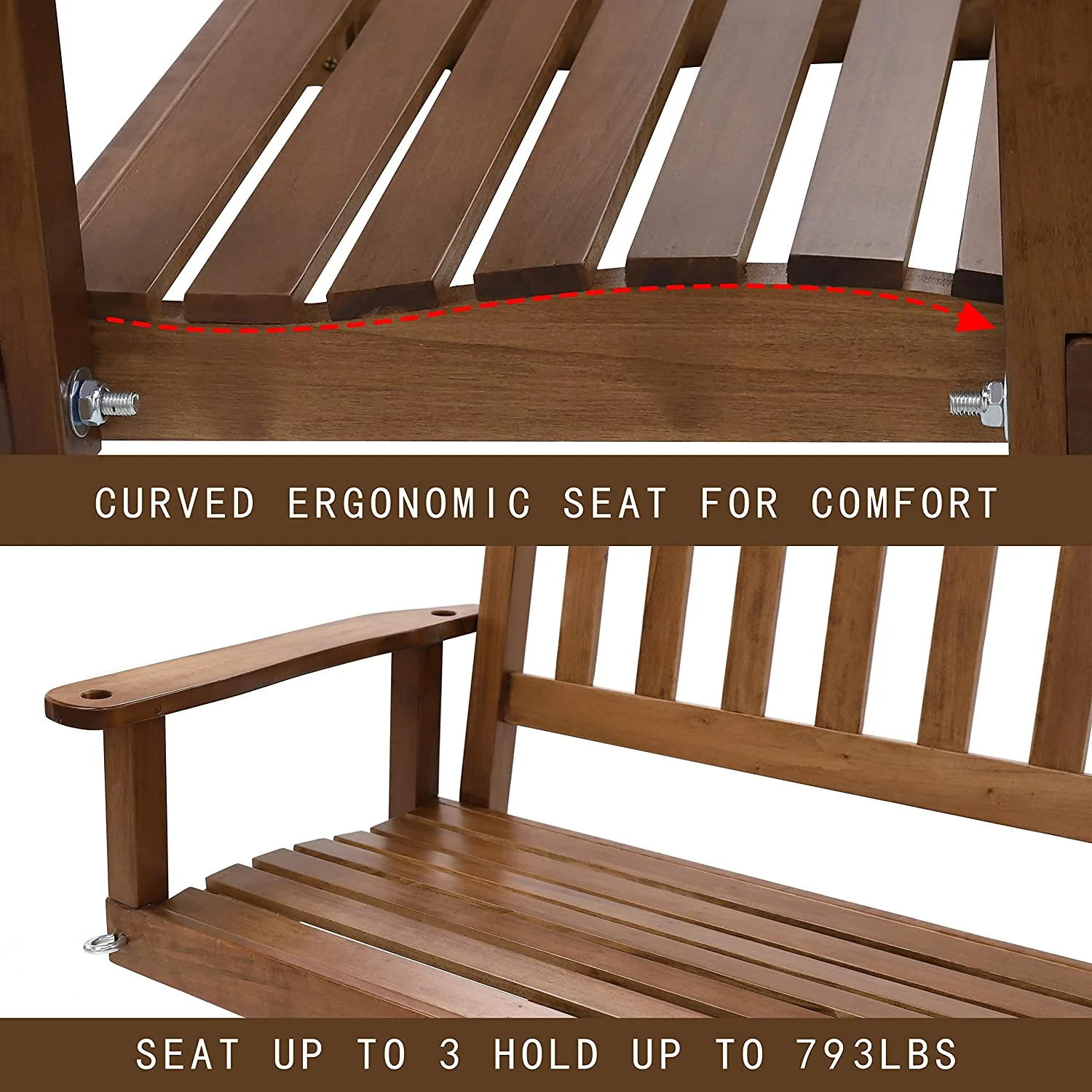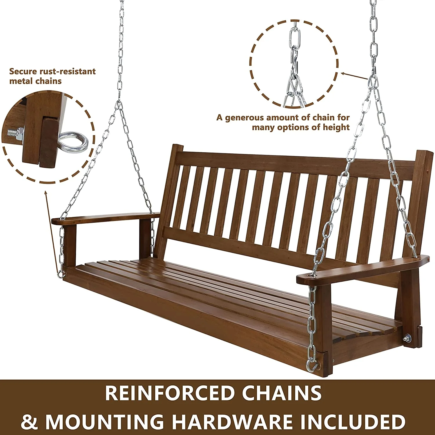 Outdoor Patio Hanging Wooden Porch Swing 5FT with Chains, 3-Person Heavy Duty Swing Bench for Garden and Backyard, Wood Brown