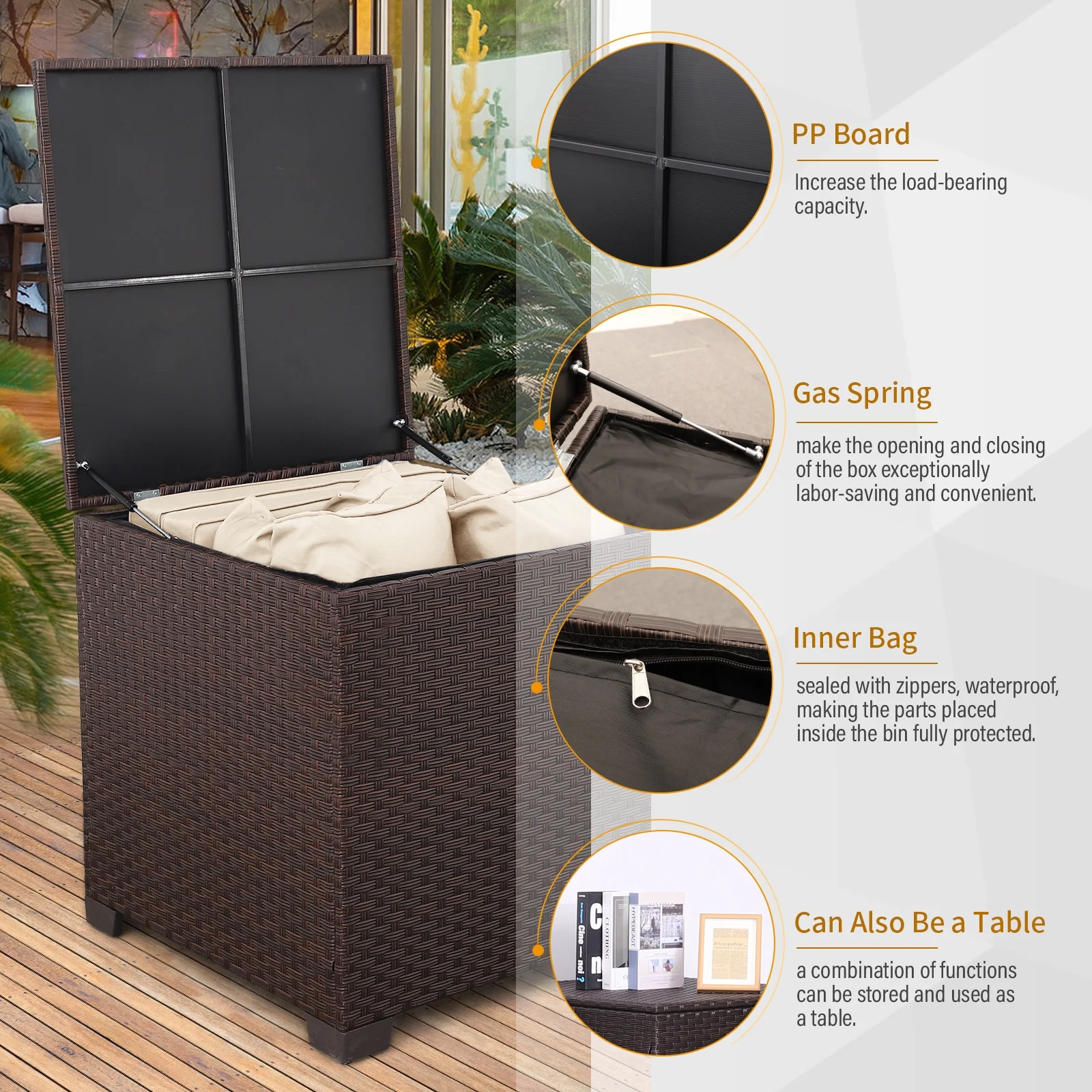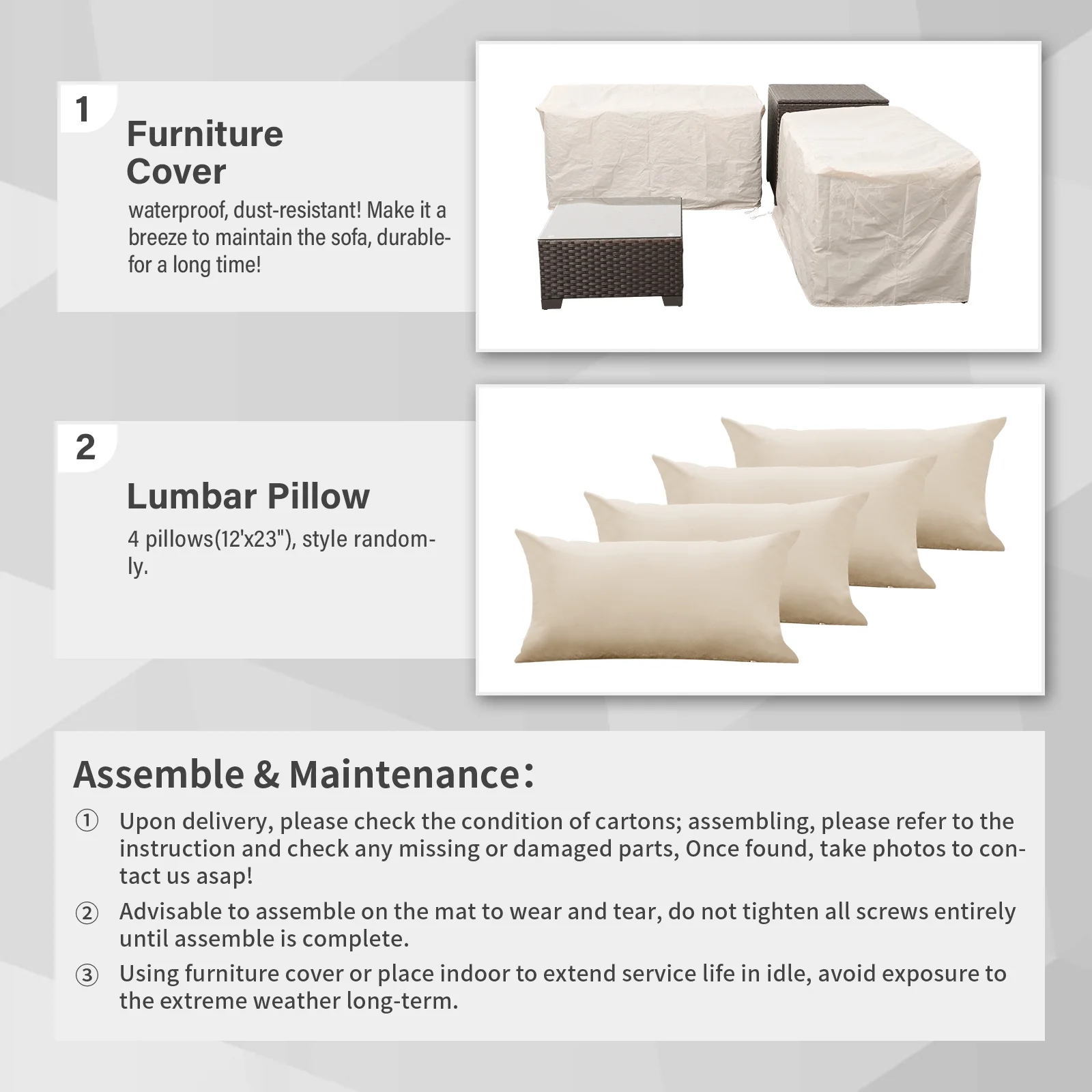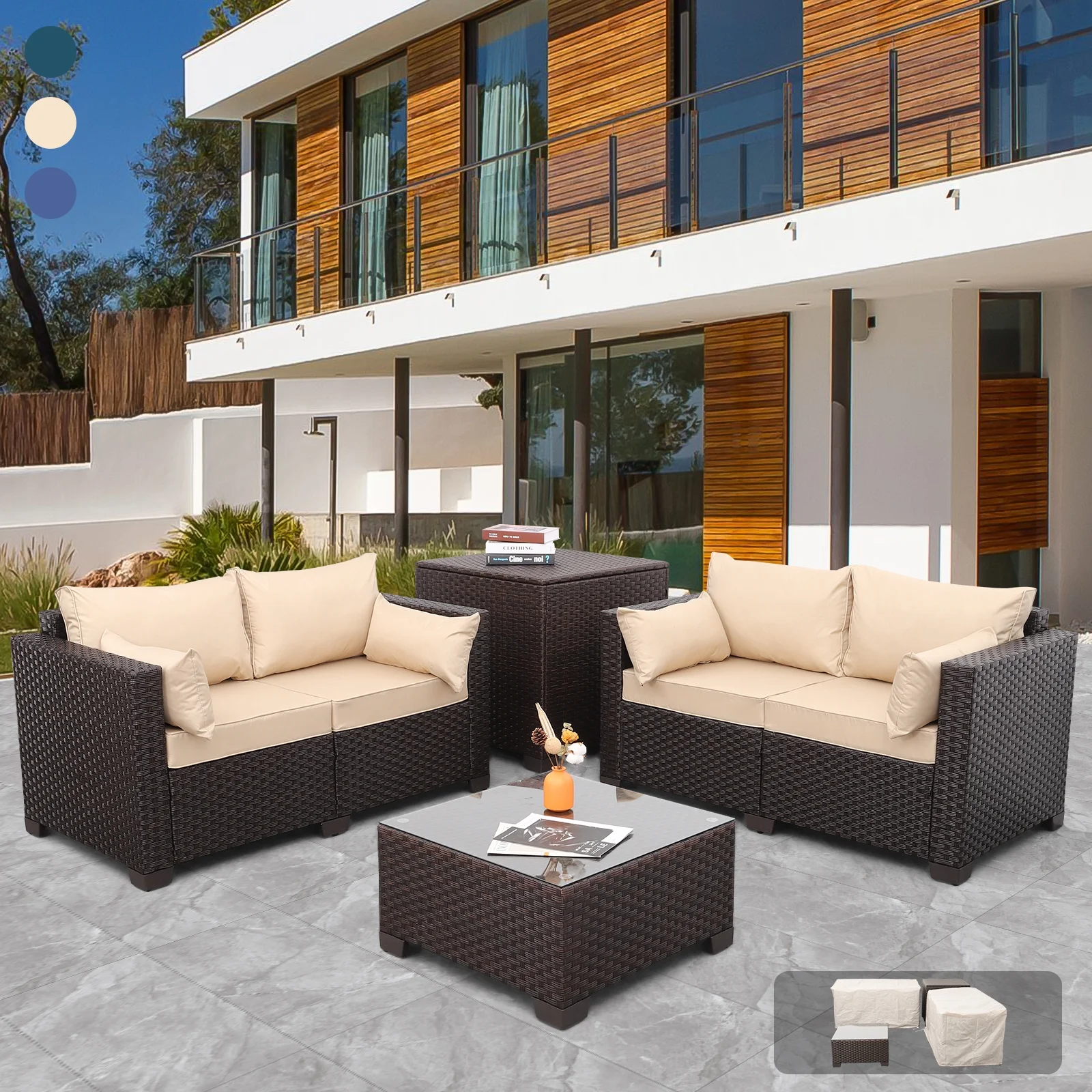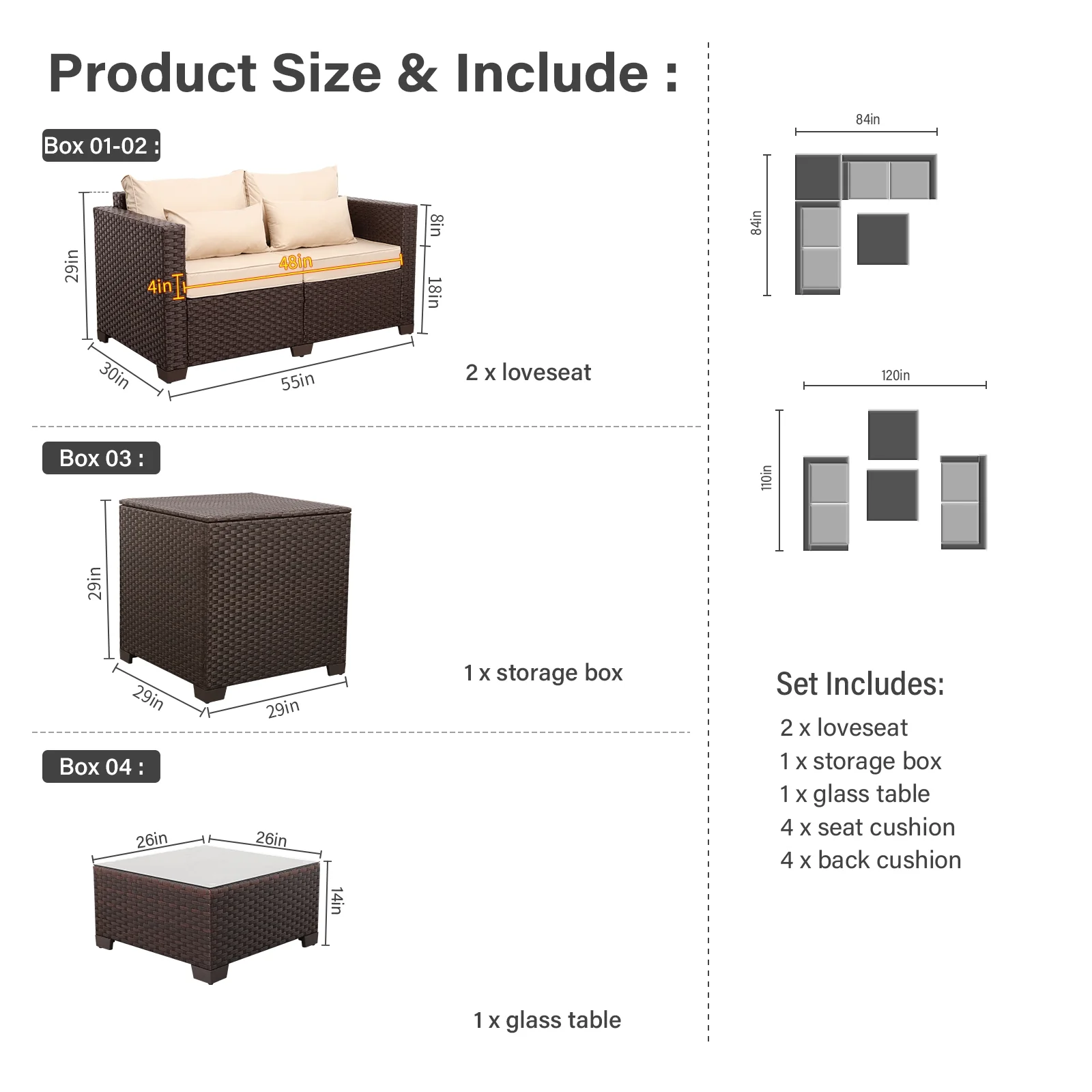 Waroom 4 Pieces Outdoor Furniture Set Patio Loveseats Sofa Set with Storage Box and Glass Coffee Table, Brown Wicker Khaki Cushions