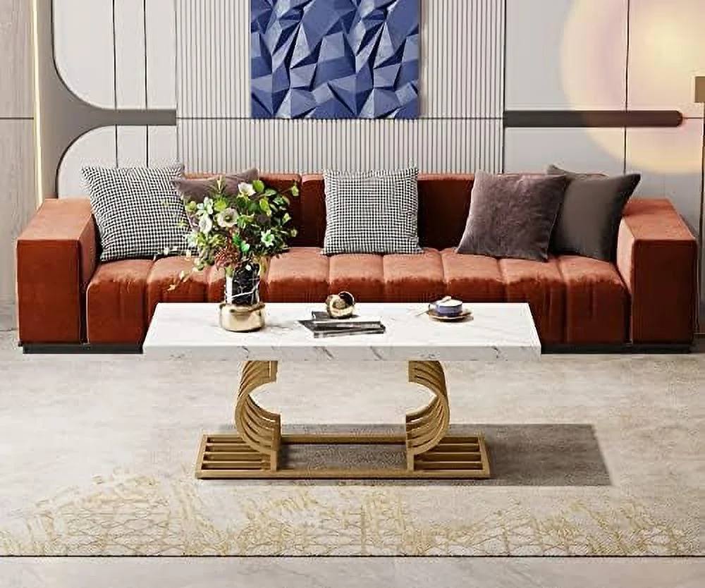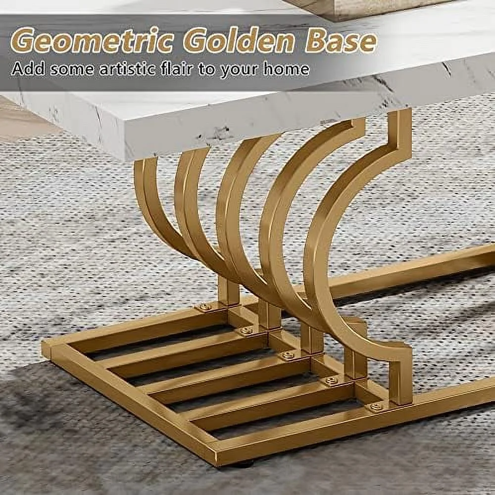 HJZBNONE Modern Coffee Table 47 Inch Faux Marble Cocktail Table with Geometric Frame Rectangular Center Table Tea Table Accent for Living Room Simple Assembly (White/Gold)